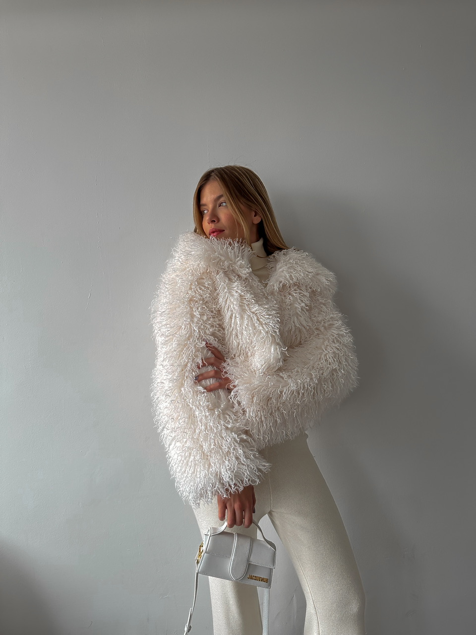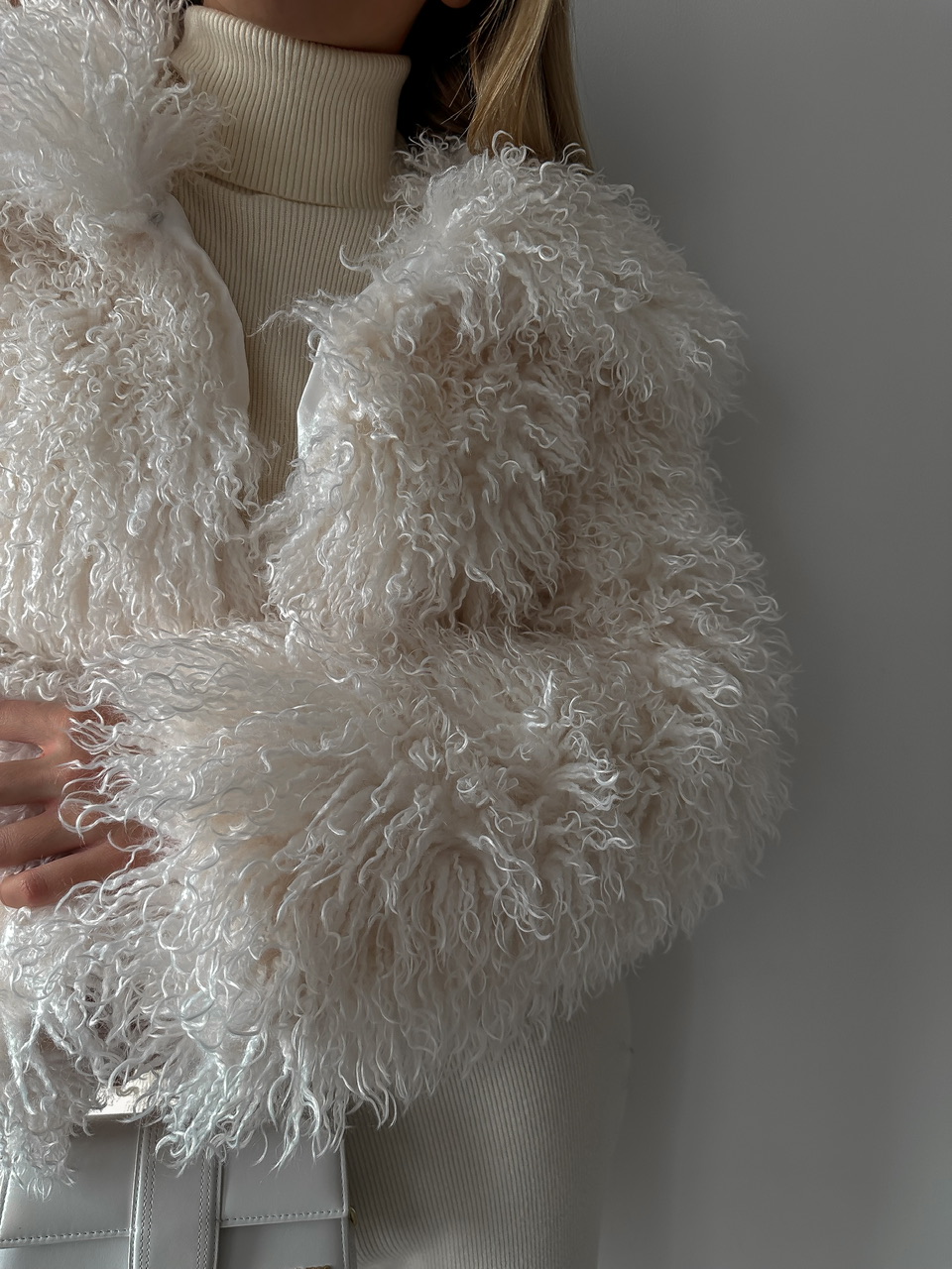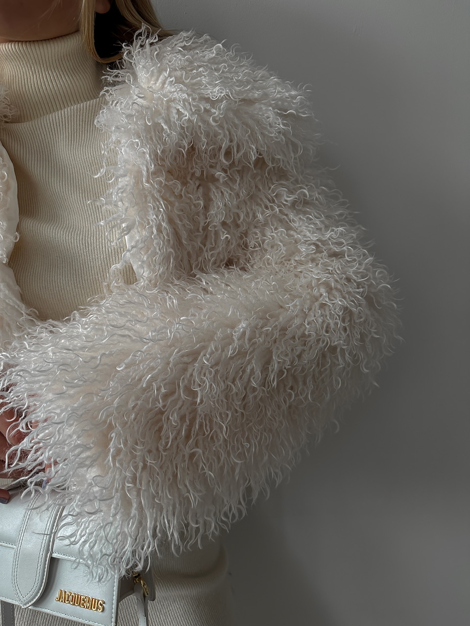 Krátky chlpatý kabát s limcom so zapínaním na háčiky.