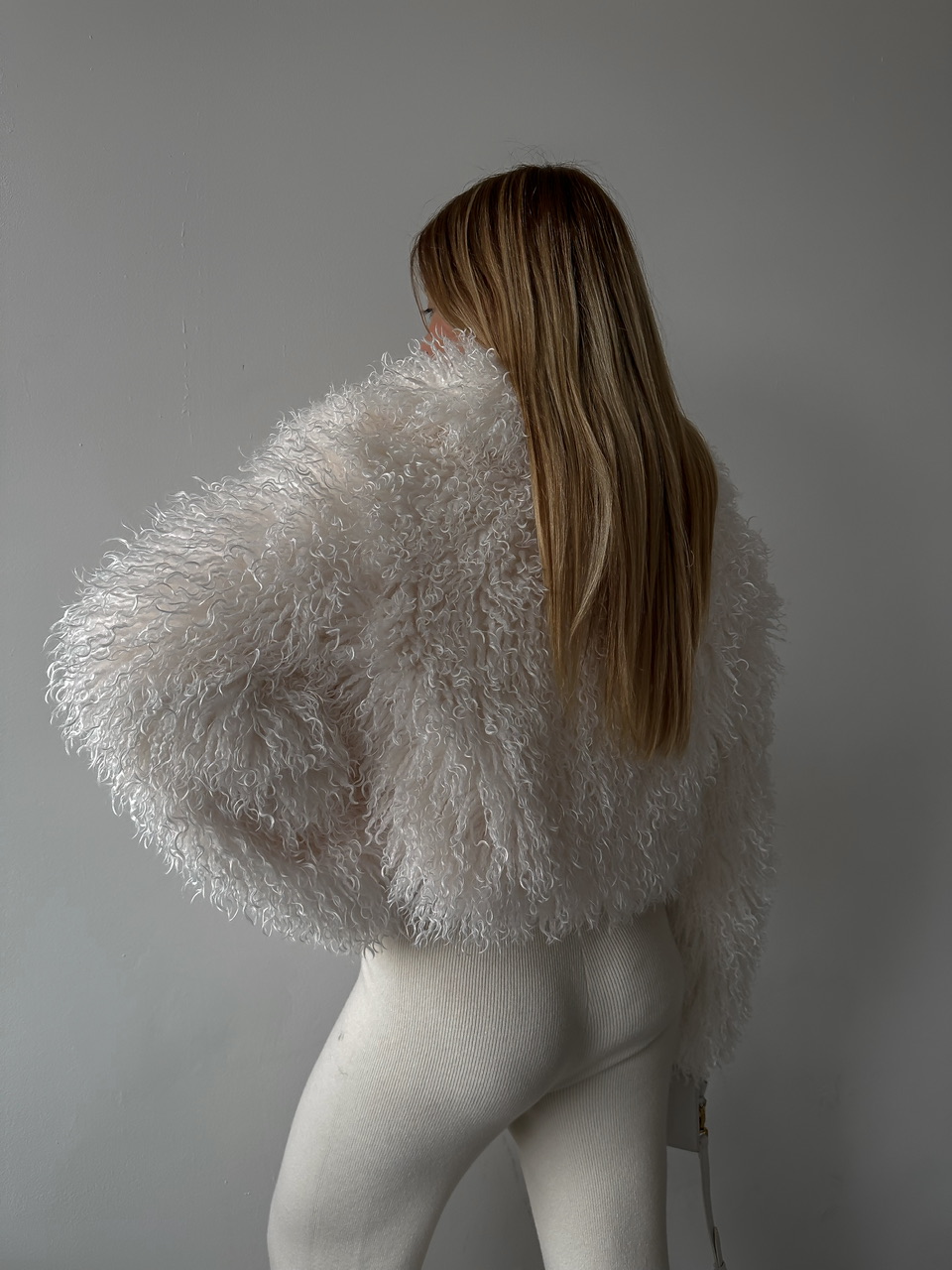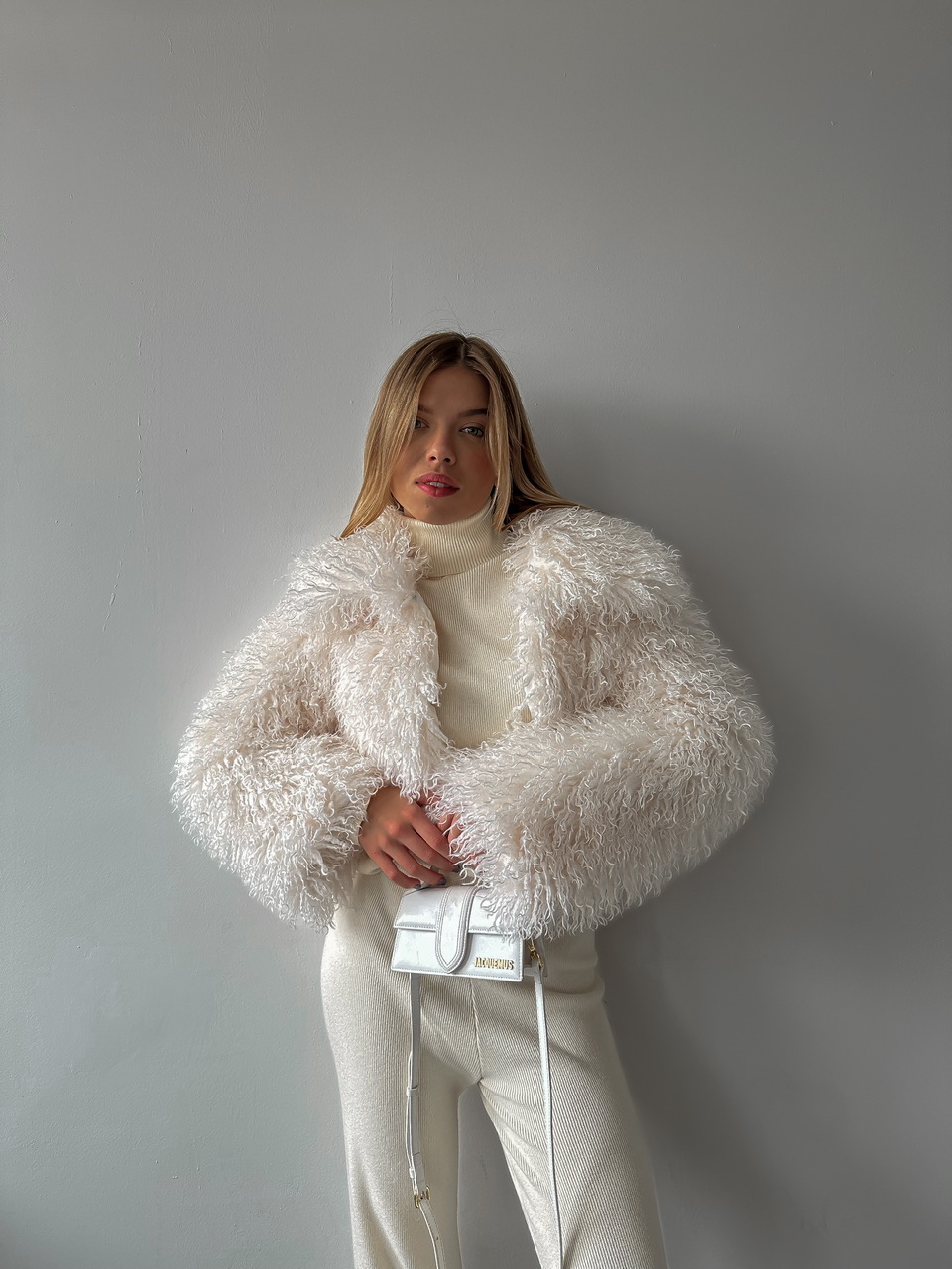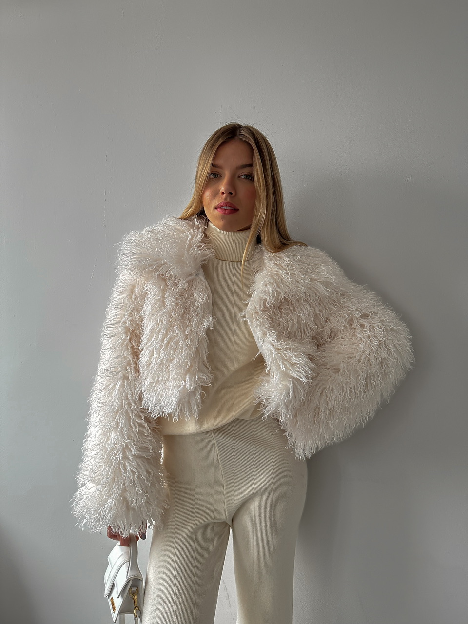 Krátky chlpatý kabát s limcom so zapínaním na háčiky.