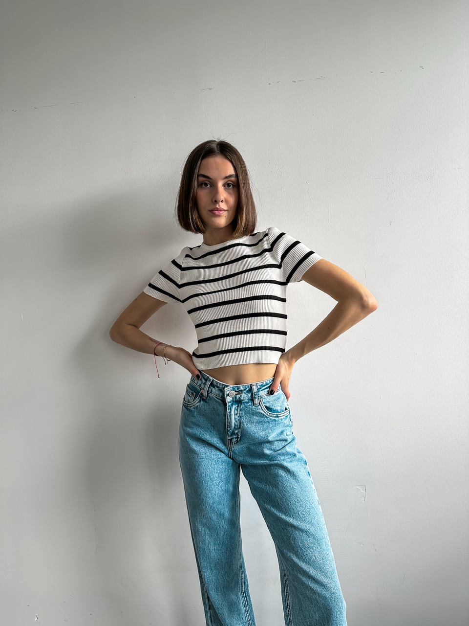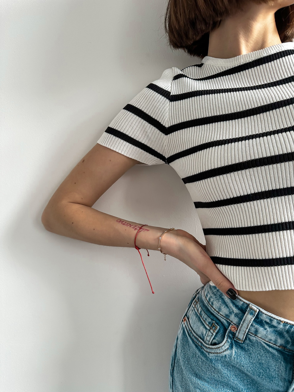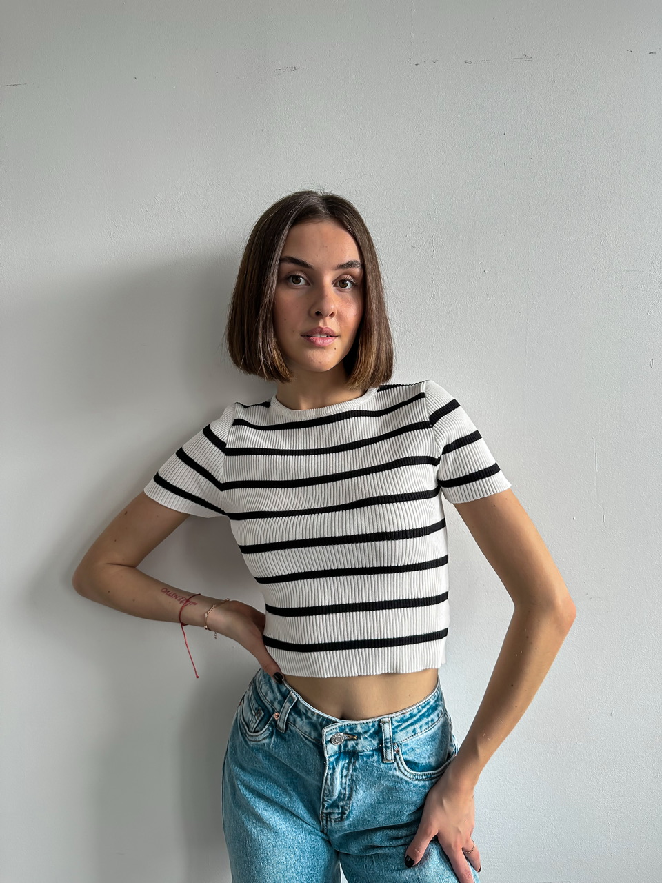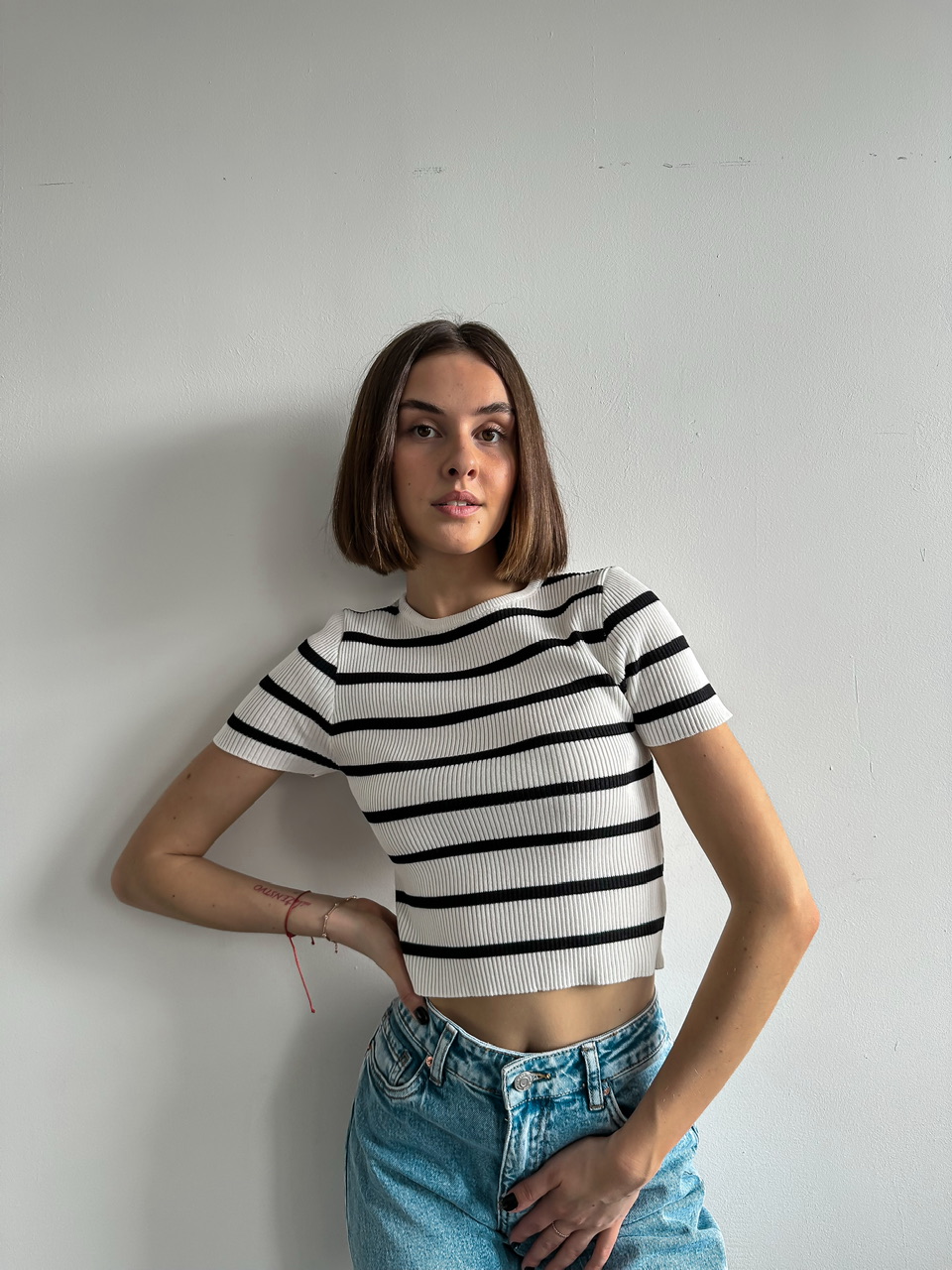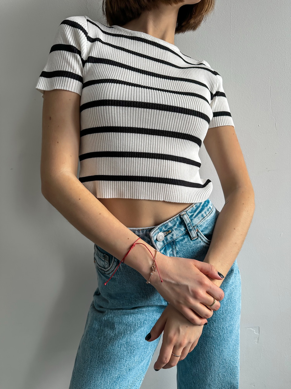 Prúžkovaný top s krátkym rukávom.