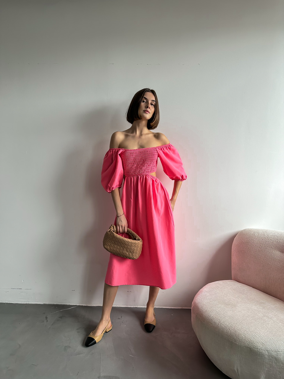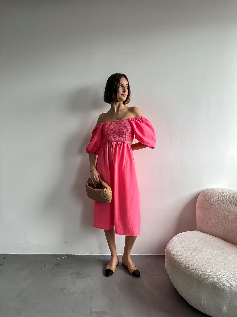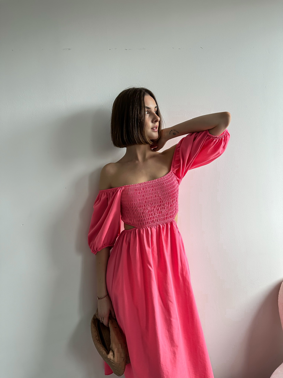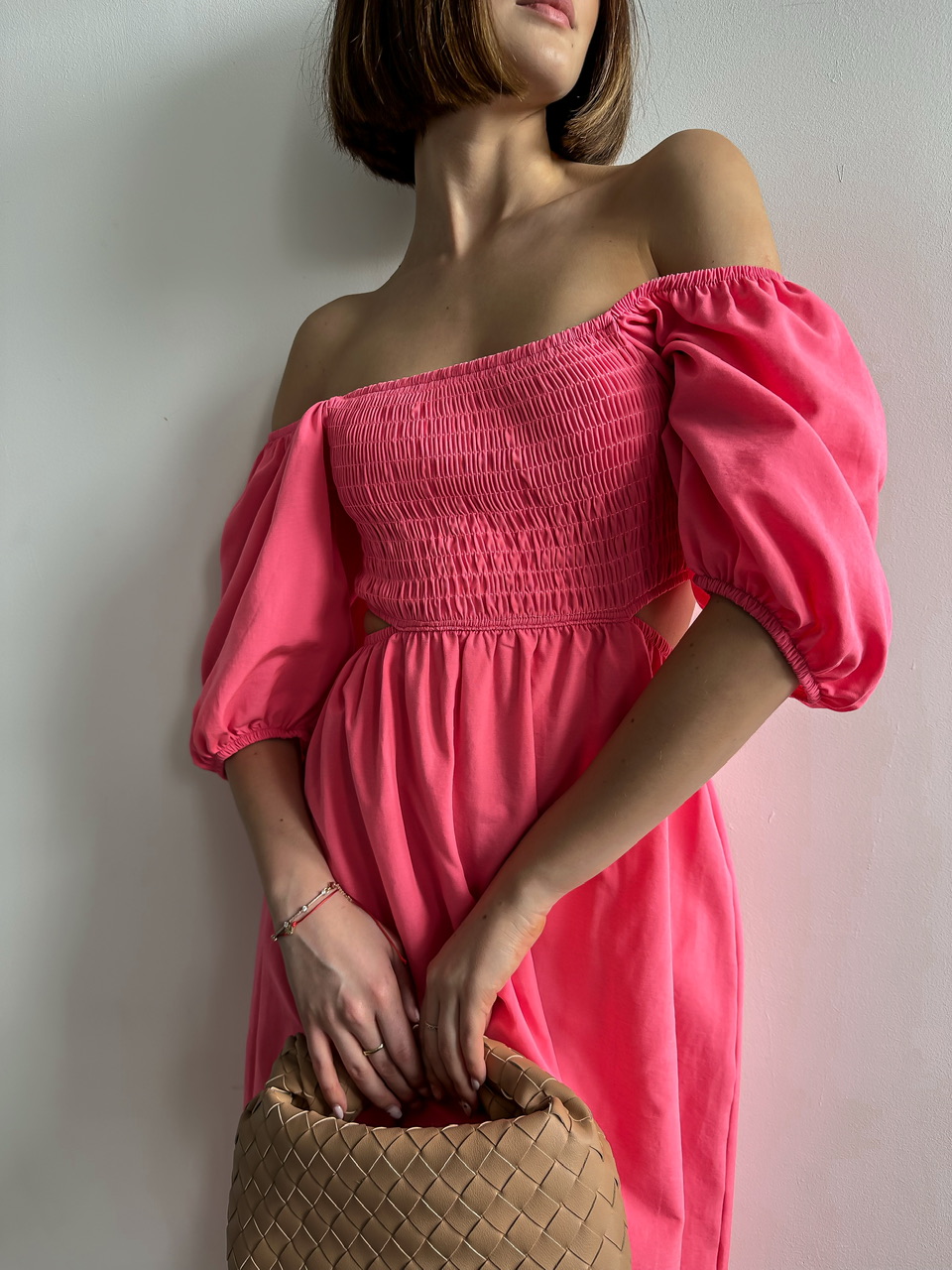 Midi šaty s krátkym rukávom a čiastočne odhaleným chrbátom.