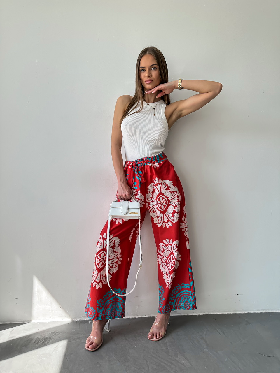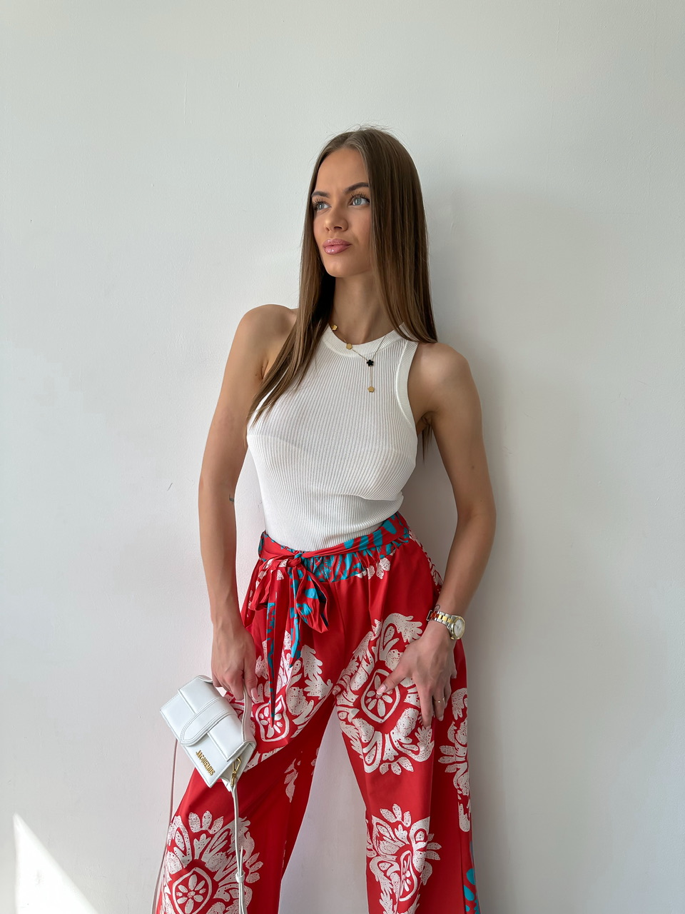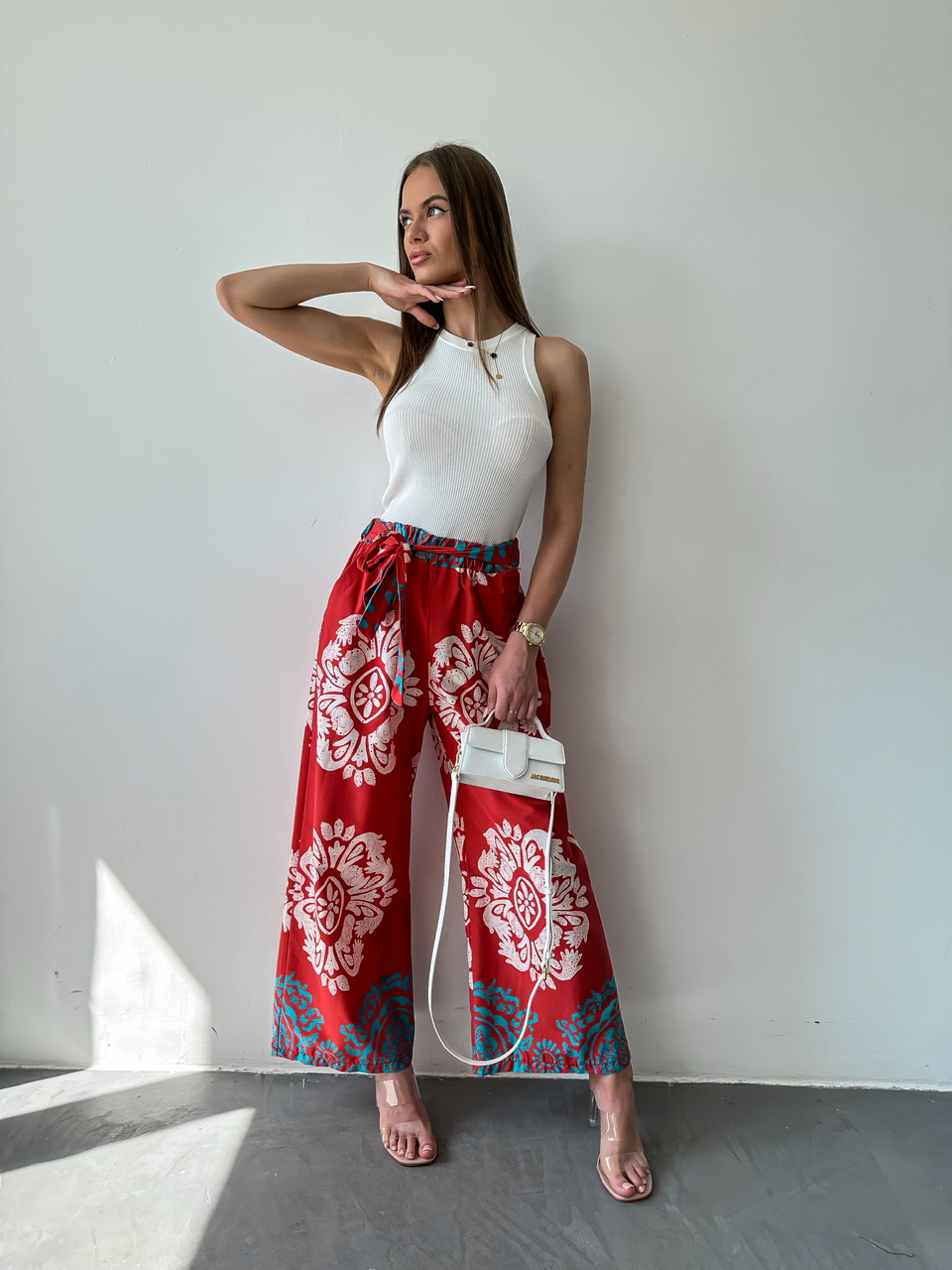Dlhé nohavice voľného strihu s pásom na gumu, skrité bočné vrecká.