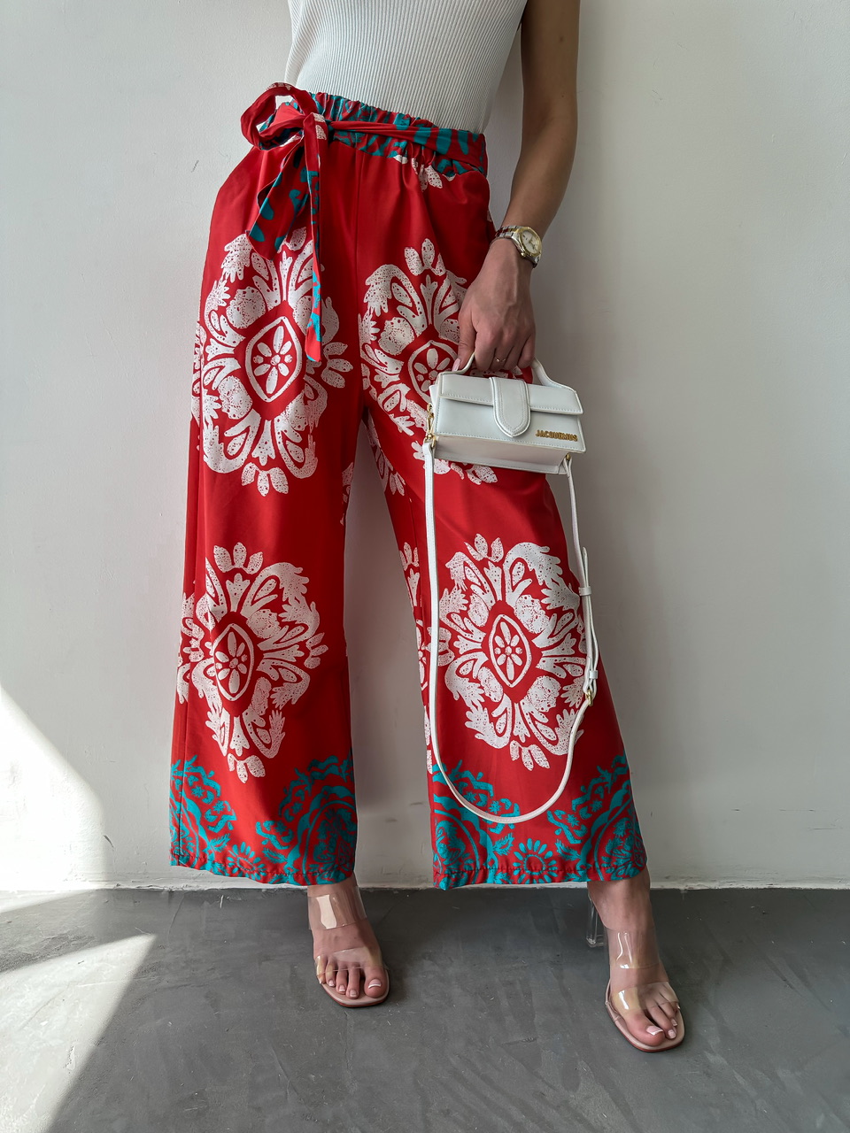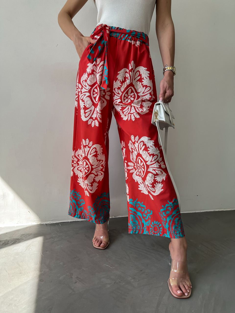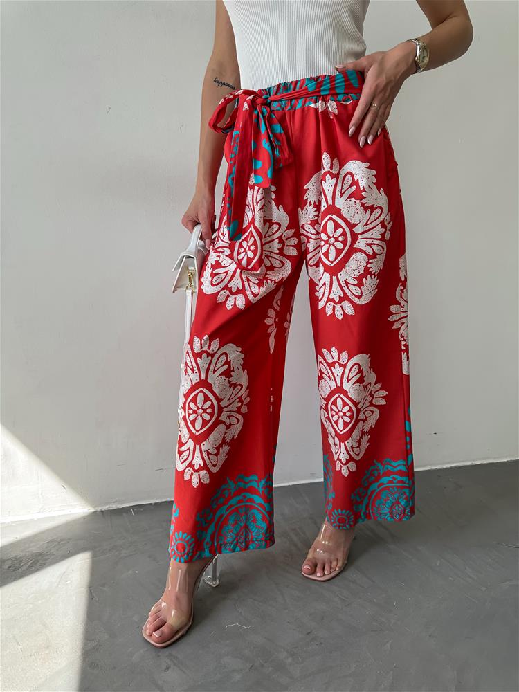 Dlhé nohavice voľného strihu s pásom na gumu, skrité bočné vrecká.