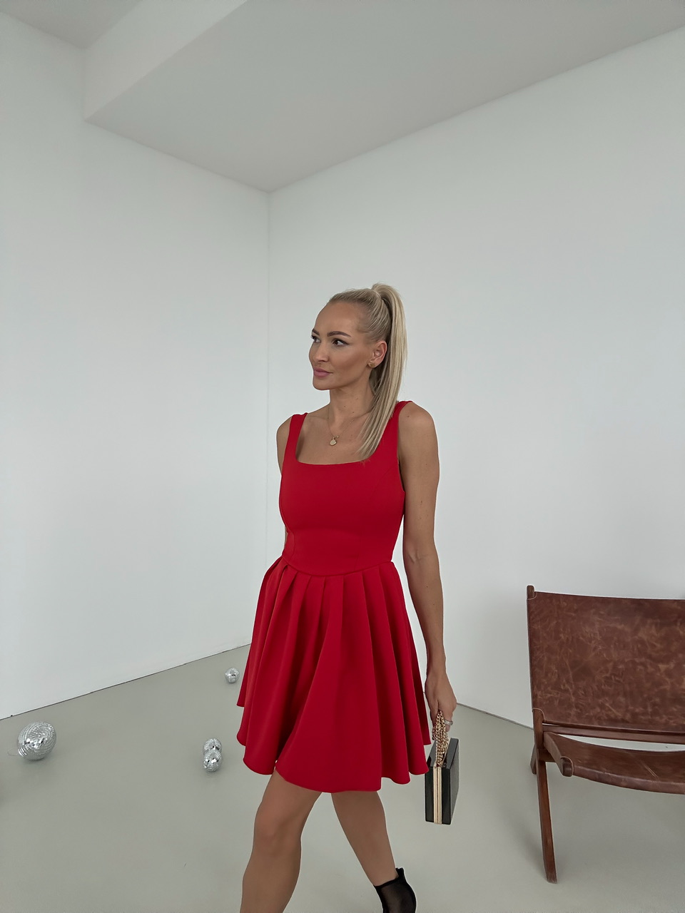 Krátke šaty na hrubšie ramienka s okrúhlym výstrihom. Zadné zapínanie na skrytý zips.