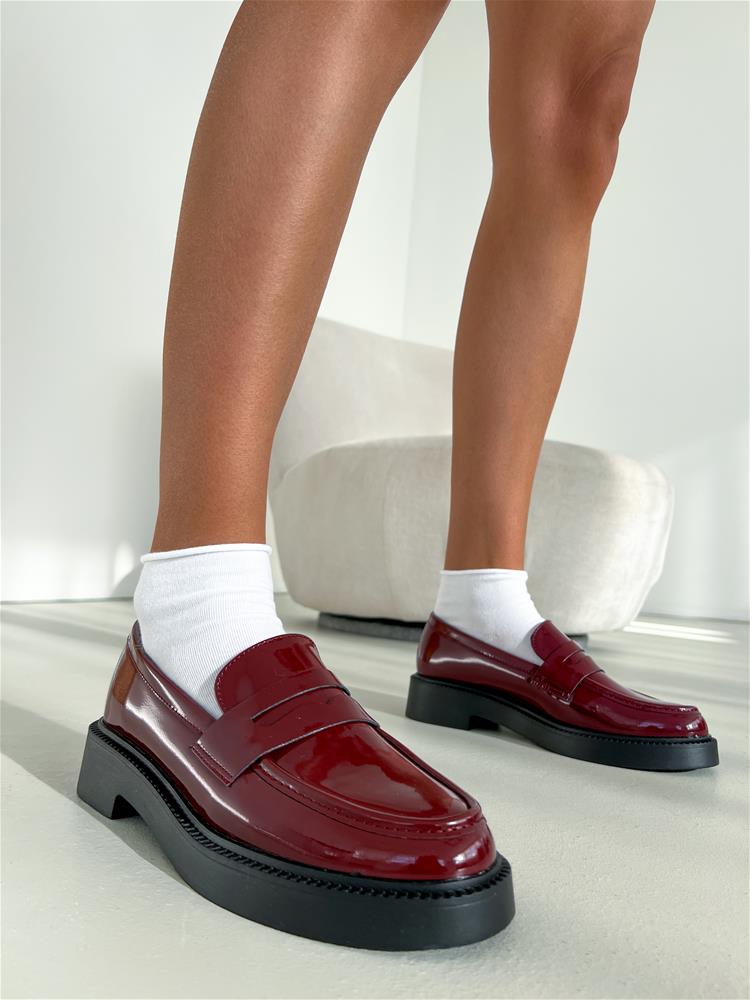 Bordové topánky na výraznej čiernej podrážke. Predná časť je zdobená prešitím. Zvršok je lesklého materiálu.
