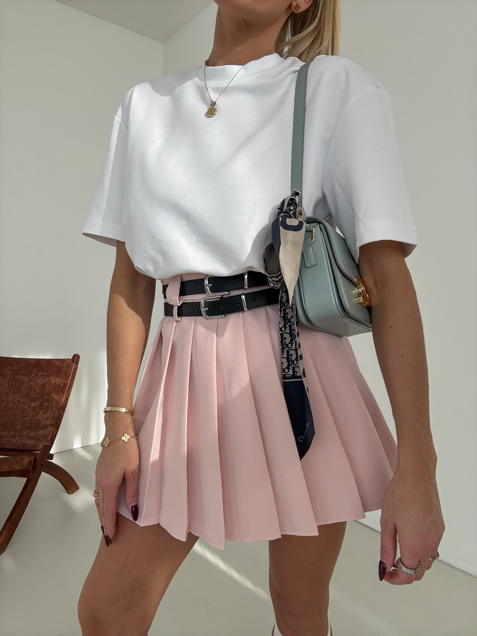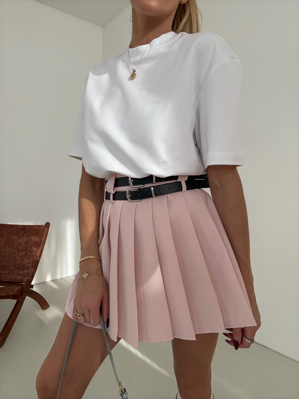 Elegantný áčkový skort. Ćistý a moderný dizajn zvýrazňuje áčkový strih, ktorý lichotí postave a dodáva jemný, ženský šmrnc. Súčasťou sú dva nastaviteľné opasky na prednej strane nielen zvýrazňujú pás, ale zároveň pridávajú štýlový detail. Skort má bočné zapínanie na zips, ktoré zabezpečuje pohodlné obliekanie a hladký povrch bez rušivých prvkov.