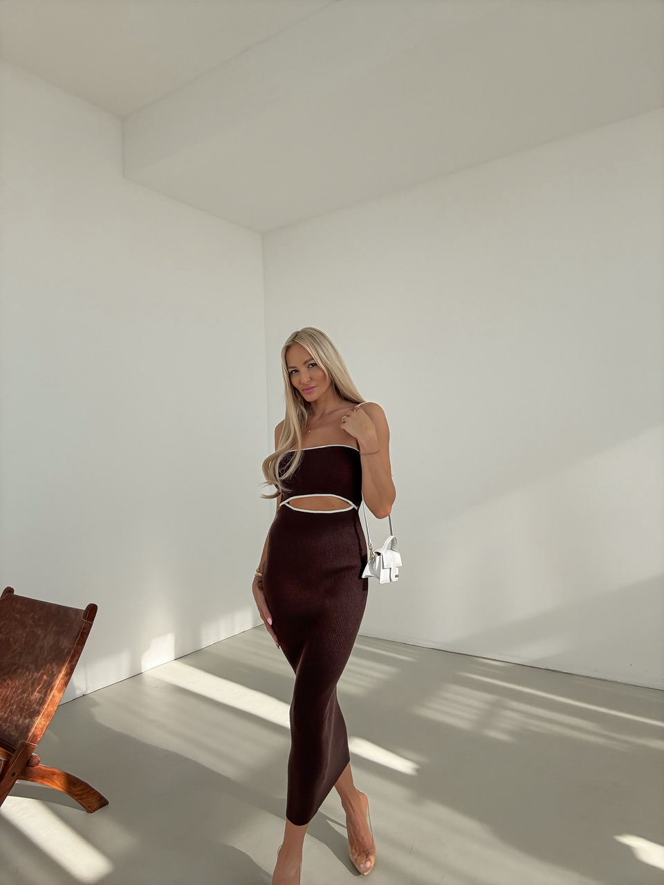 Midi šaty s priliehavým strihom krásne zvýrazní postavu, zatiaľ čo asymetrický vykrojený detail dodáva moderný a originálny nádych. Bezrukávový dizajn zaručuje nadčasovú eleganciu.