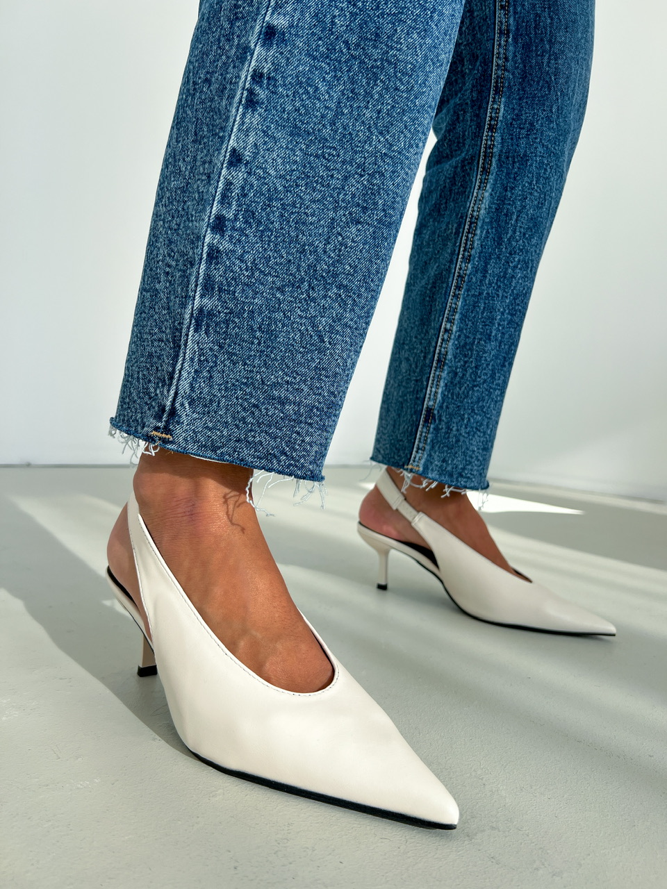 Vysoké topánky na tenkom podpätku (cca 7 cm). Zadná časť päty je otvorená.