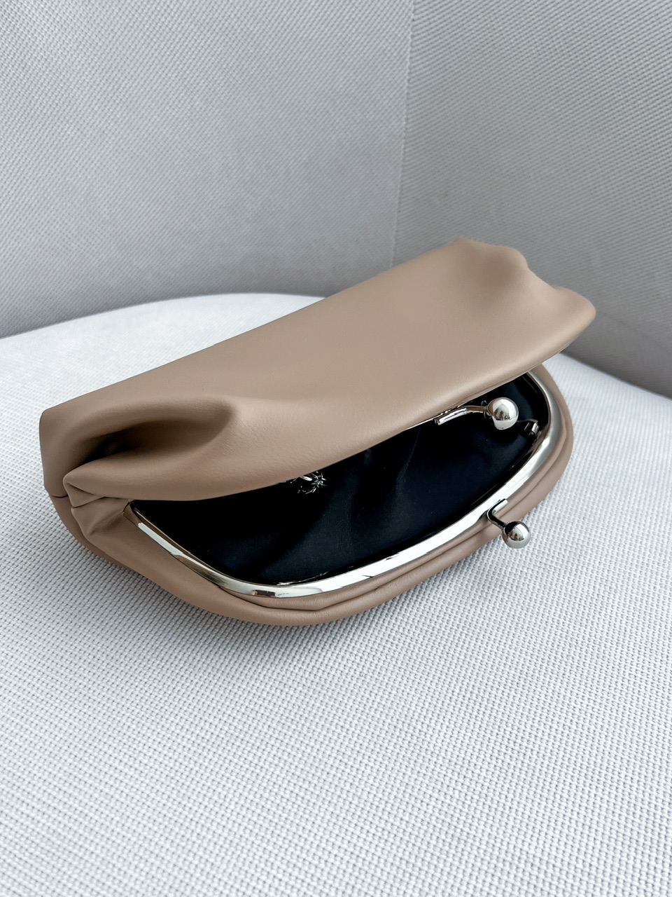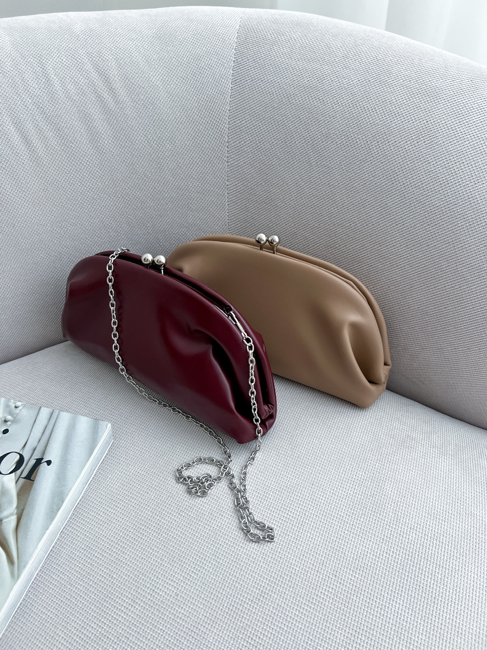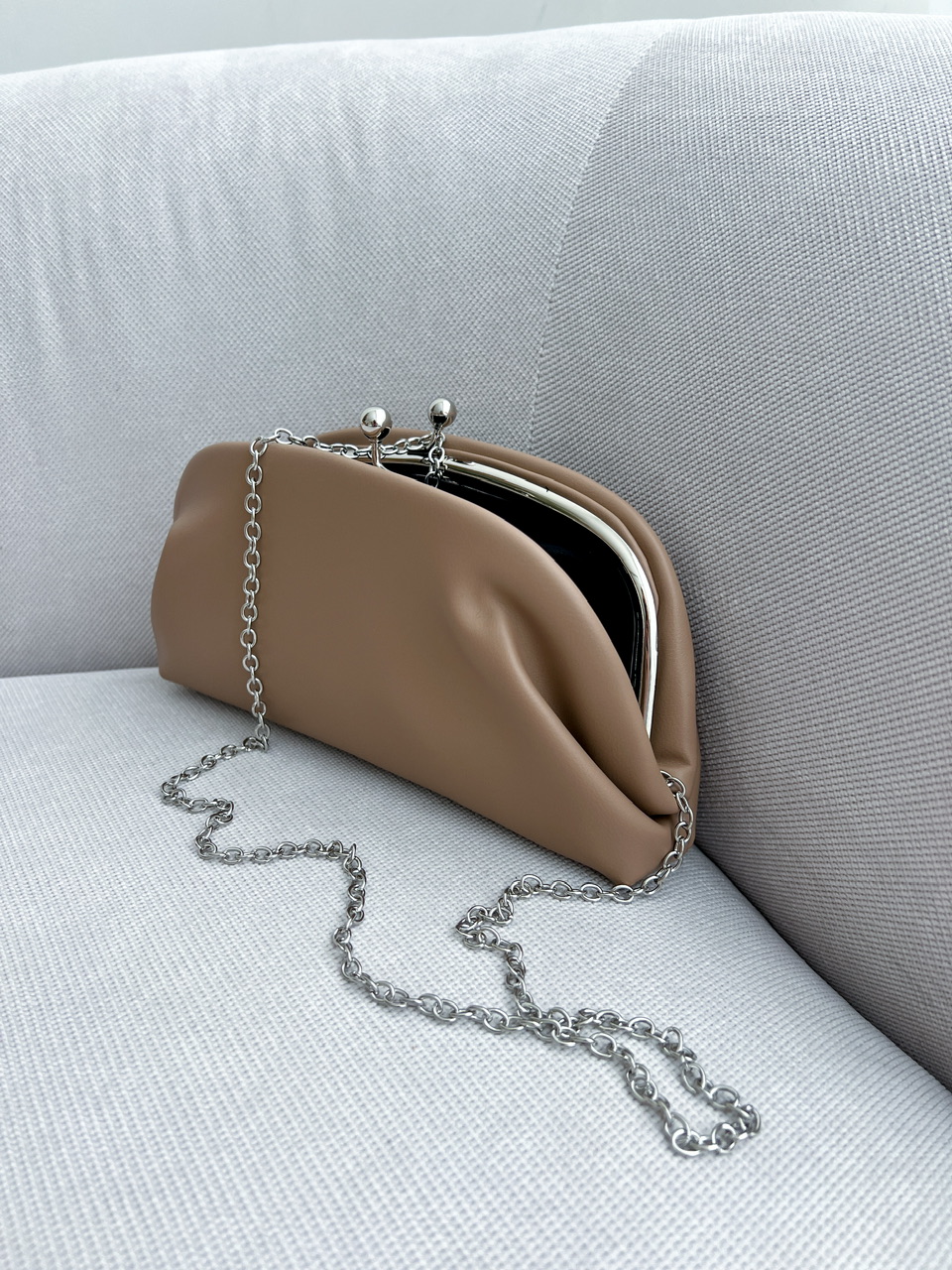 Malá elegantná kabelka do ruky. Vrchná časť otvárania je v striebornom kovovom prevedení. Vnútorná časť je podšitá a obsahuje jedno malé bočné vrecko. Kabeľka obsahuje aj striebornú retiazku cez plece.