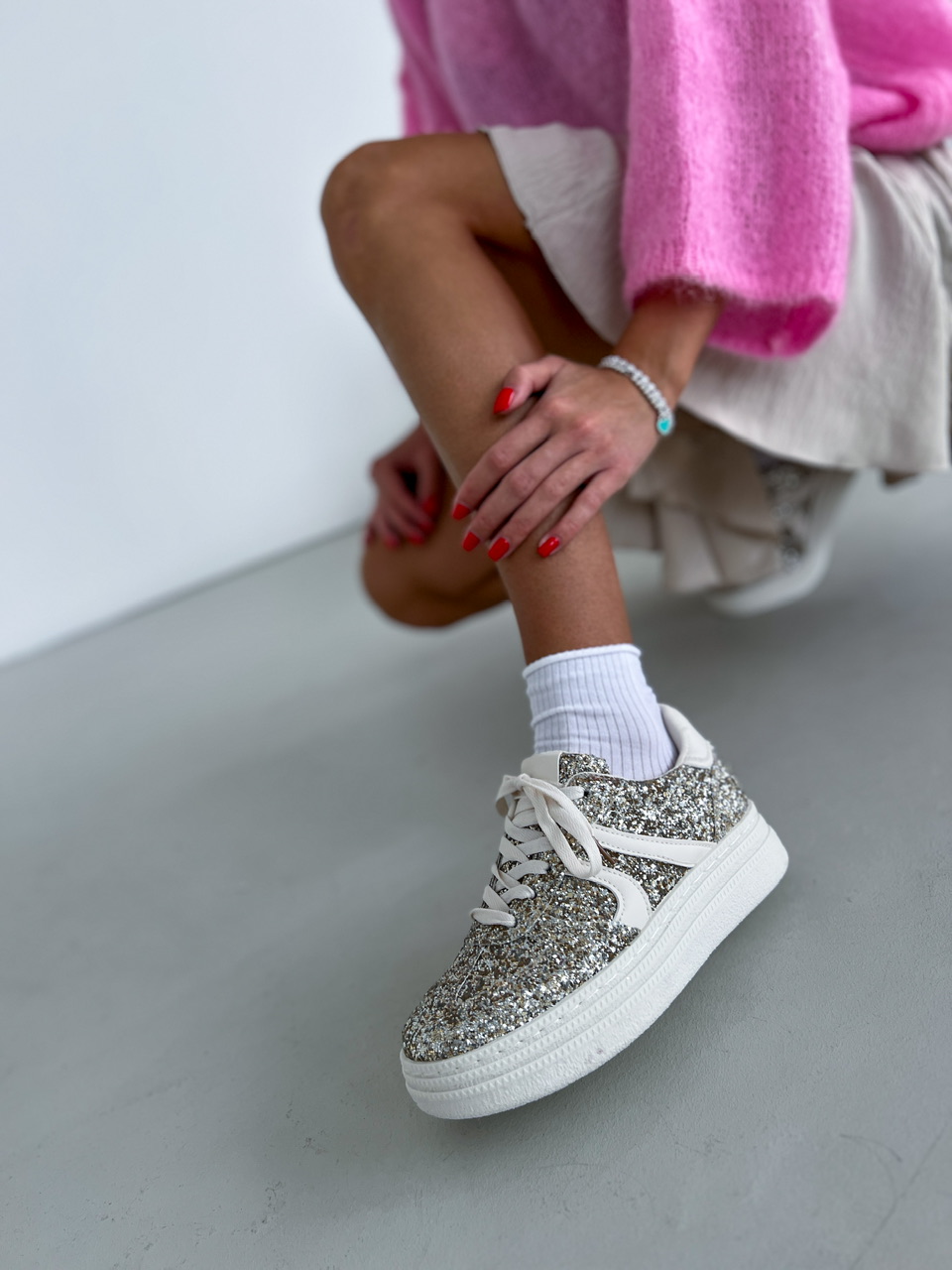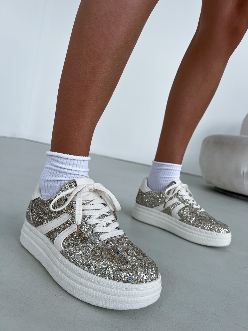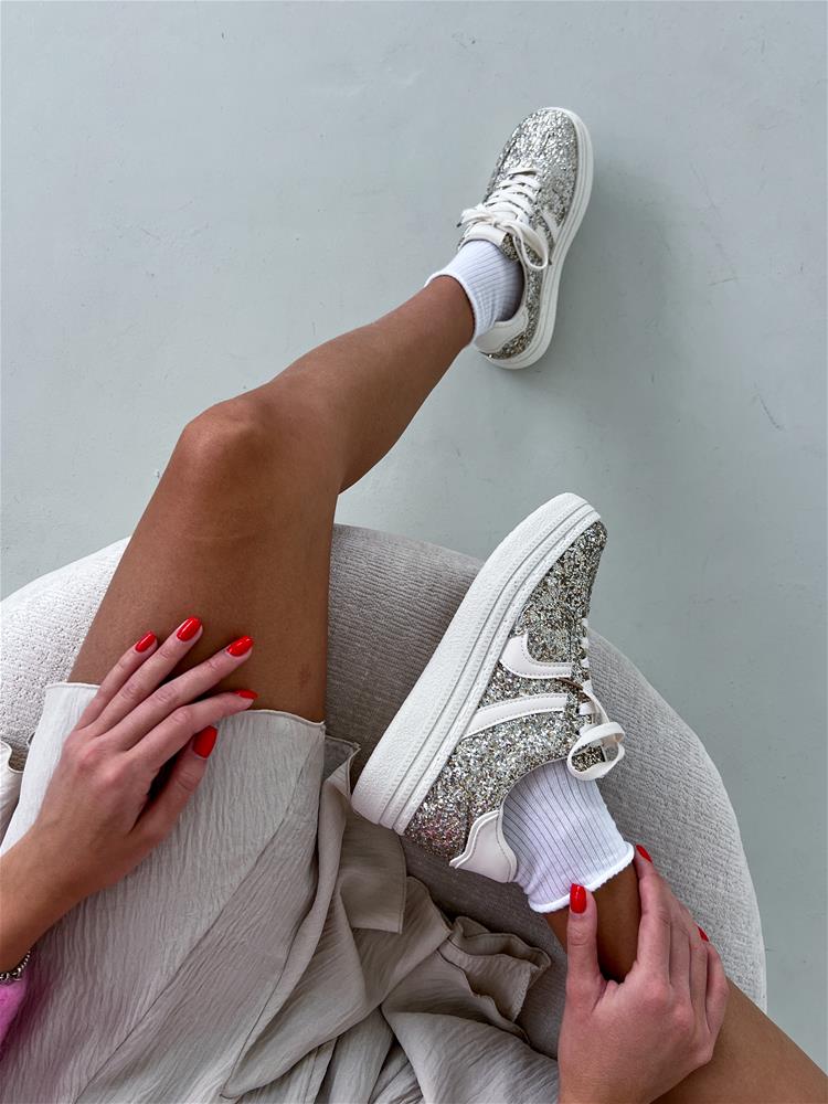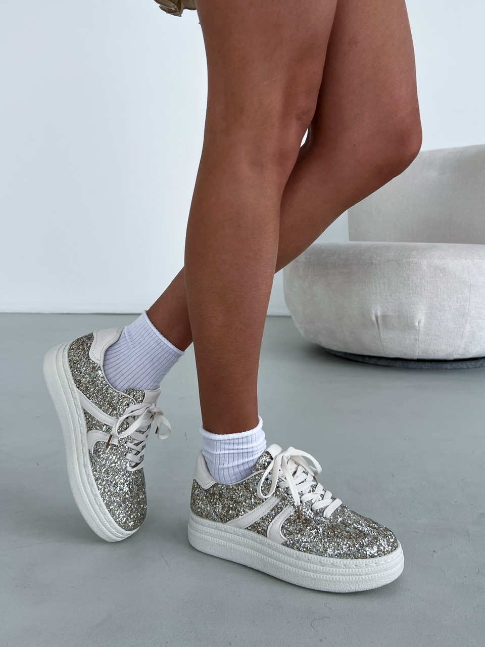 Športová obuv na rovnej mierne vyvýšenej podrážke v bielej farbe (cca 3,5 cm). Zvršok je zdobený z viacerých materiálov a ozdobných prvkov. Predná časť je na šnurovanie.