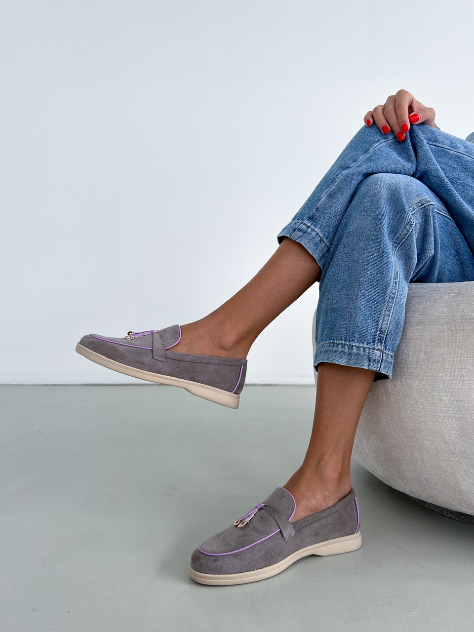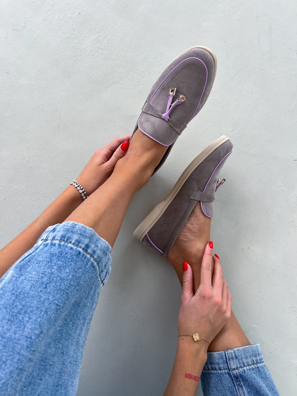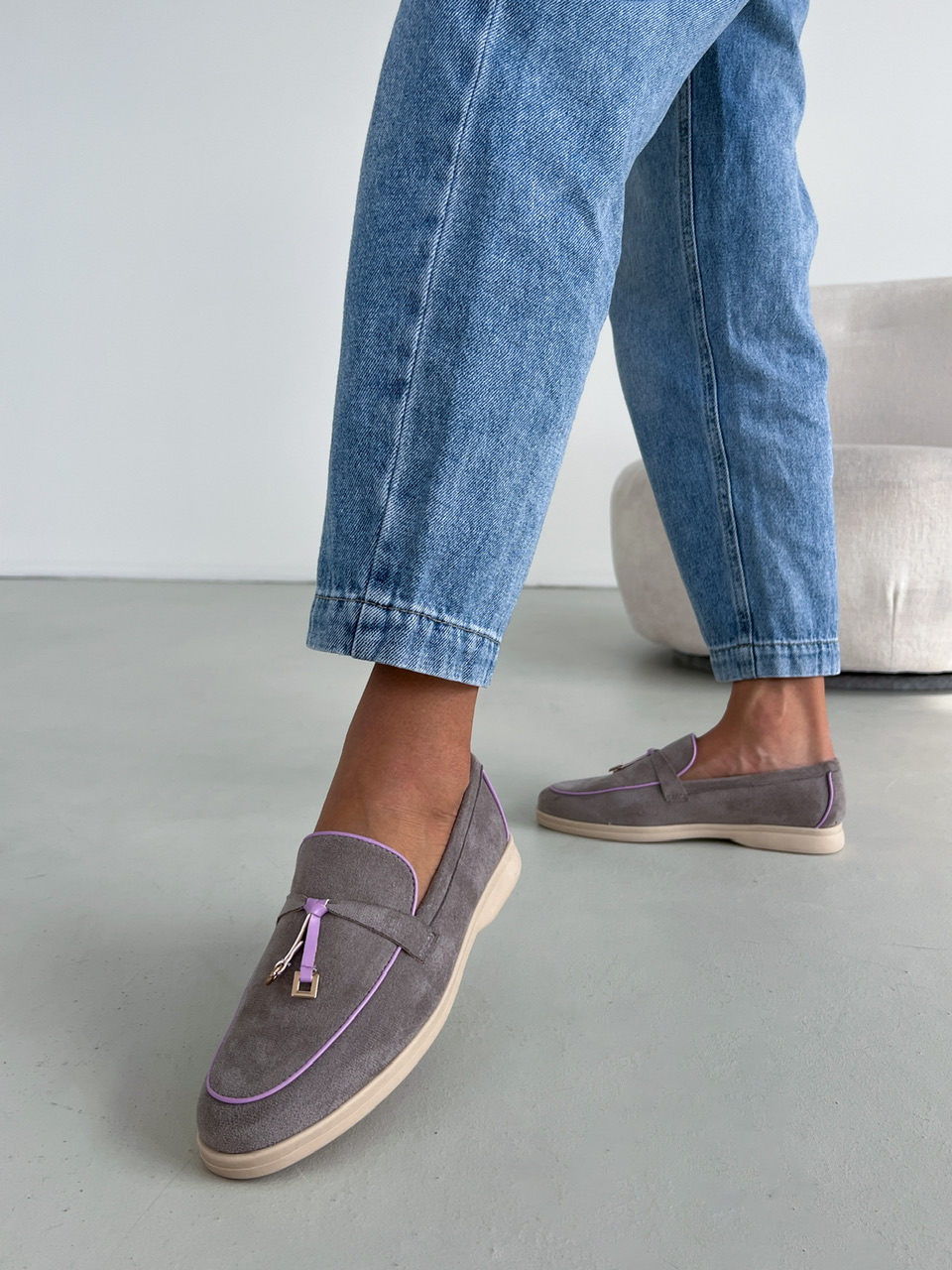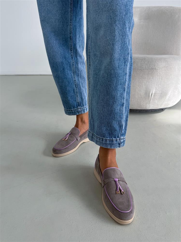 Šedé topánky na nízkej podrážke. Zvršok je semišového materiálu. Vrchná časť je zdobená fialovým lemovaním a zlatými aplikáciami.