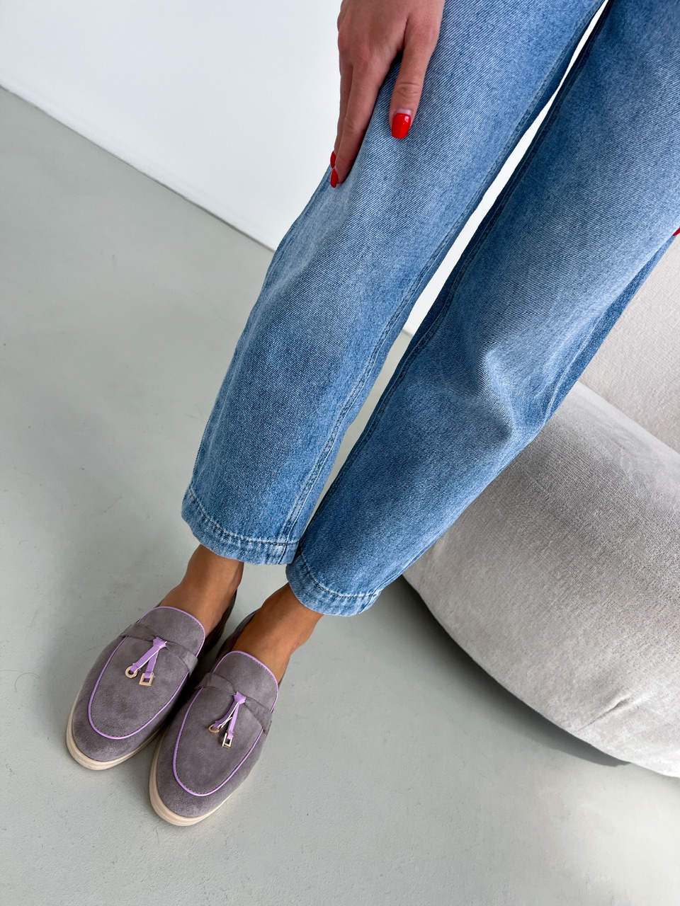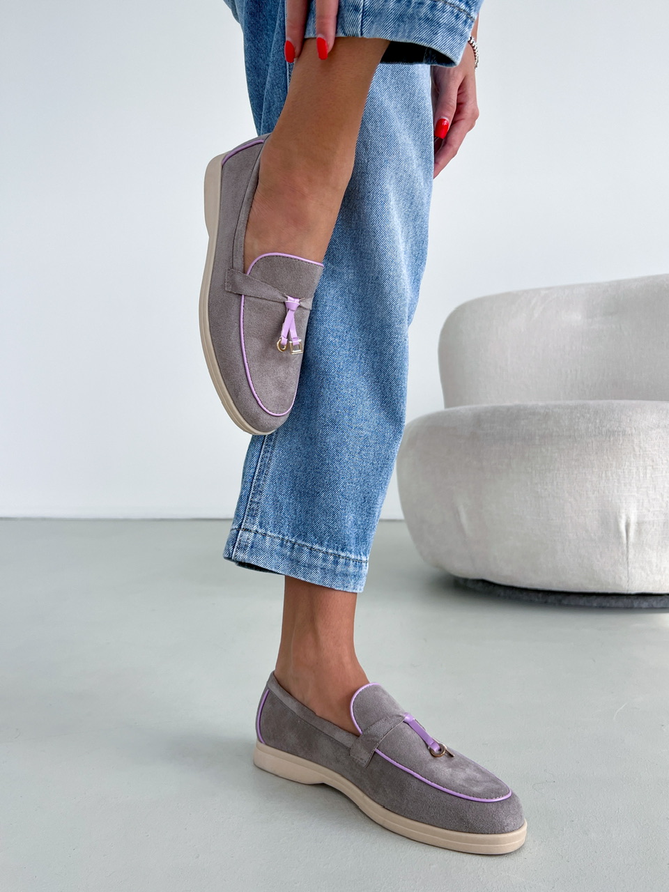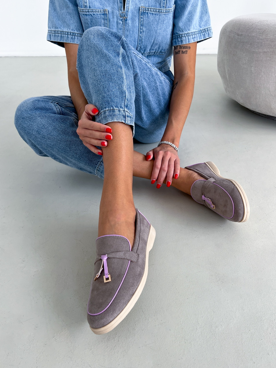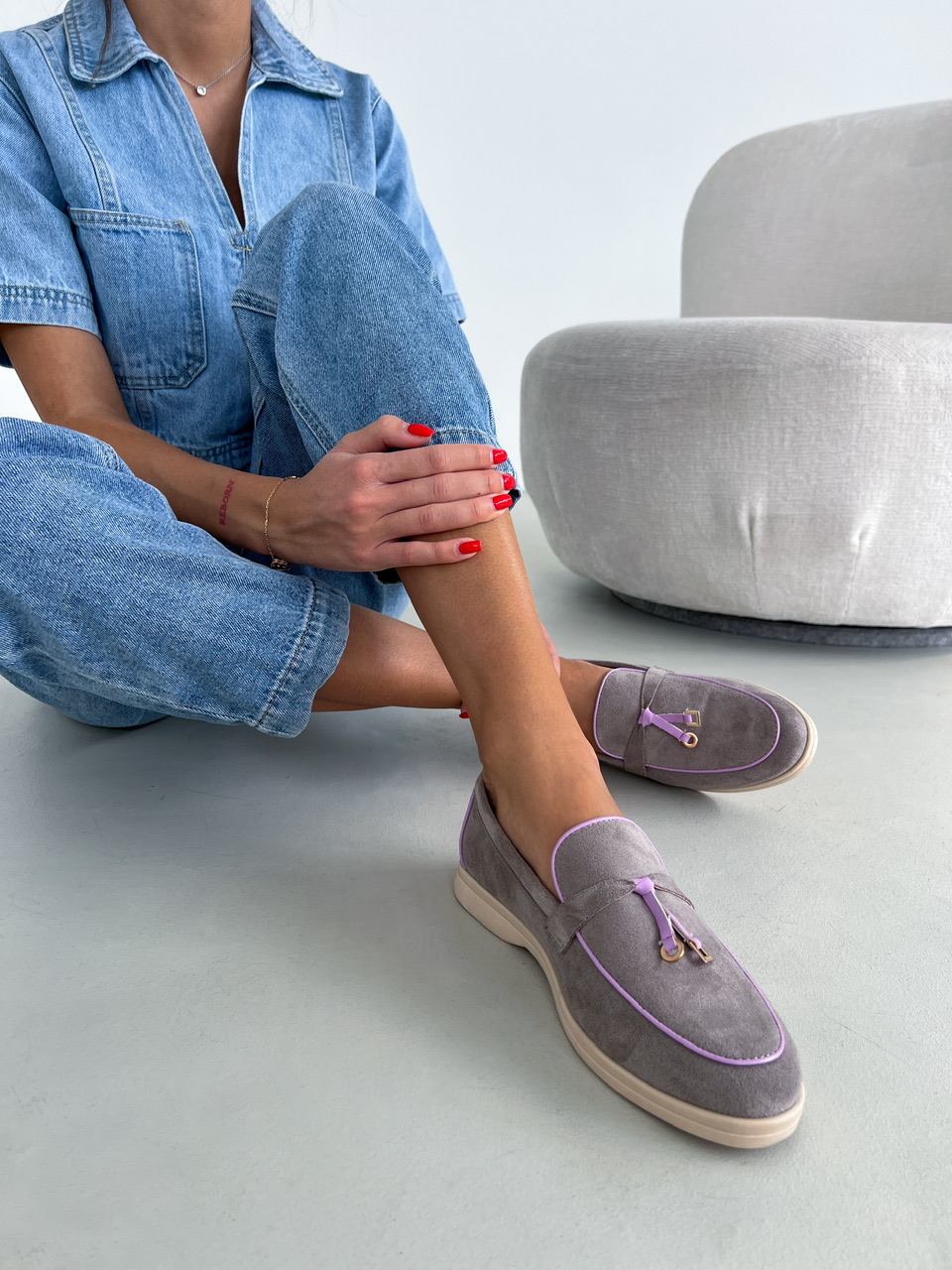 Šedé topánky na nízkej podrážke. Zvršok je semišového materiálu. Vrchná časť je zdobená fialovým lemovaním a zlatými aplikáciami.