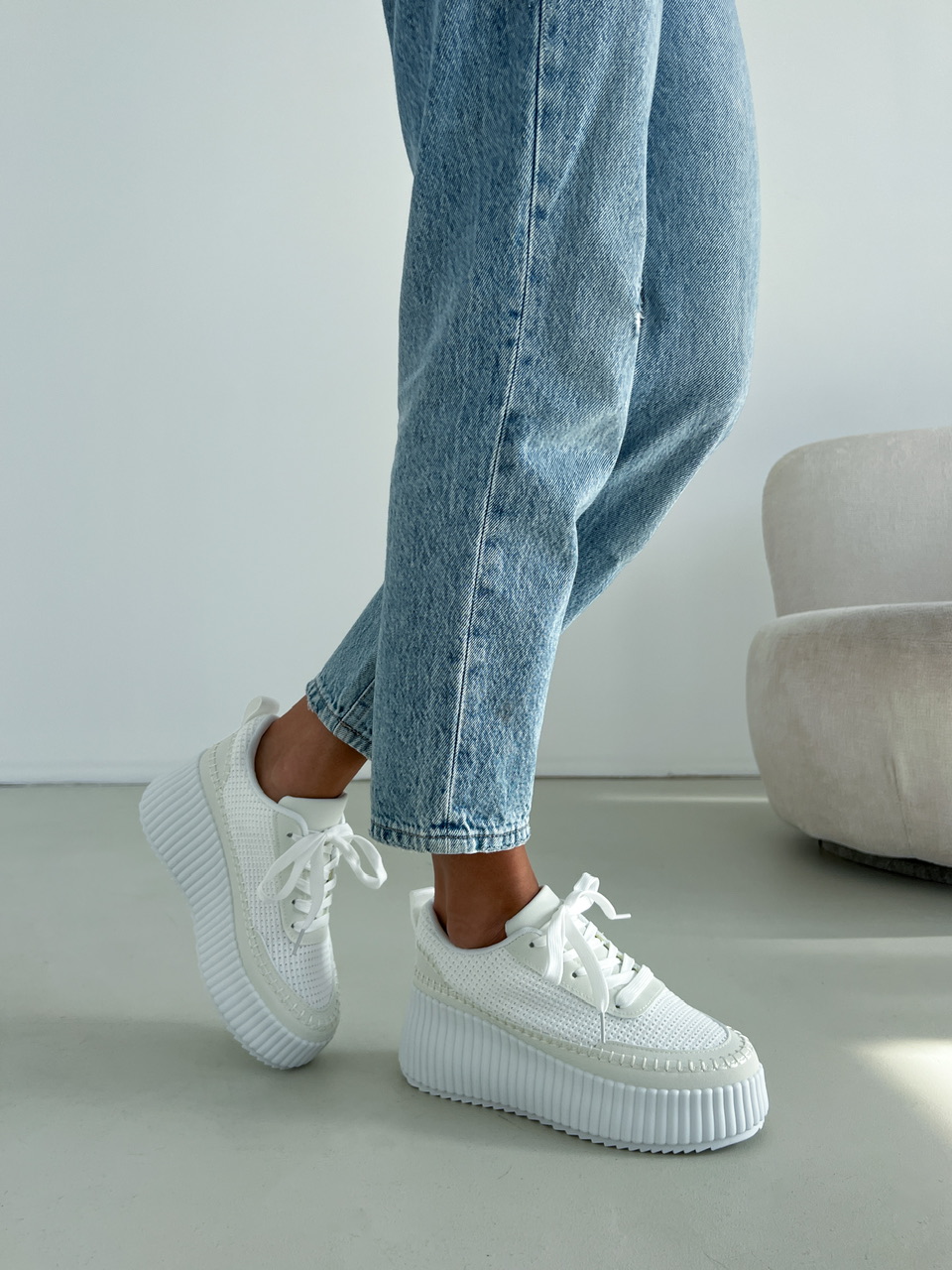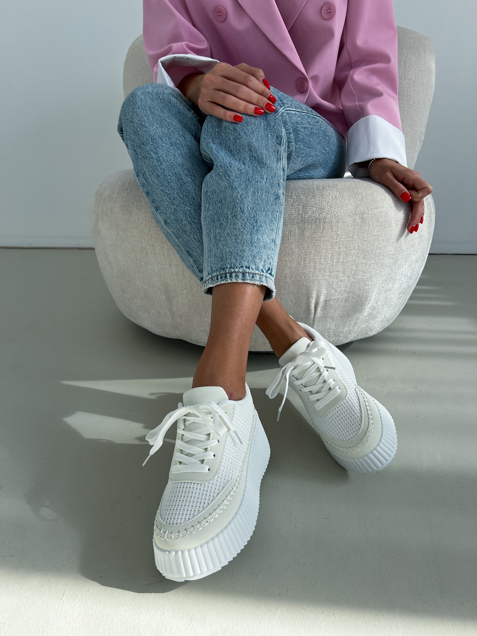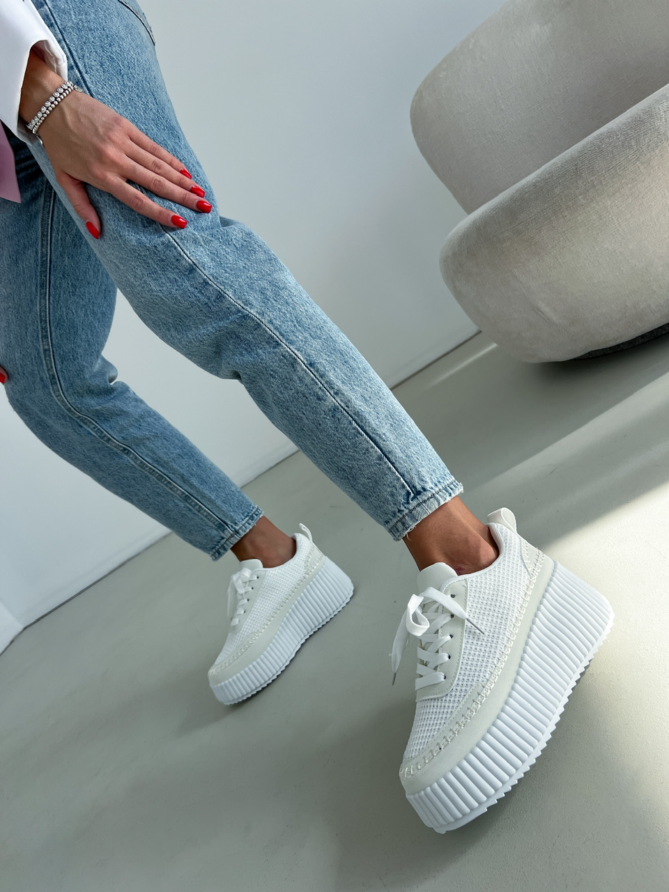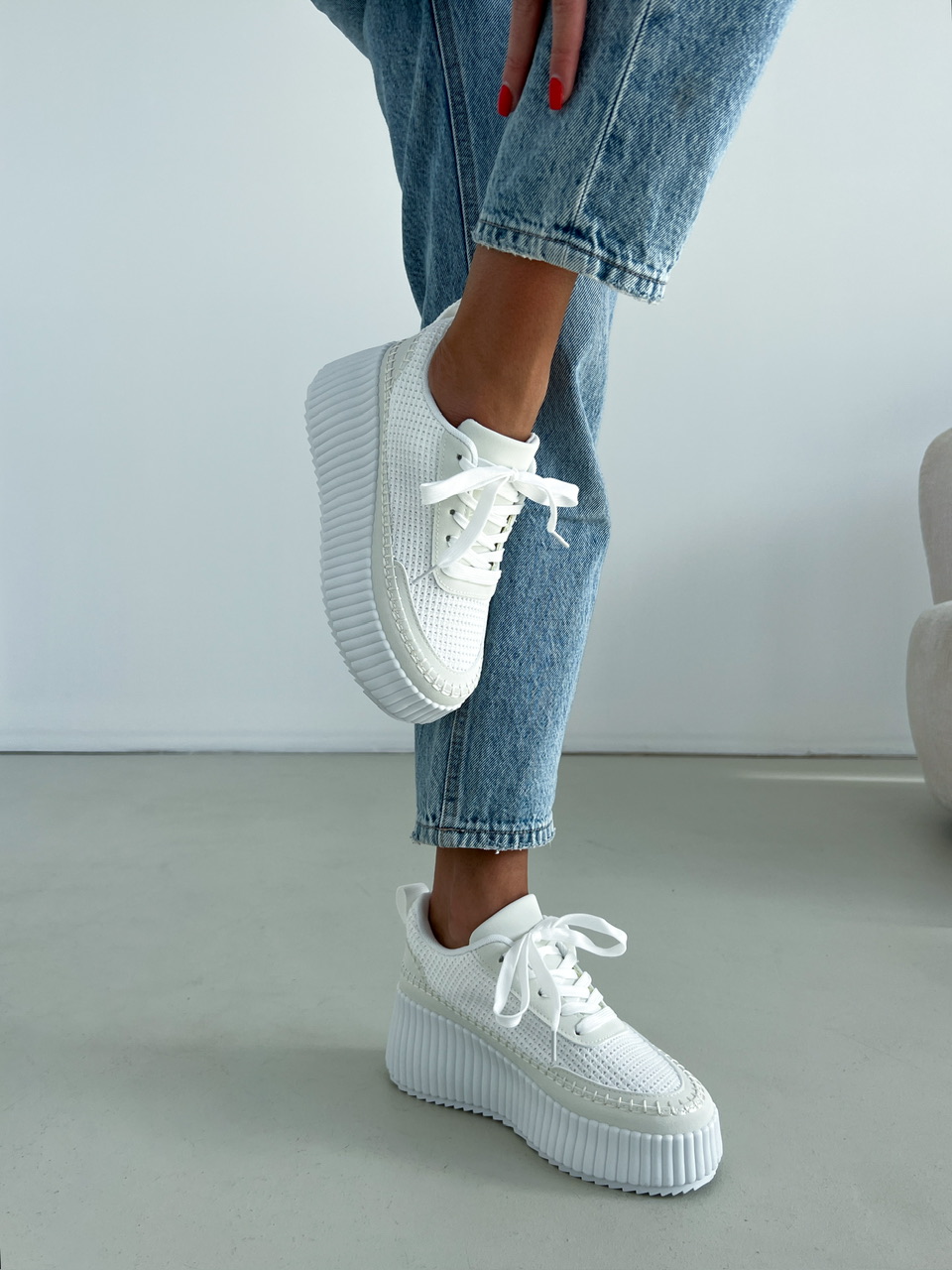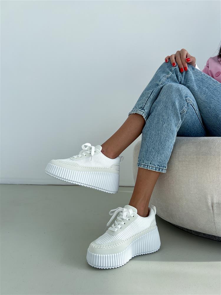 Športová obuv na výraznej bielej podrážke (cca 3,5 cm). Zvršok sa skladá z viacerých materiálov a ozdobných prvkov. Predná časť je na šnurovanie.