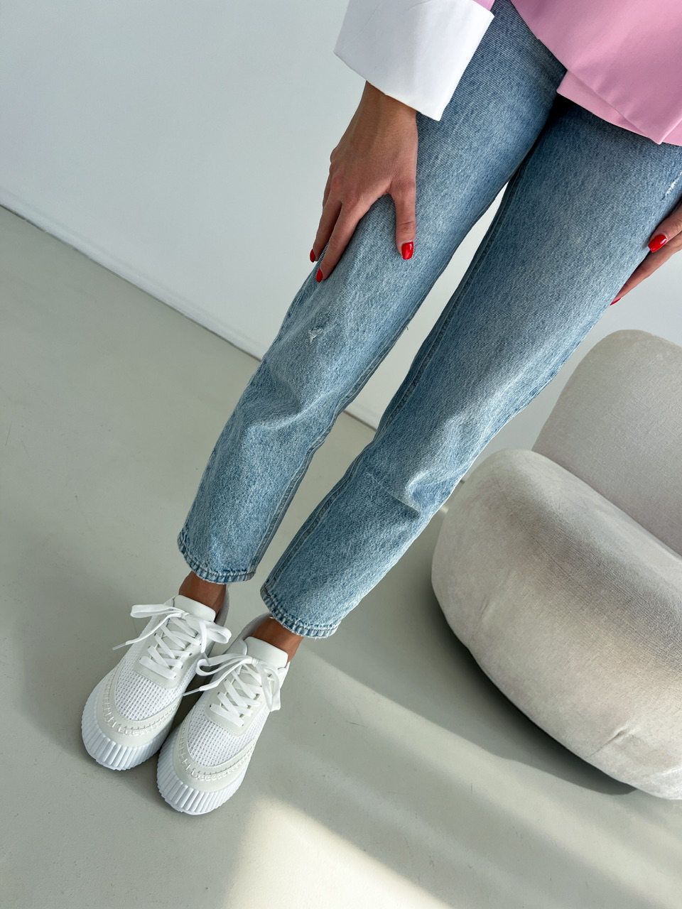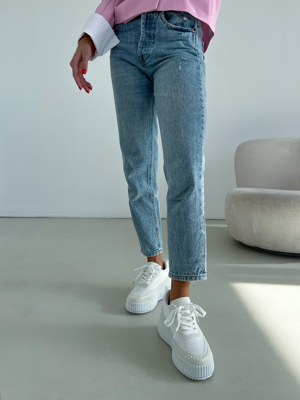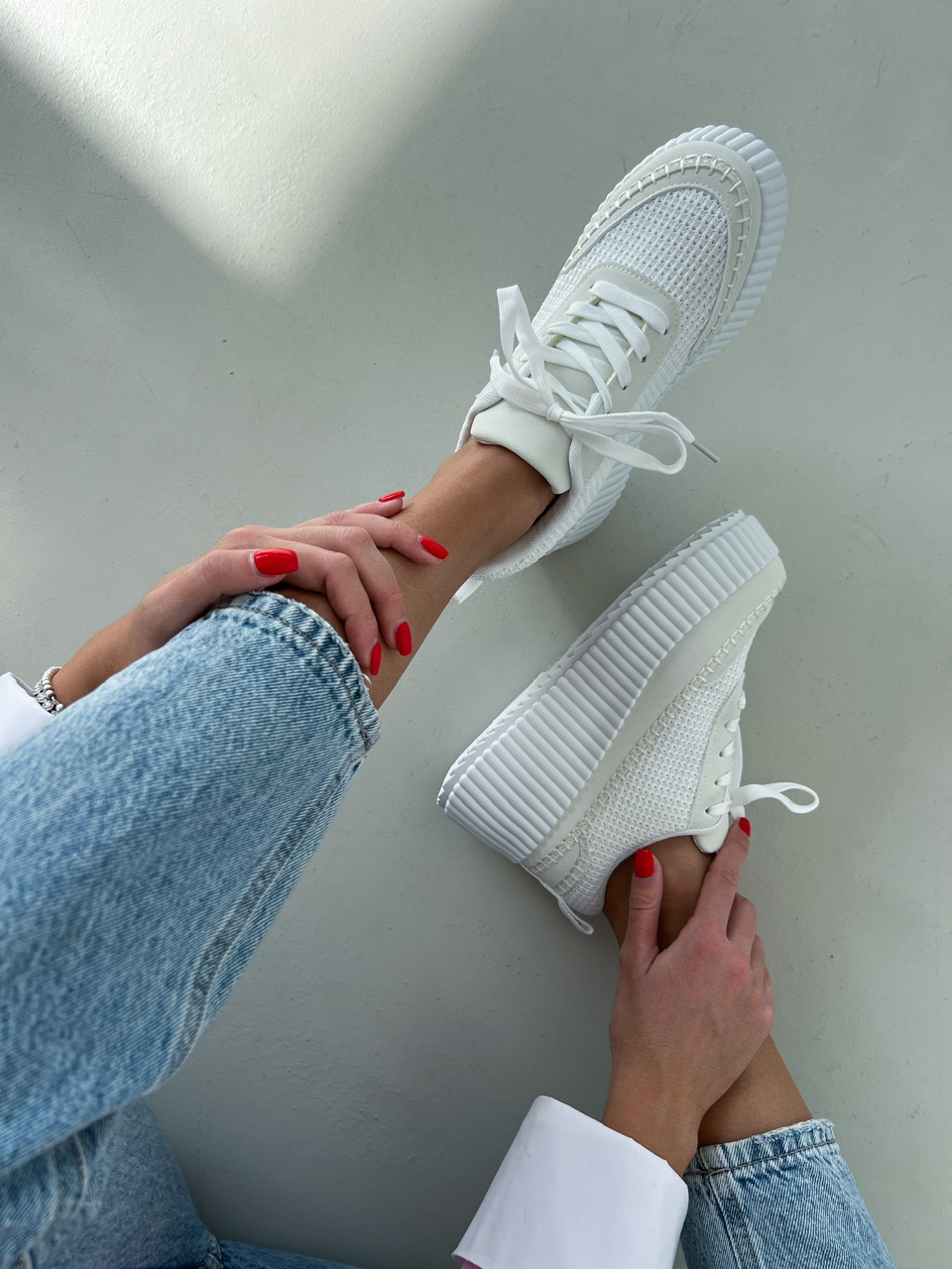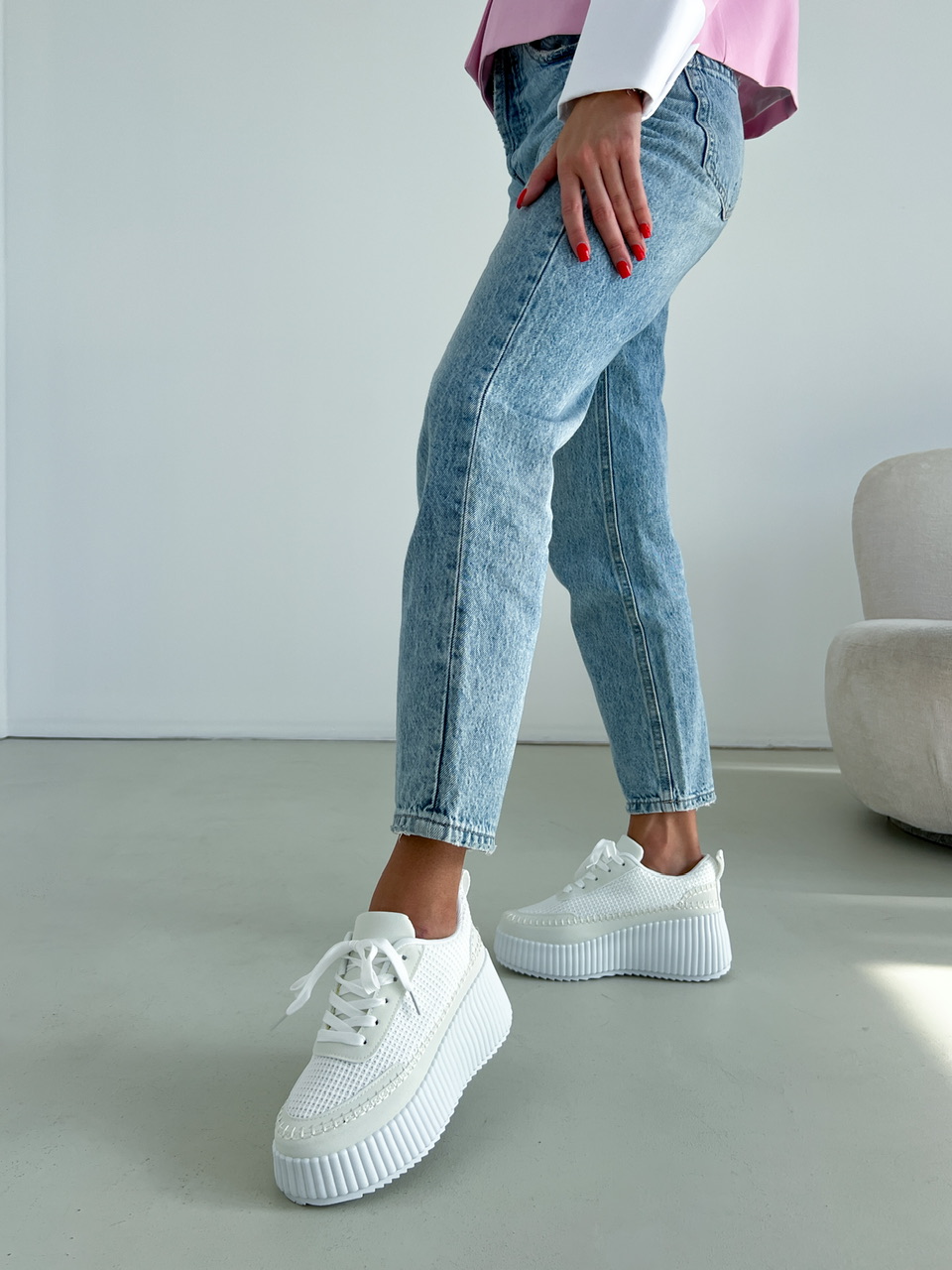 Športová obuv na výraznej bielej podrážke (cca 3,5 cm). Zvršok sa skladá z viacerých materiálov a ozdobných prvkov. Predná časť je na šnurovanie.