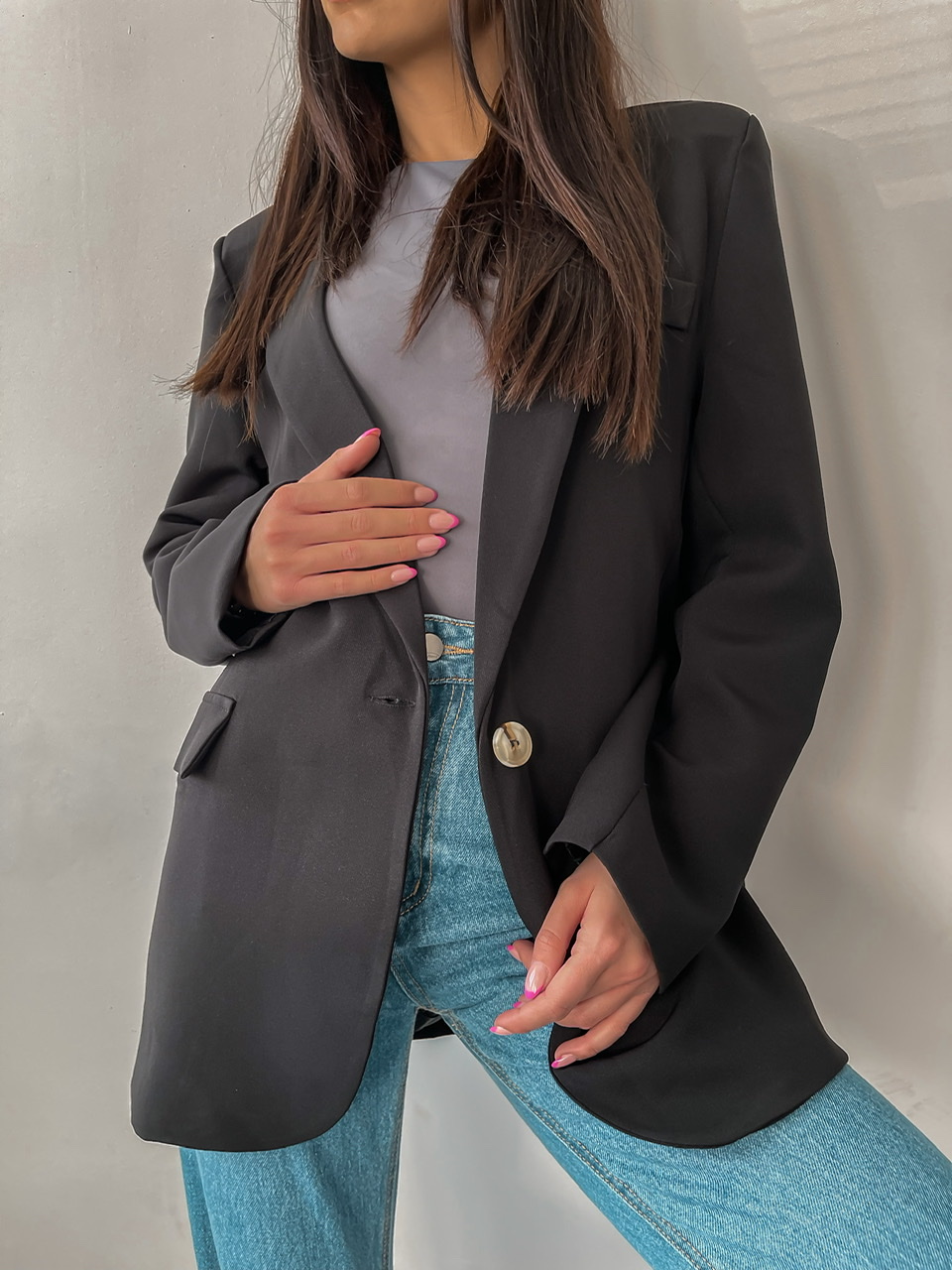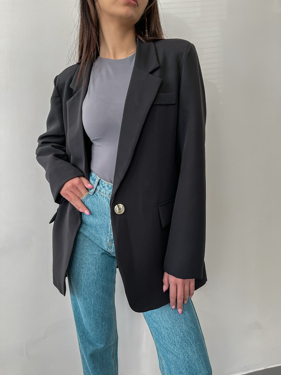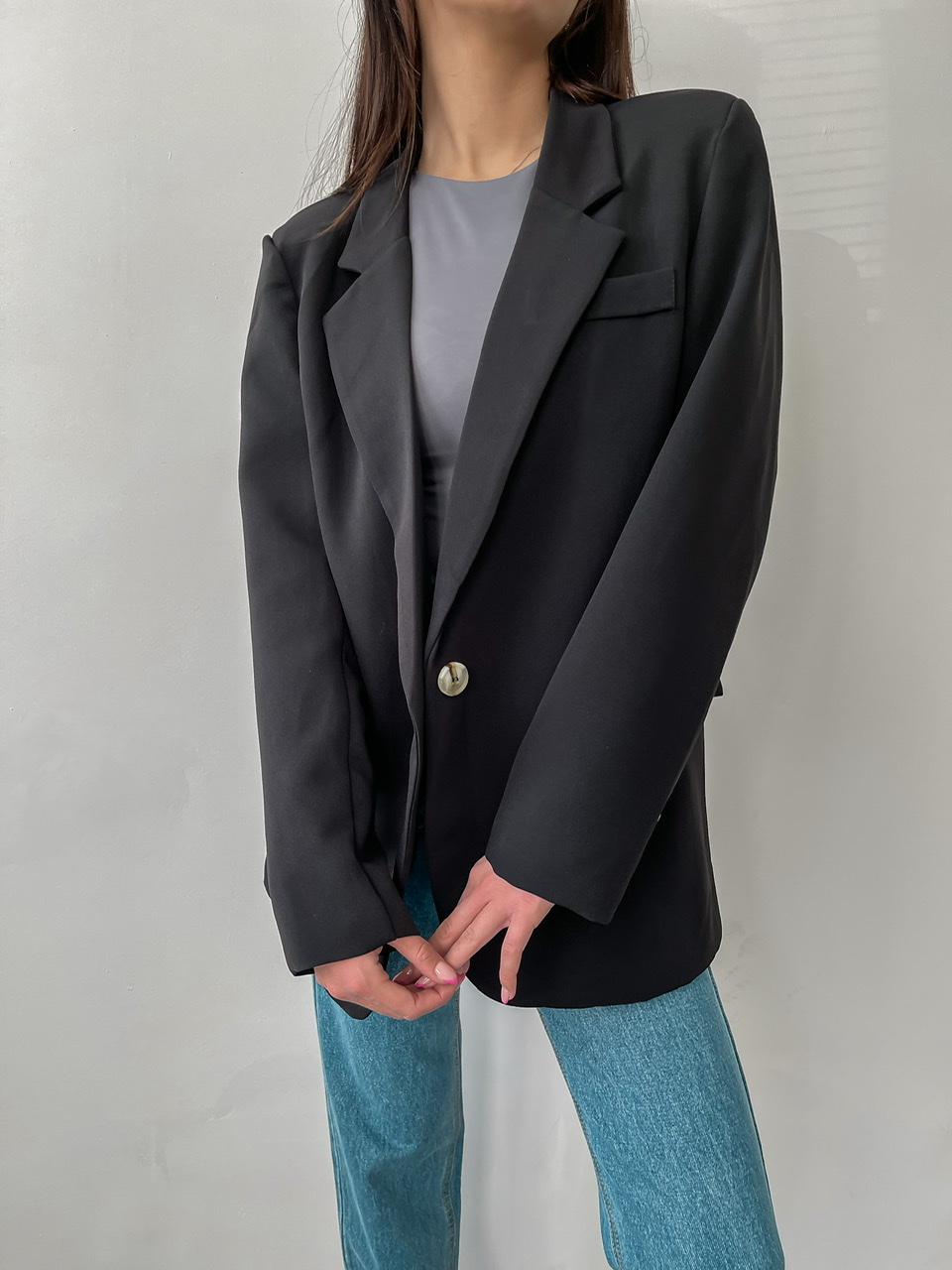 Sako so zapínaním na jeden gombík, ktoré má dlhšie rukávy a v prednej časti po stranách falošné vrecká.