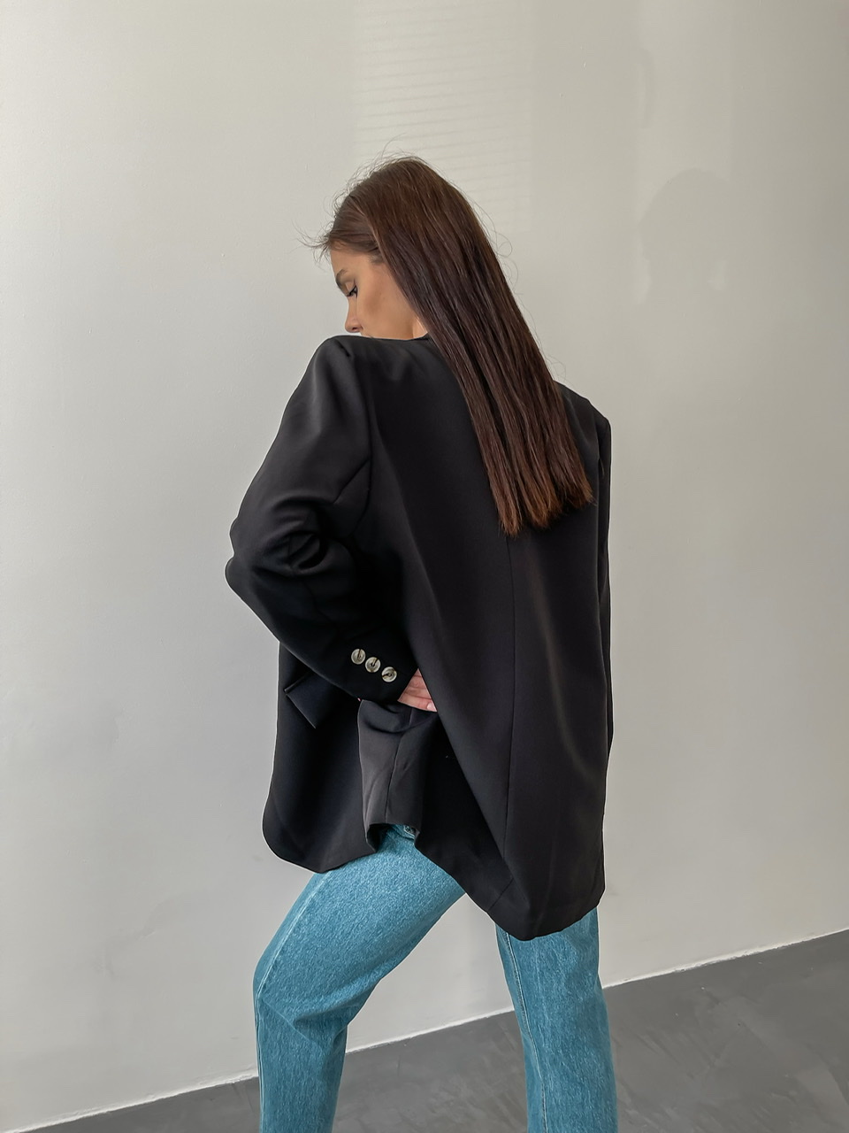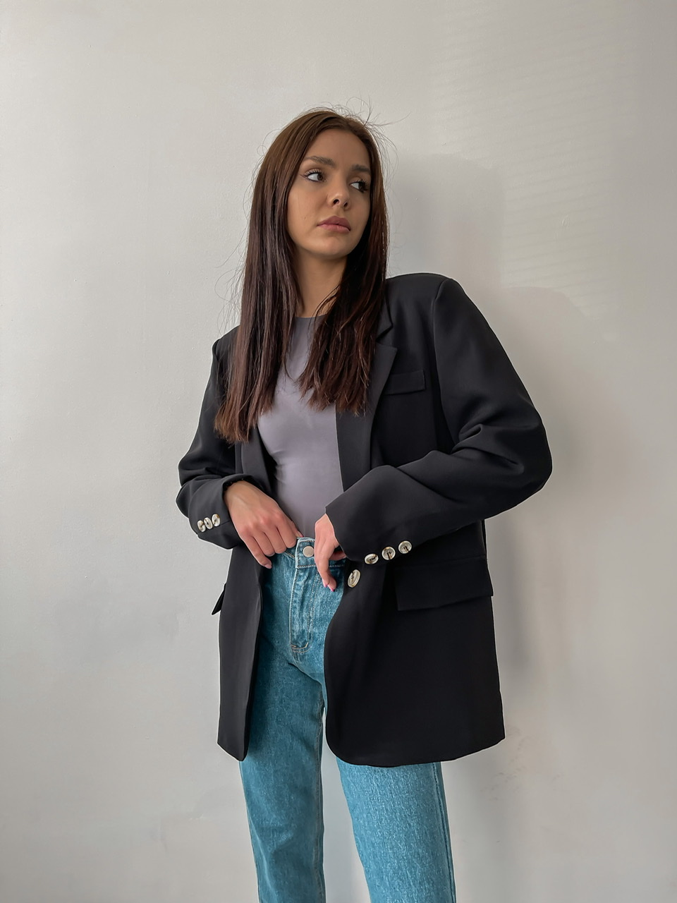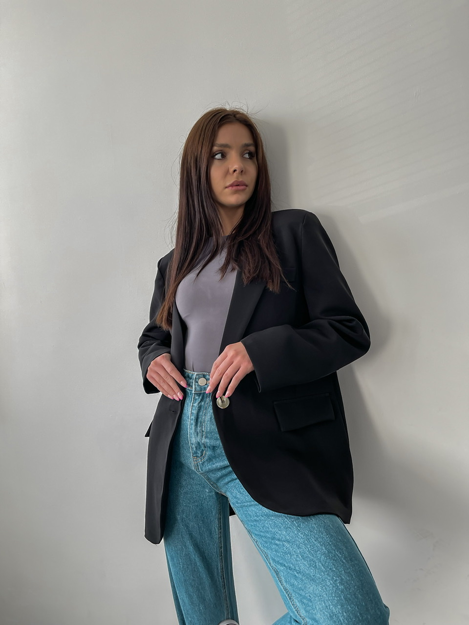 Sako so zapínaním na jeden gombík, ktoré má dlhšie rukávy a v prednej časti po stranách falošné vrecká.