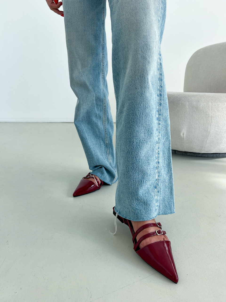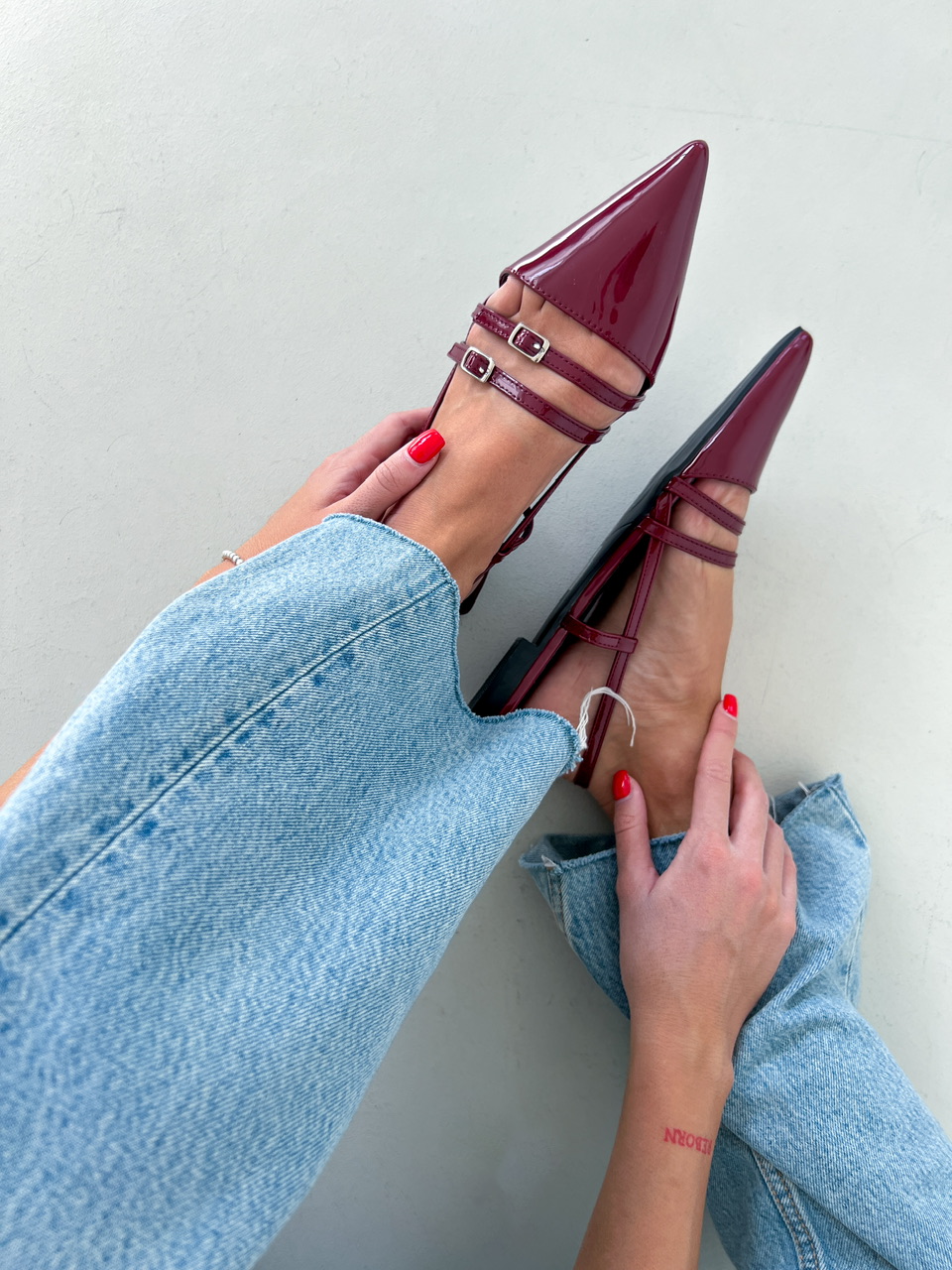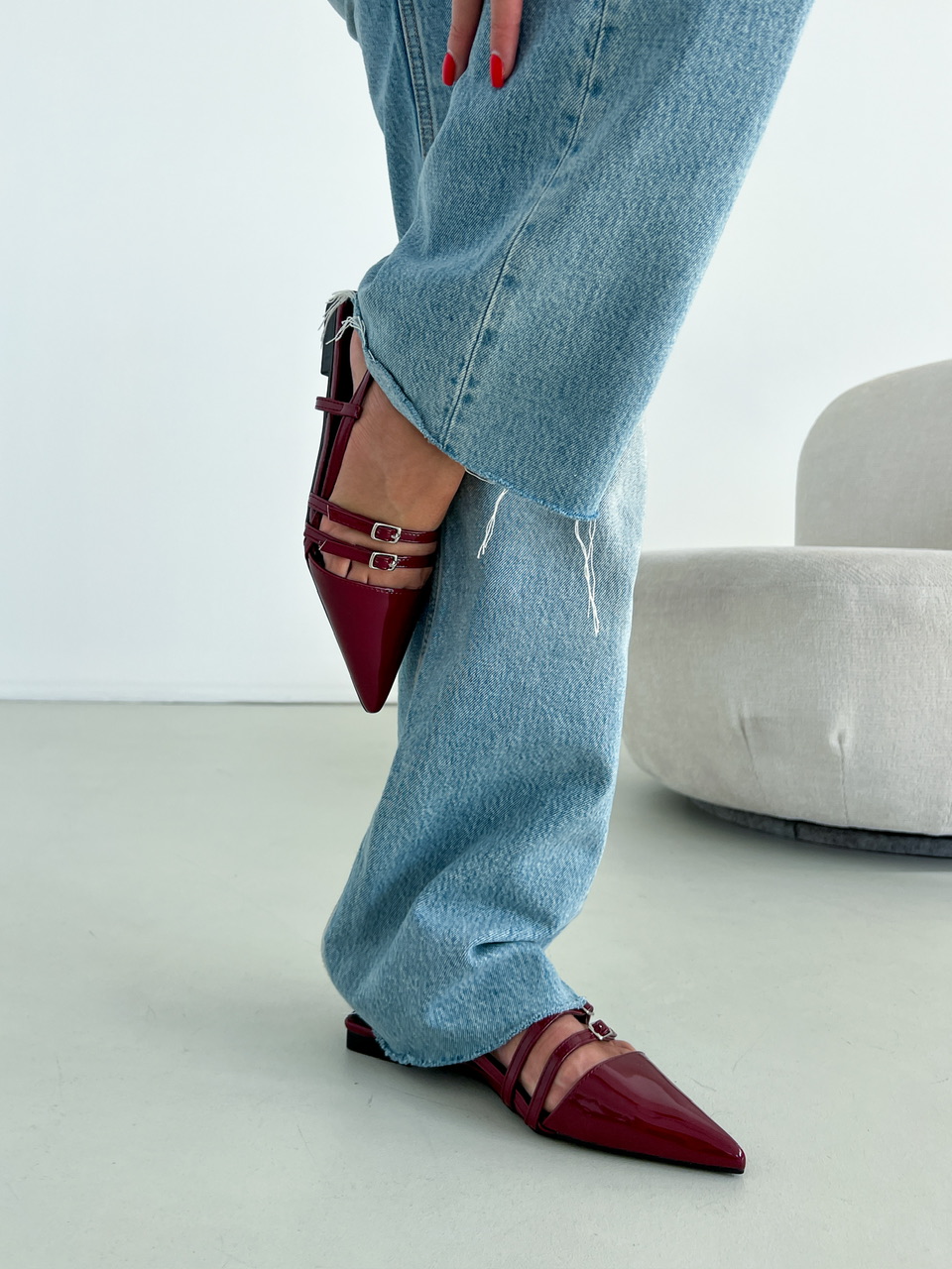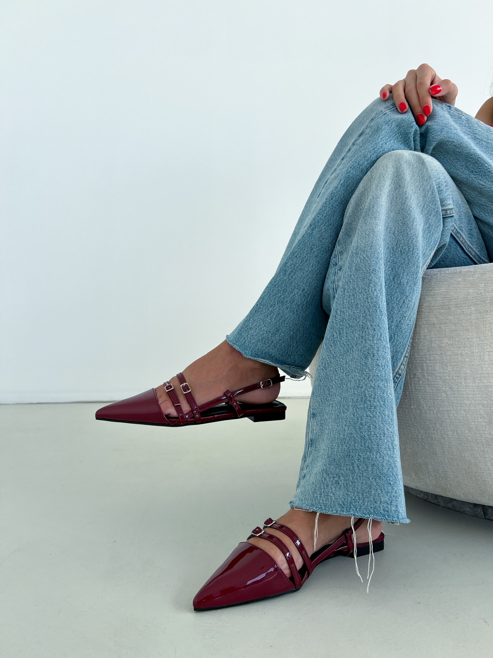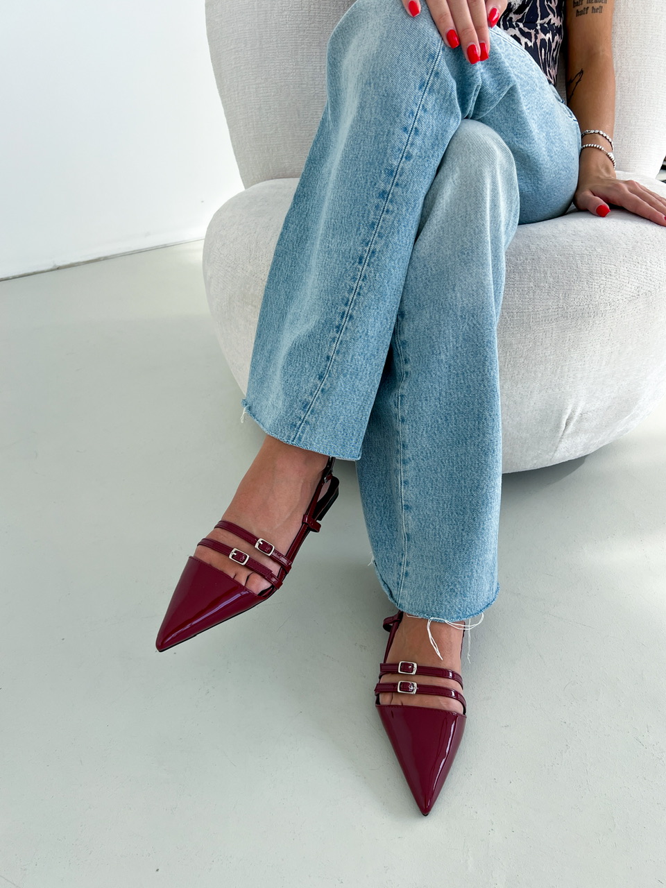 Lakované topánky na nízke podrážke. Predná časť je špicatého tvaru. Zvršok je zdobený s tenkými remienkami so striebornými prackami. Zadná časť päty je otvorená a hranatého tvaru.