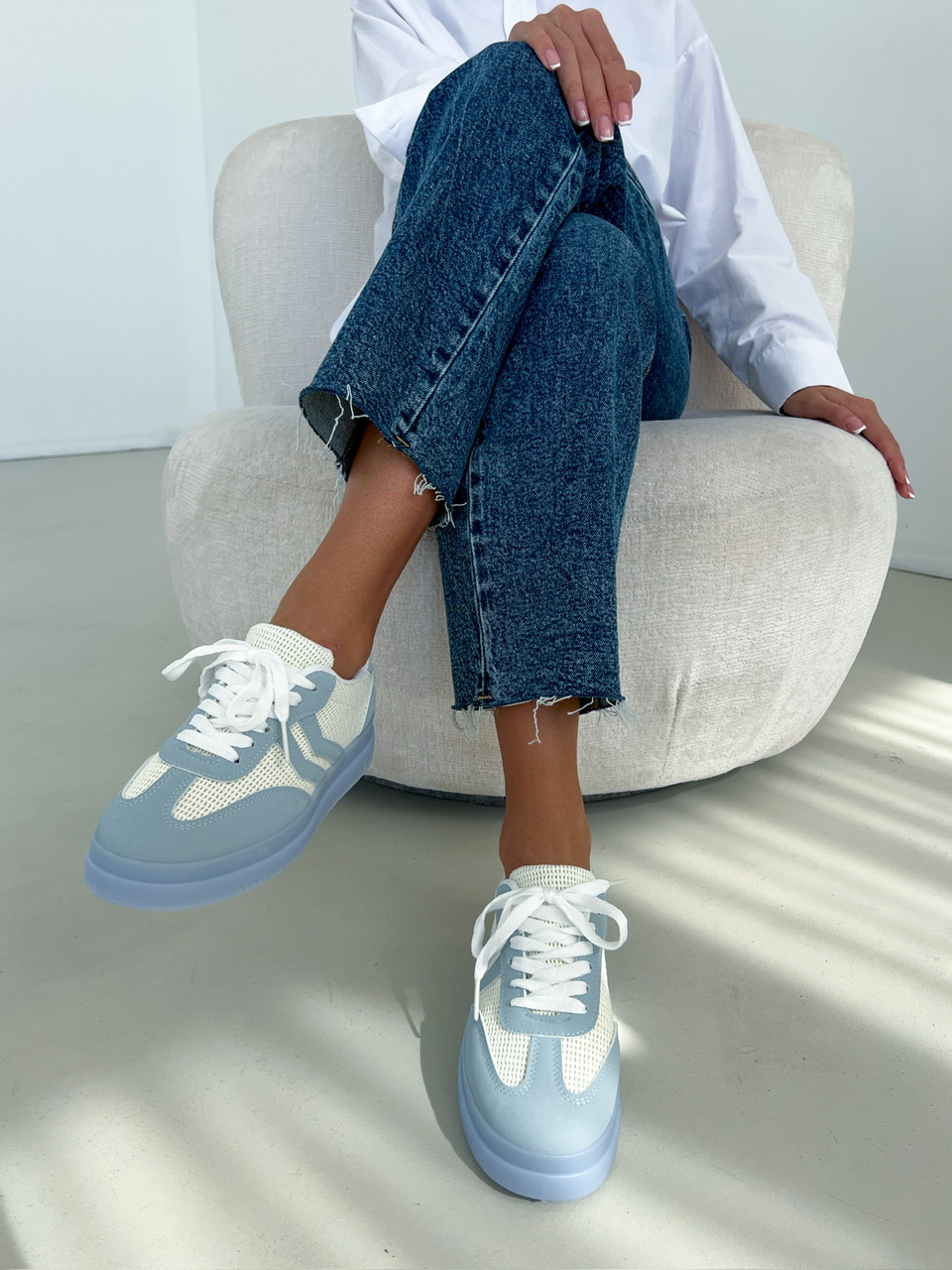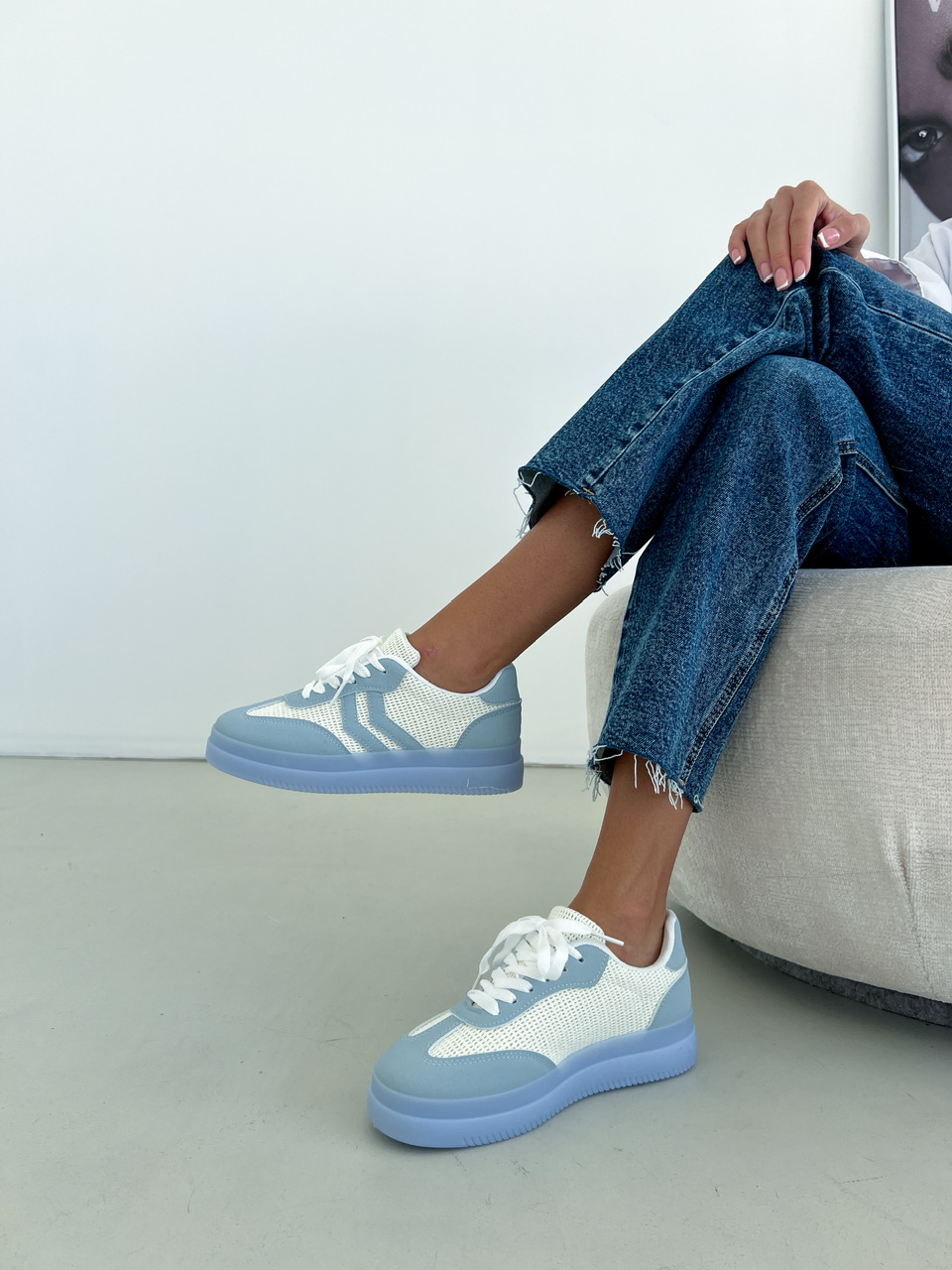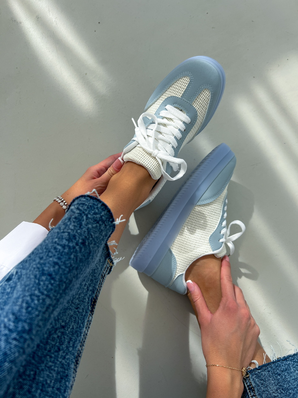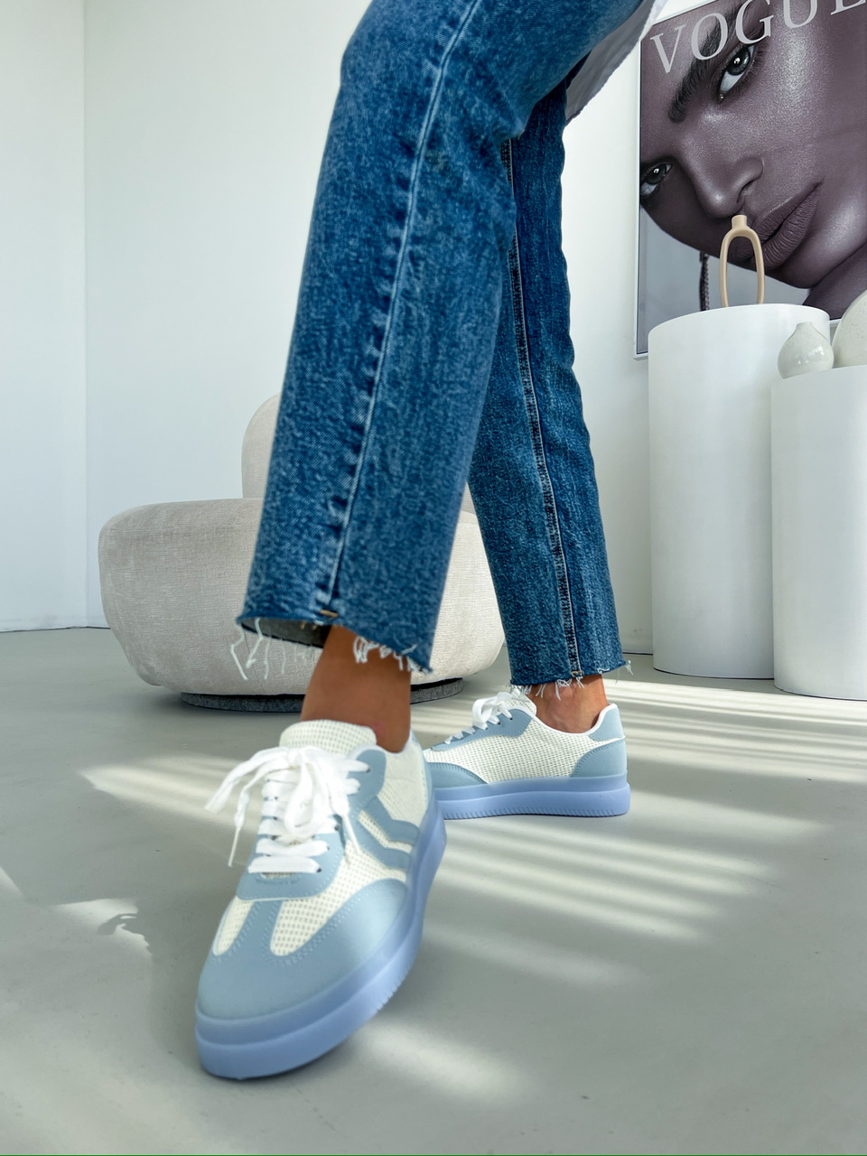Športová obuv na rovnej, mierne vyvýšenej podrážke modrej farby (cca 2,5 cm). Predná časť je na šnurovanie. Zvršok sa skladá z viacerých materiálov a farebných prvkov.