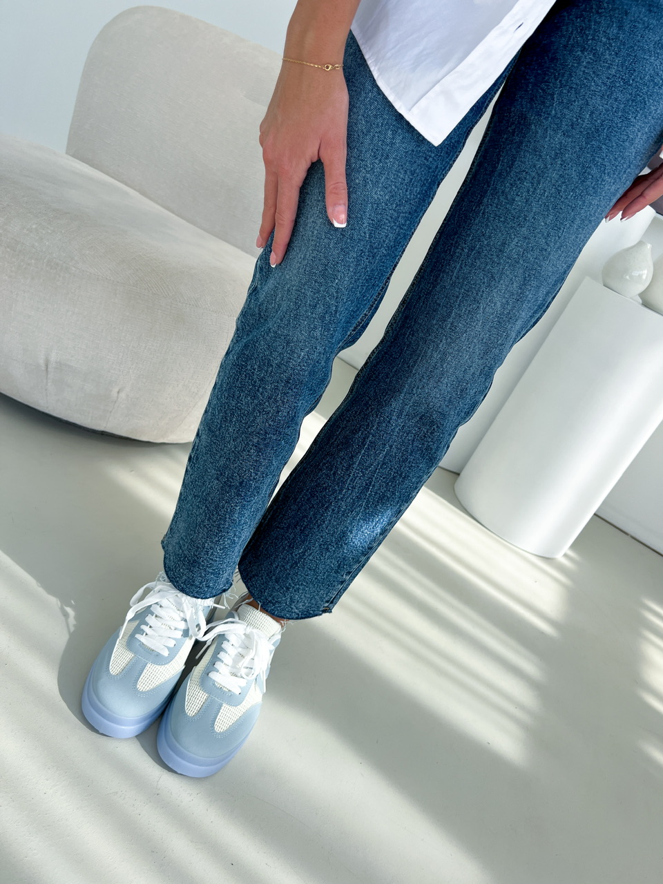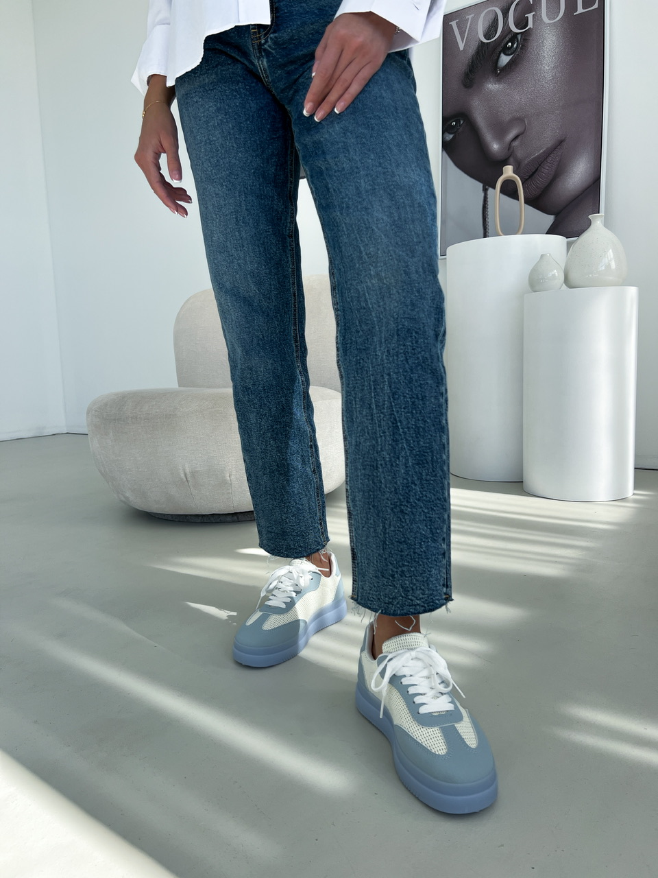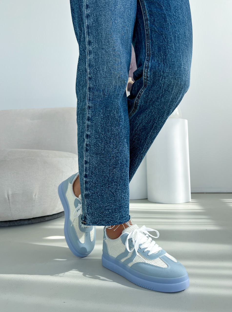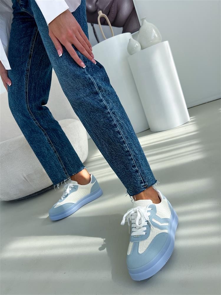 Športová obuv na rovnej, mierne vyvýšenej podrážke modrej farby (cca 2,5 cm). Predná časť je na šnurovanie. Zvršok sa skladá z viacerých materiálov a farebných prvkov.