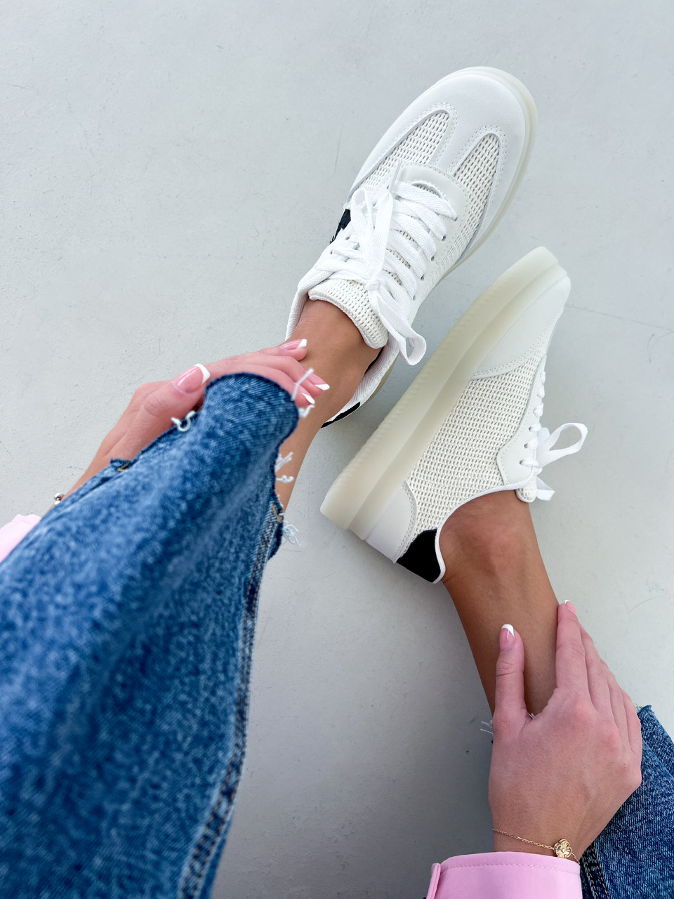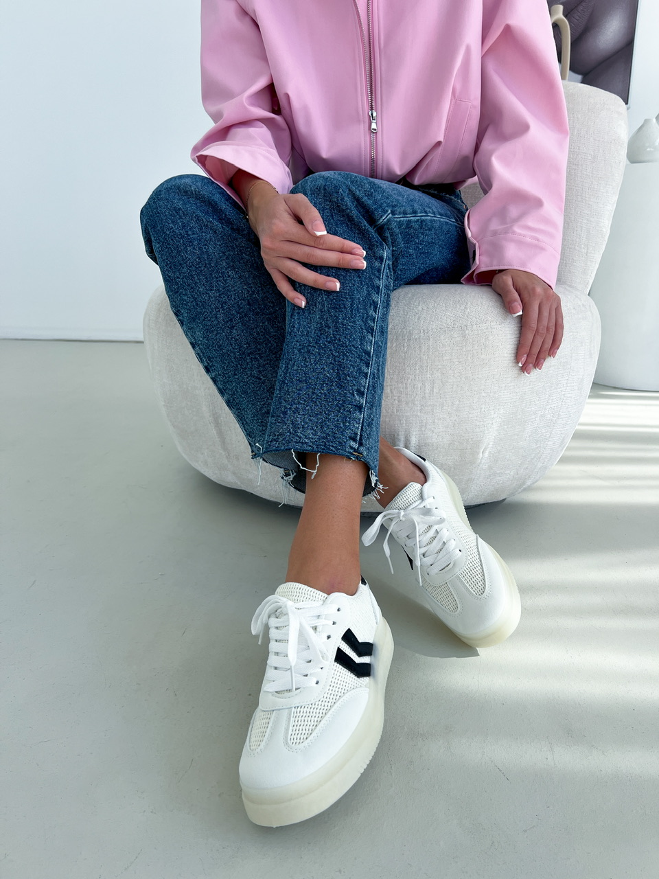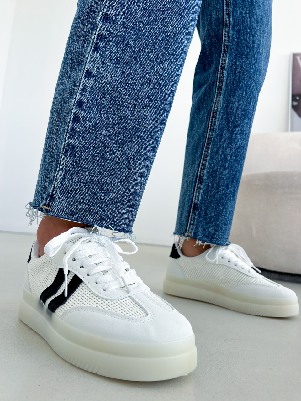 Športová obuv na rovnej, mierne vyvýšenej podrážke (cca 2,5 cm). Predná časť je na šnurovanie. Zvršok sa skladá z viacerých materiálov a farebných prvkov.