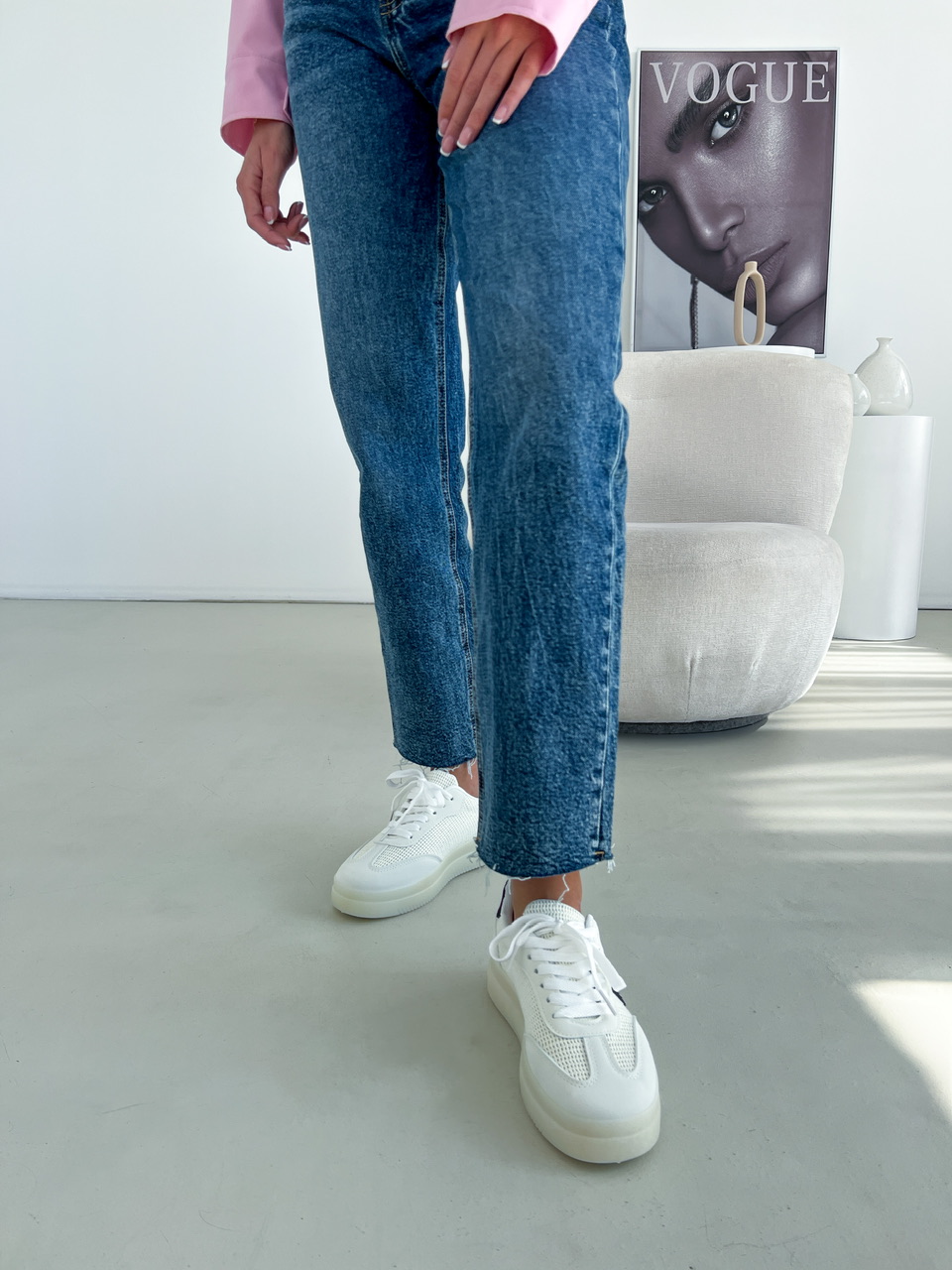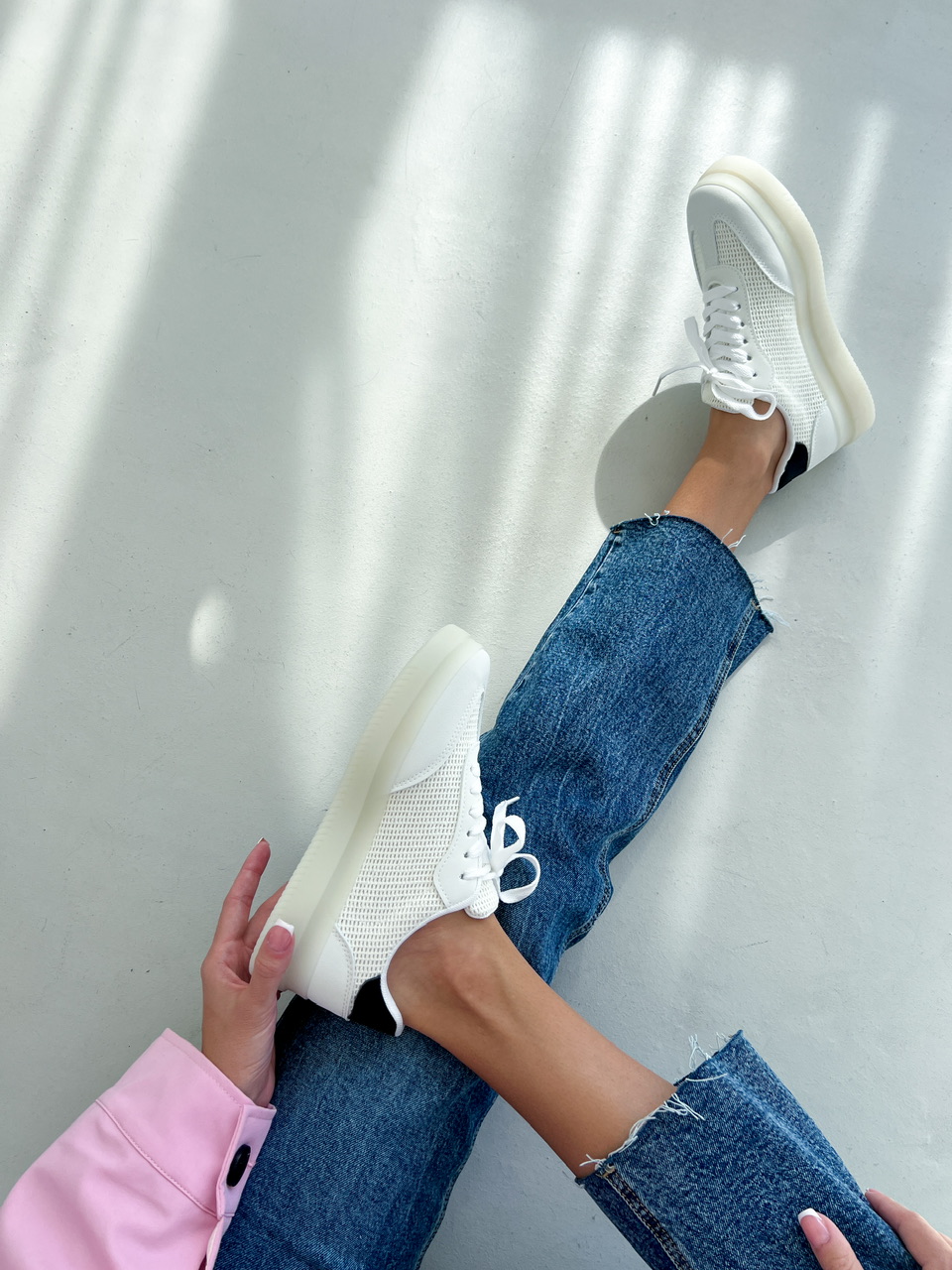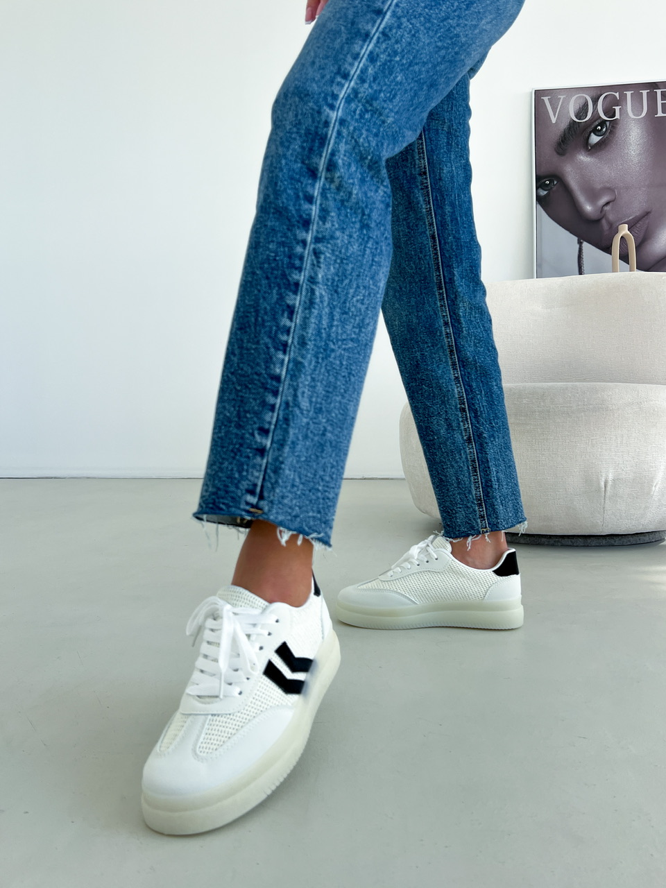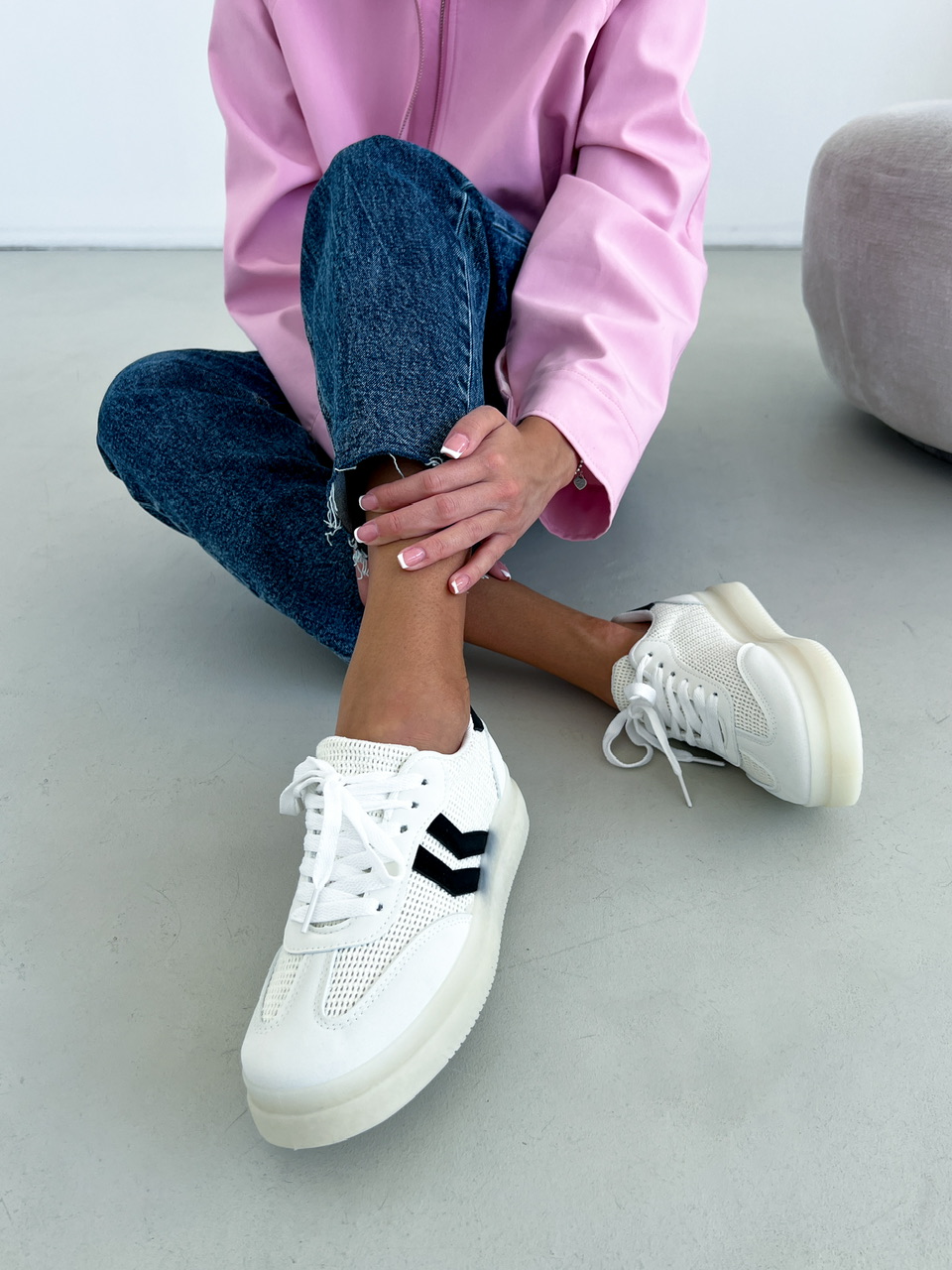 Športová obuv na rovnej, mierne vyvýšenej podrážke (cca 2,5 cm). Predná časť je na šnurovanie. Zvršok sa skladá z viacerých materiálov a farebných prvkov.