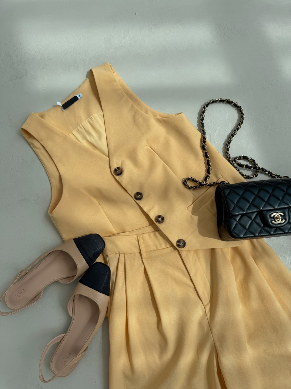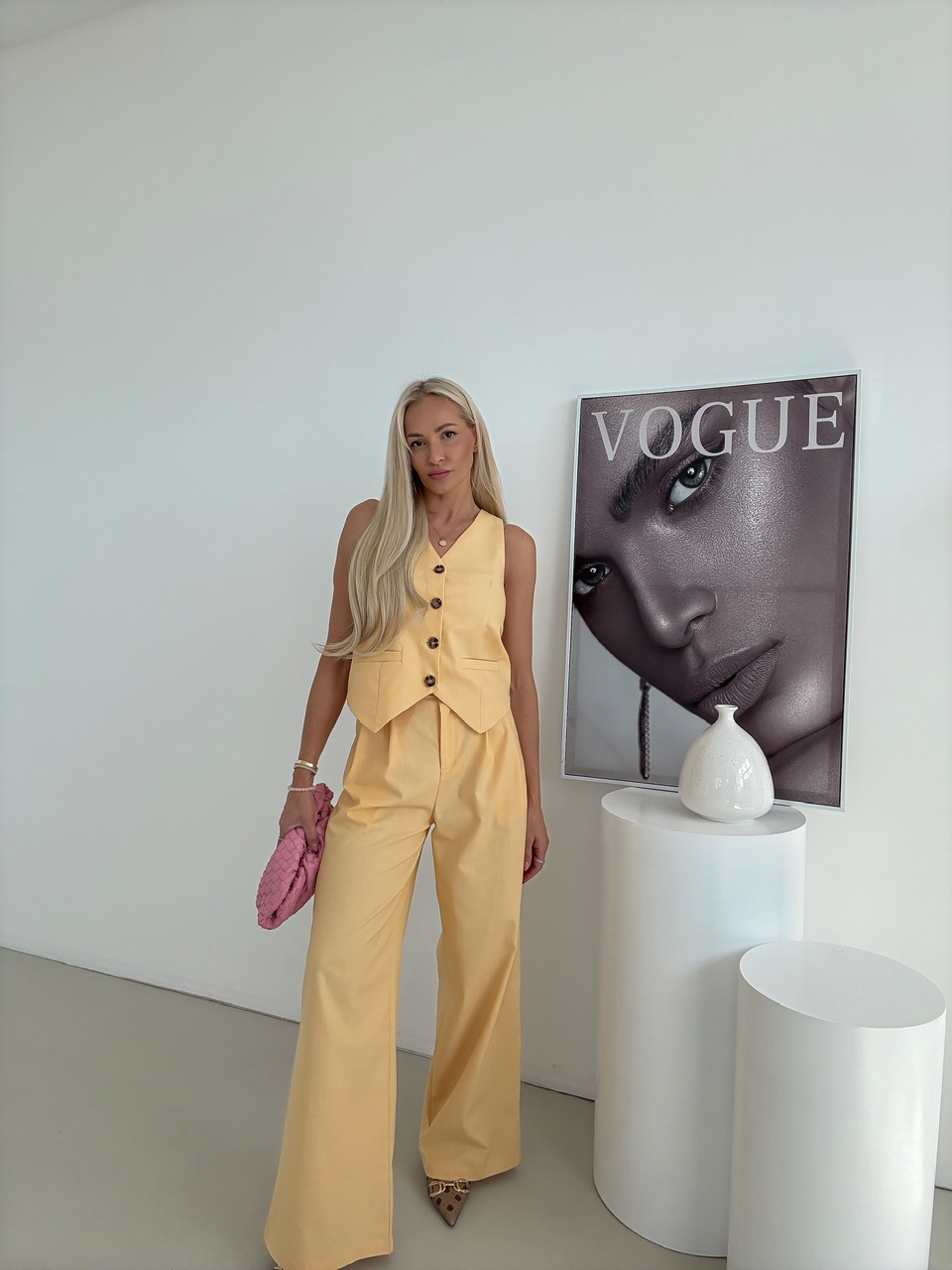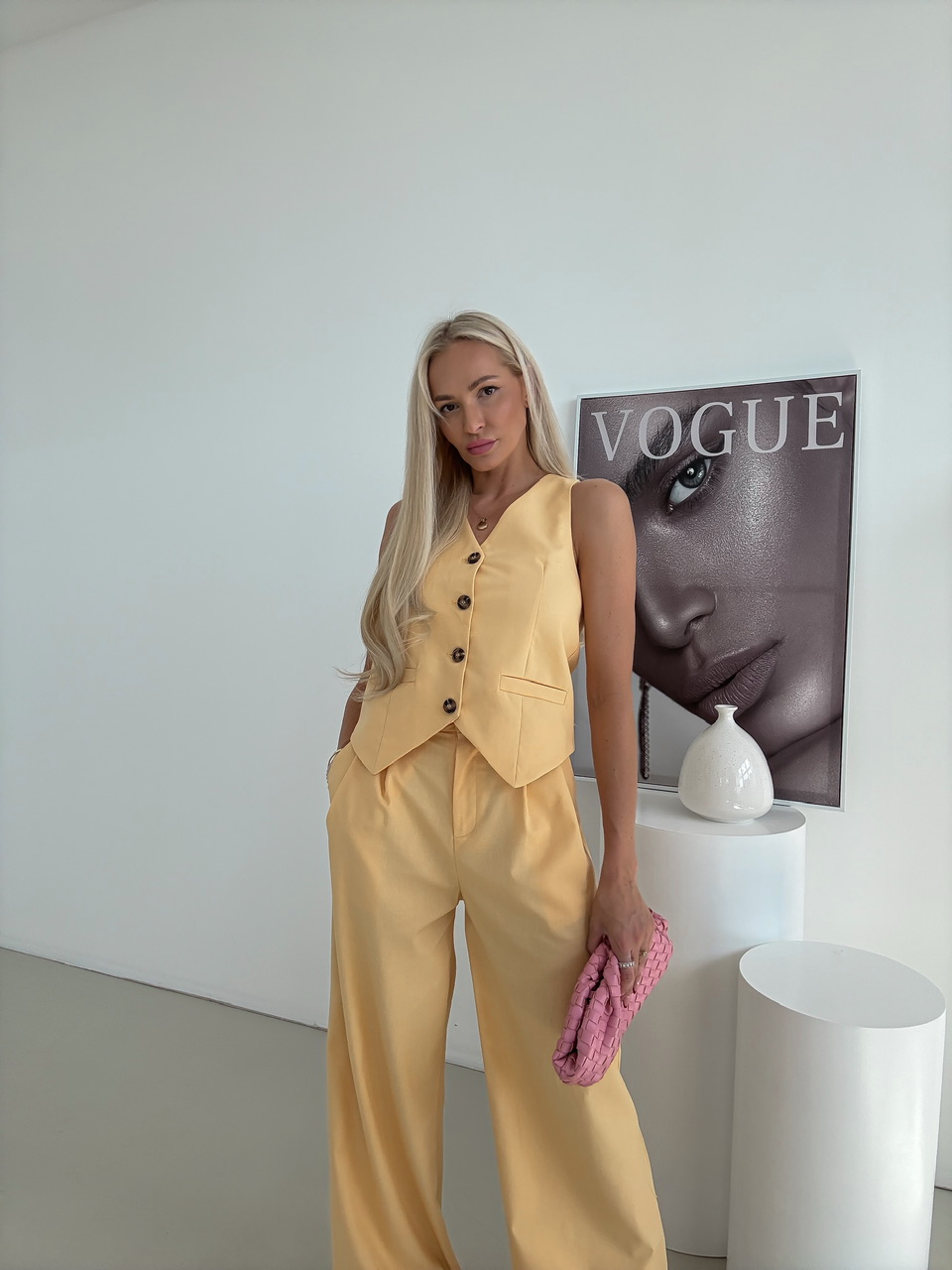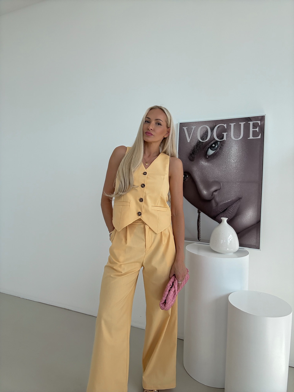 Štýlový dvojdielny komplet. Súčasťou setu sú klasické nohavice so zapínaním na gombík a zips, doplnené o pútka na opasok pre ešte lepšie prispôsobenie. Vesta s véčkovým výstrihom krásne zvýrazňuje siluetu. Jednoradové zapínanie dodáva celému outfitu sofistikovaný vzhľad a nadčasový štýl.