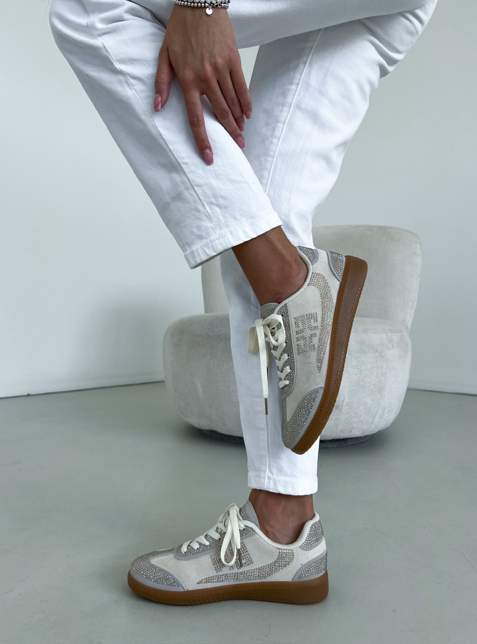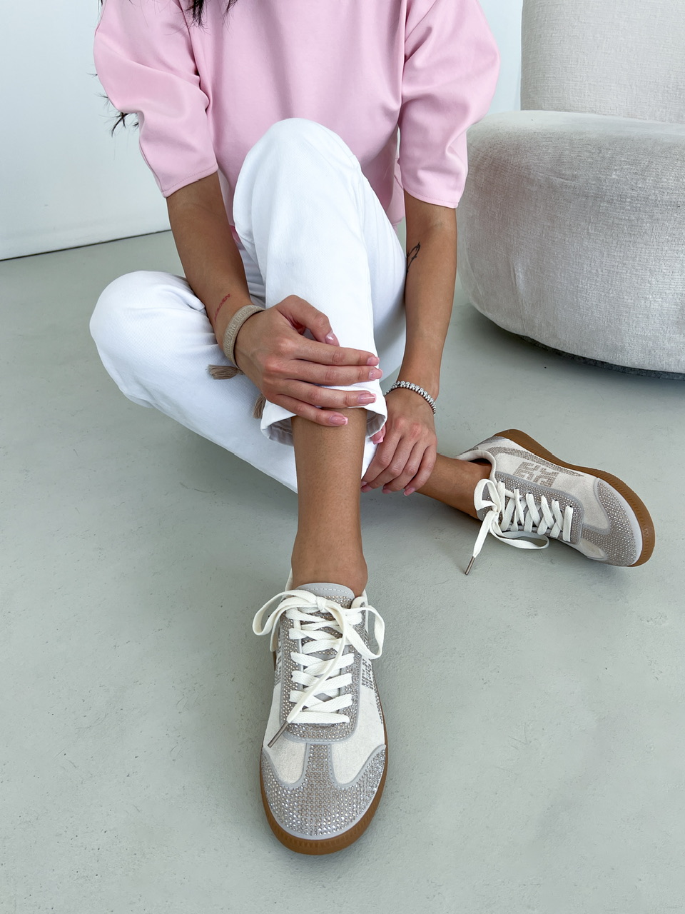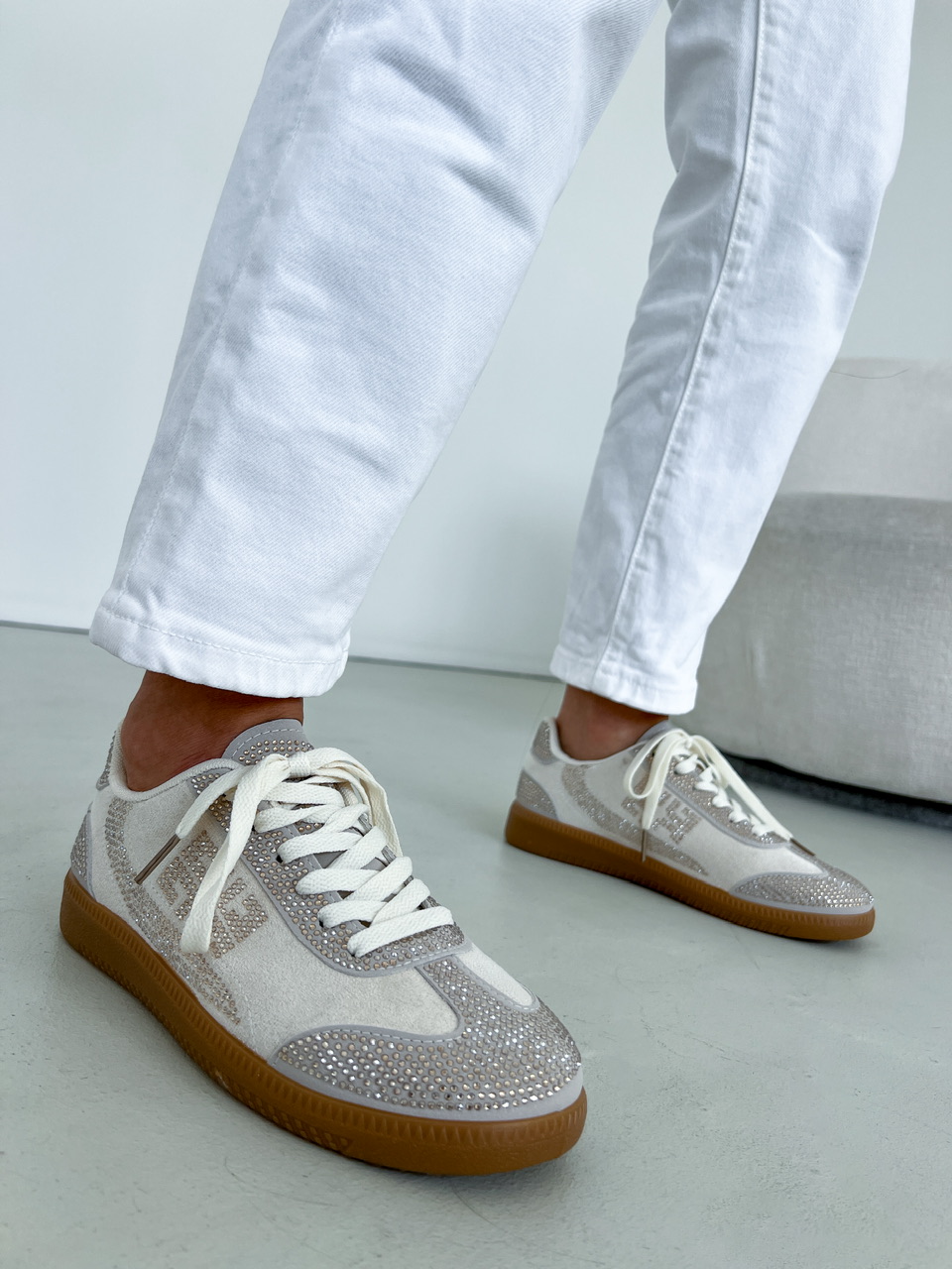 Športová obuv na nízkej hnedej podrážke. Zvršok je semišového materiálu, zdobený štrasovými kamienkami. Predná časť je na šnurovanie.