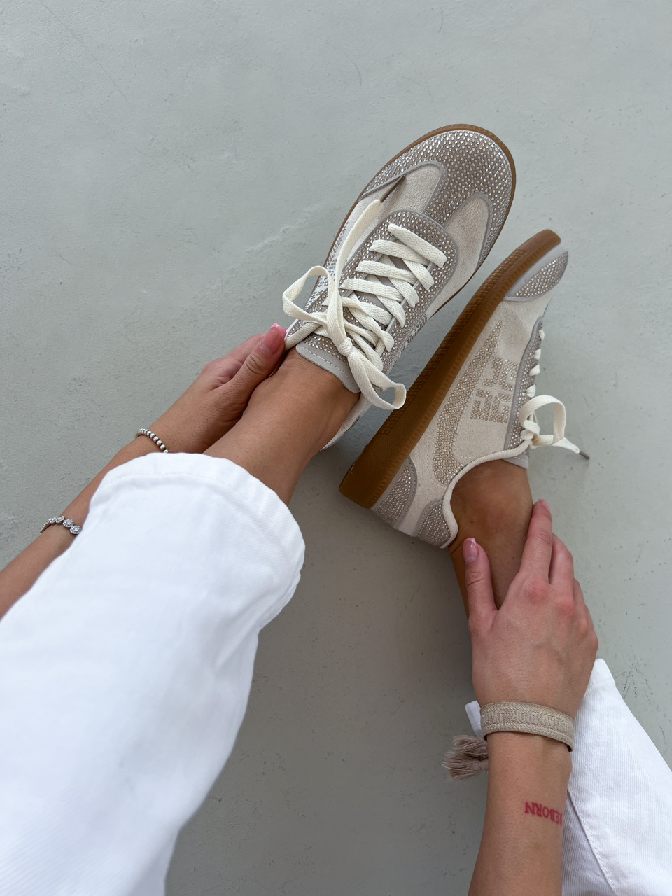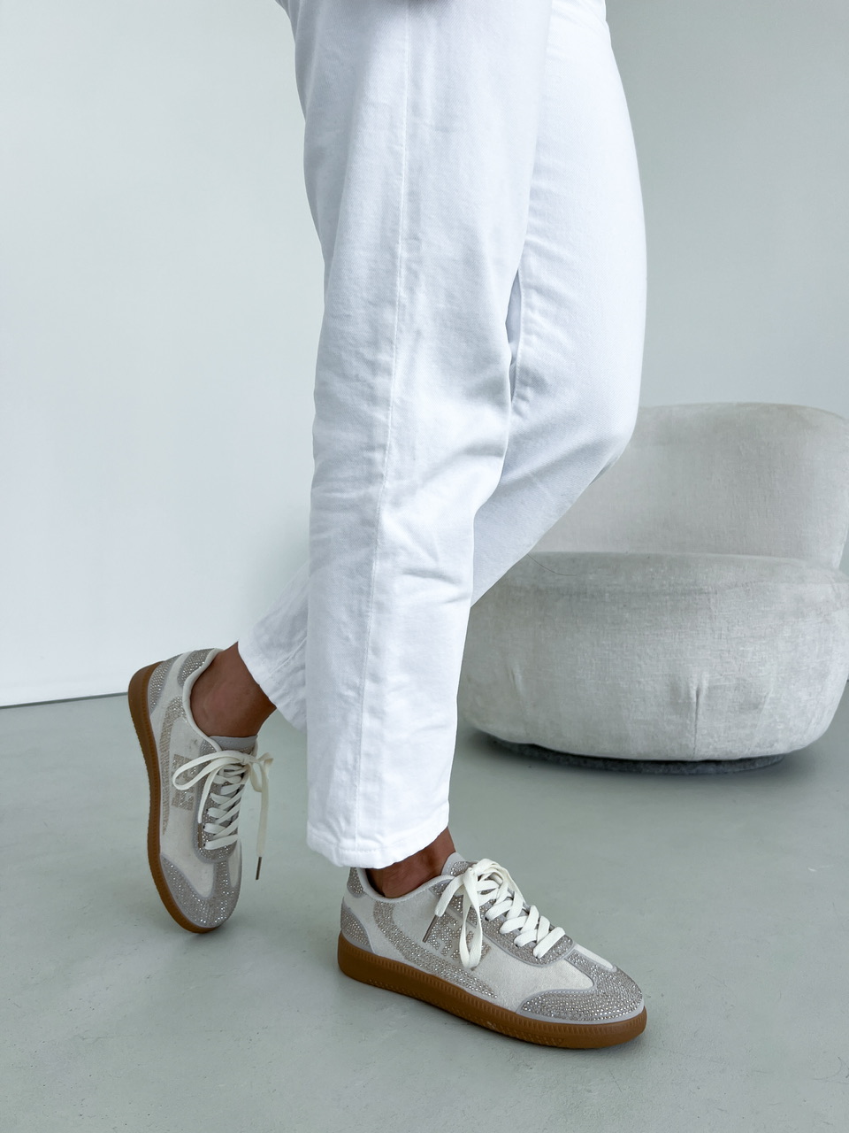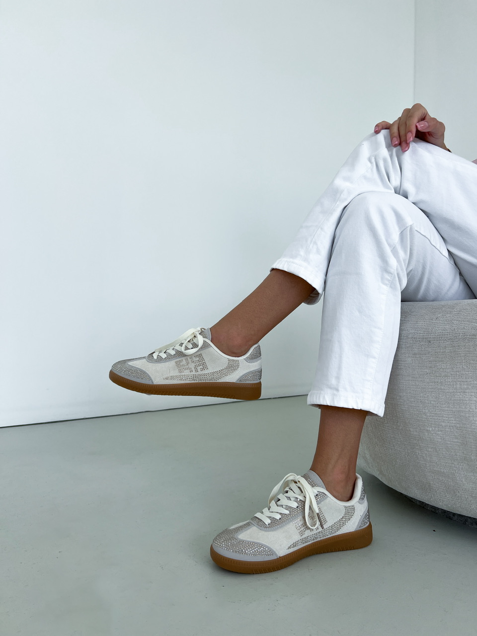 Športová obuv na nízkej hnedej podrážke. Zvršok je semišového materiálu, zdobený štrasovými kamienkami. Predná časť je na šnurovanie.