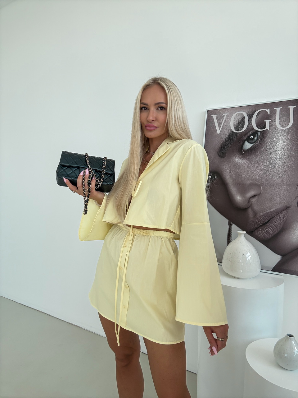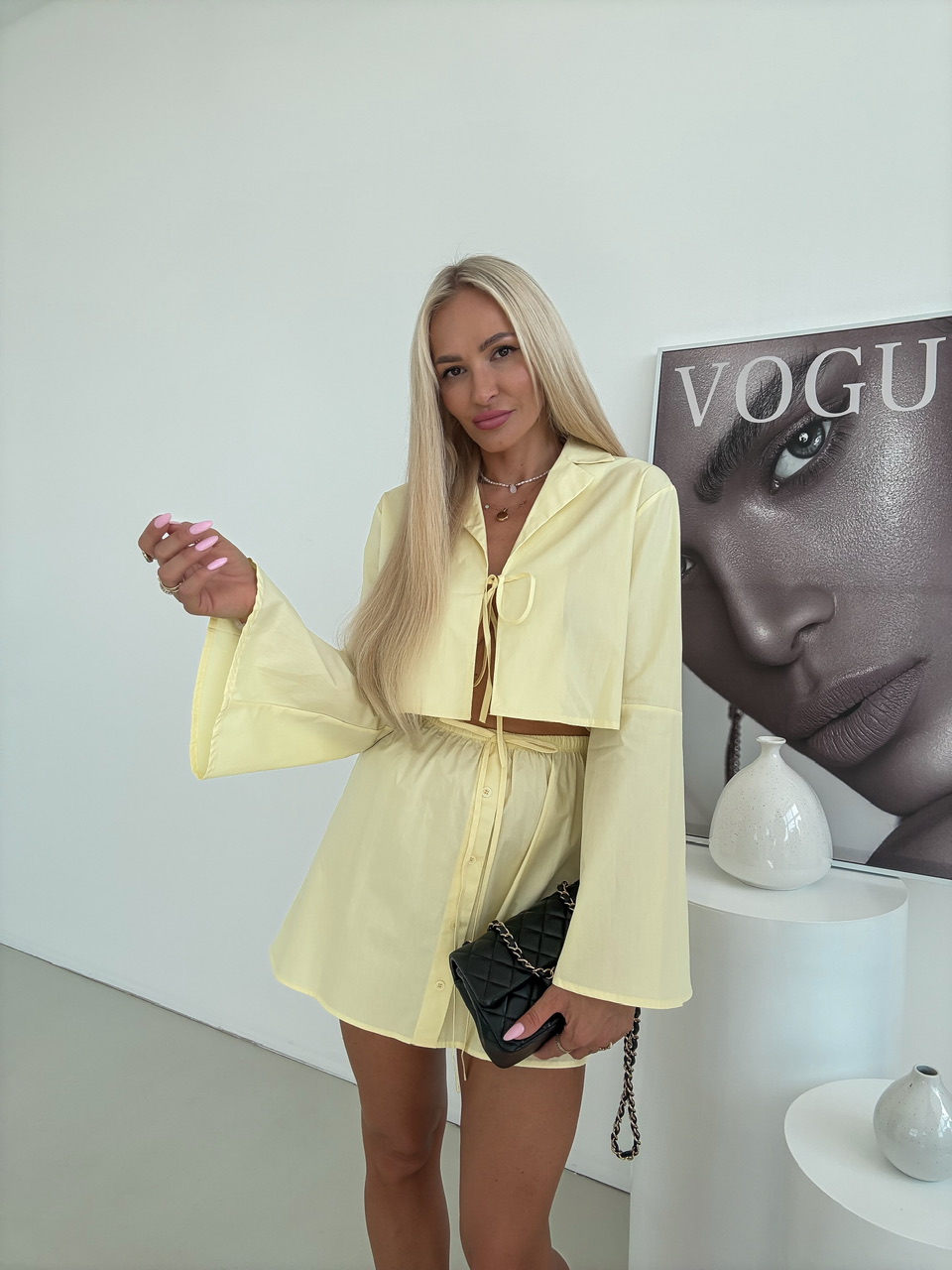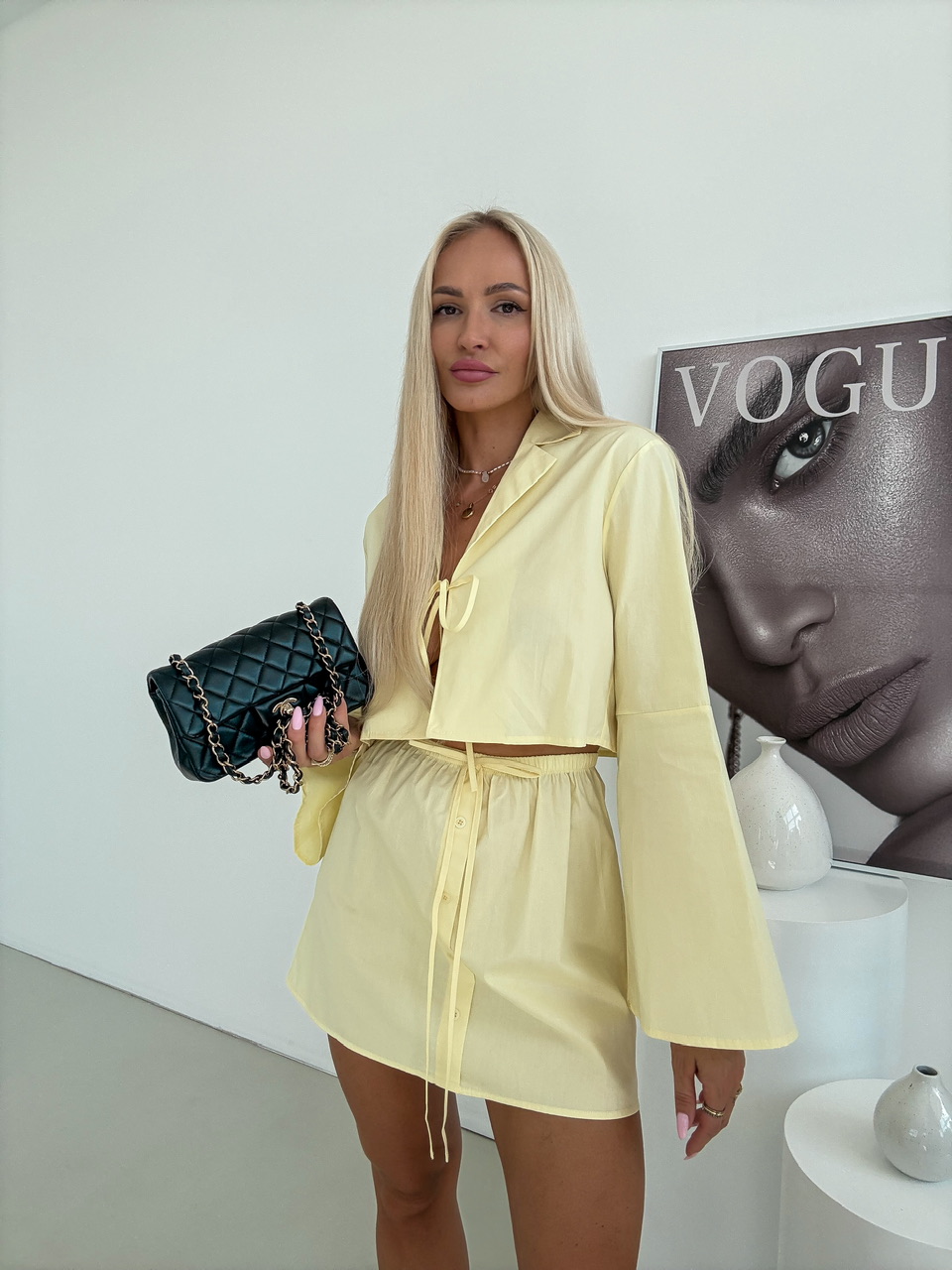 Set sa skladá z ladenej sukne a blúzky, ktoré spolu vytvárajú dokonalý outfit. Sukňa má elastický pás s jemným riasením, ktorý sa dokonale prispôsobí postave a zároveň poskytuje pohodlie počas celého dňa. Ozdobné gombíky na prednej strane. Blúzka s dlhým rukávom je ušitá z ľahkého, príjemného materiálu. Má klasický golier a pôvabné viazanie, ktoré môžete upraviť.