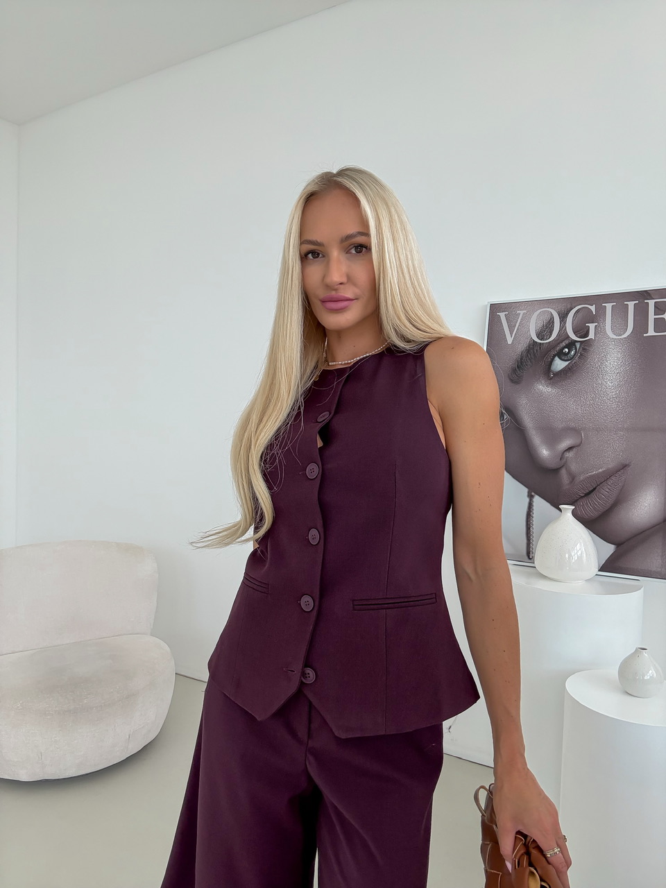 Vesta s jednoradovým zapínaním na gombíky je ideálnym kúskom na doplnenie moderného, ale zároveň nadčasového outfitu. Má okrúhly výstrih, ktorý pôsobí jemne a univerzálne – skvele vynikne samostatne aj v kombinácii s košeľou či tričkom. Precízne spracovanie a čisté línie dodávajú veste sofistikovaný vzhľad, vhodný na bežné nosenie aj formálnejšie príležitosti.