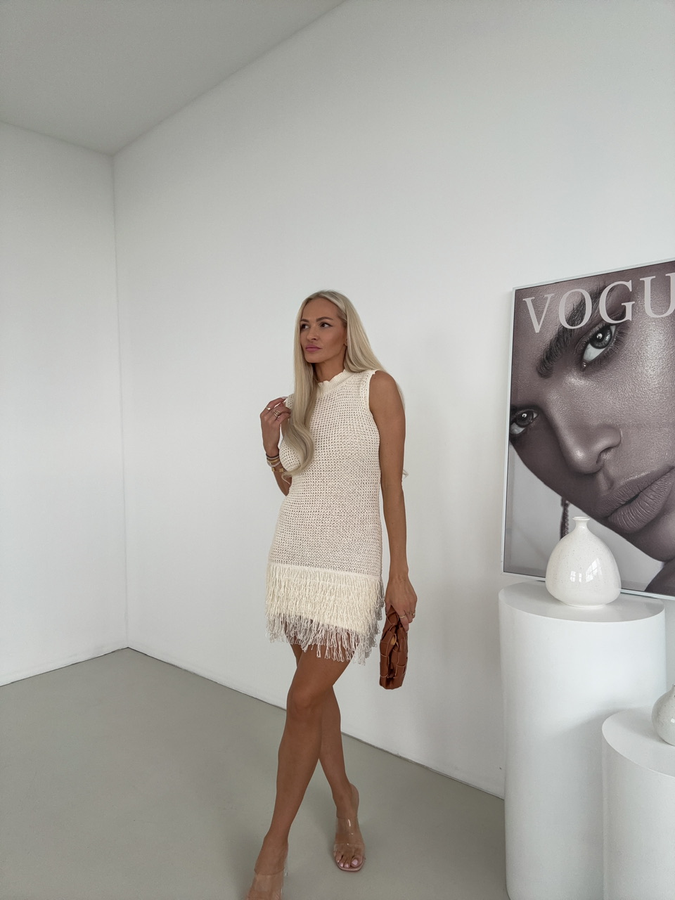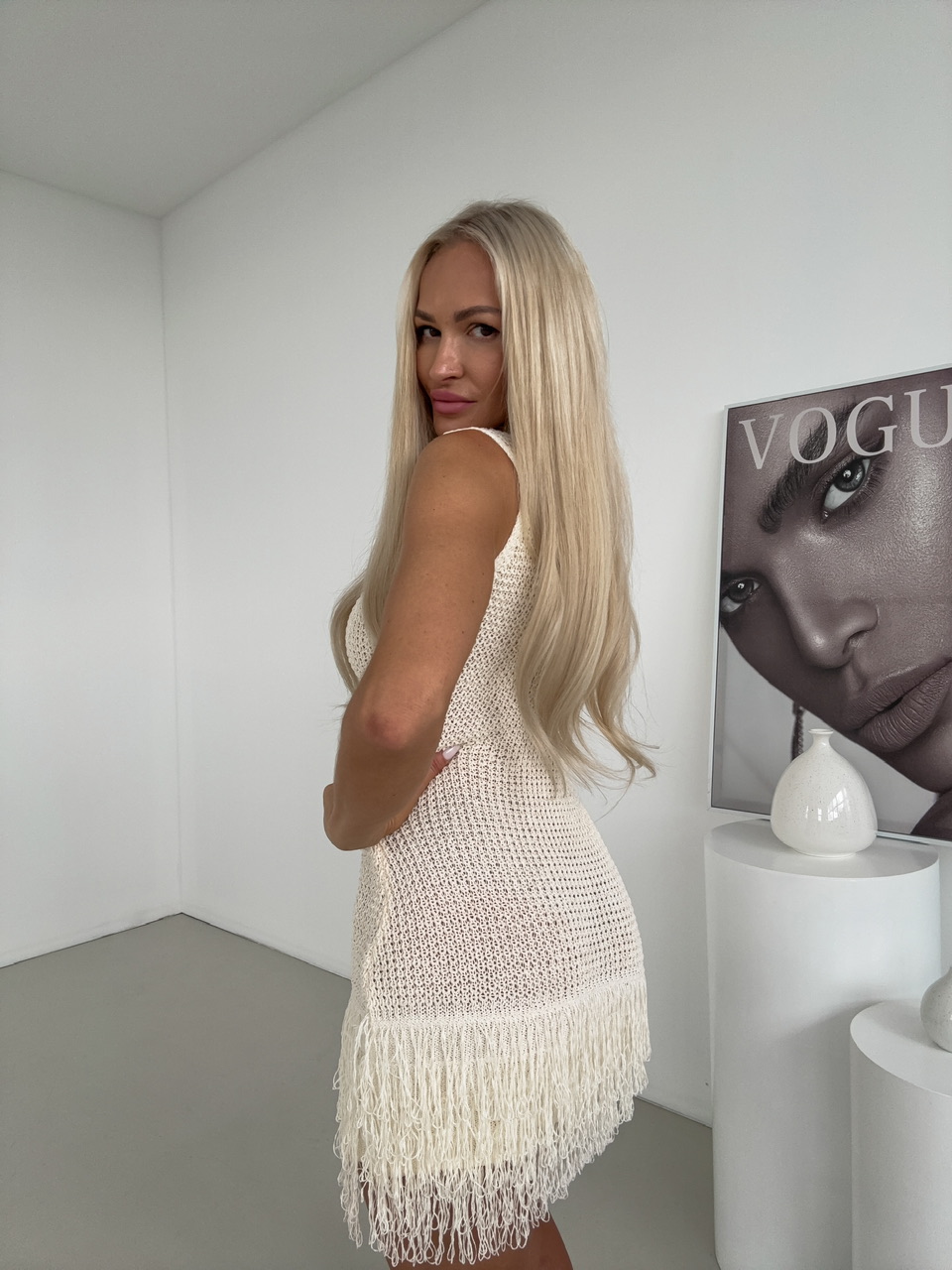 Zvýraznite svoju ženskosť a štýl s týmito pôsobivými pletenými šatami bez rukávov, ktoré kombinujú pohodlie s originálnym dizajnom. Šaty sú vyrobené z elastického pleteného materiálu, ktorý sa krásne prispôsobí postave a jemne zvýrazní siluetu. Majú okrúhly výstrih a čisté línie, ktoré dodávajú modelu elegantný a nadčasový vzhľad. Spodný lem šiat je ozdobený strapcami.