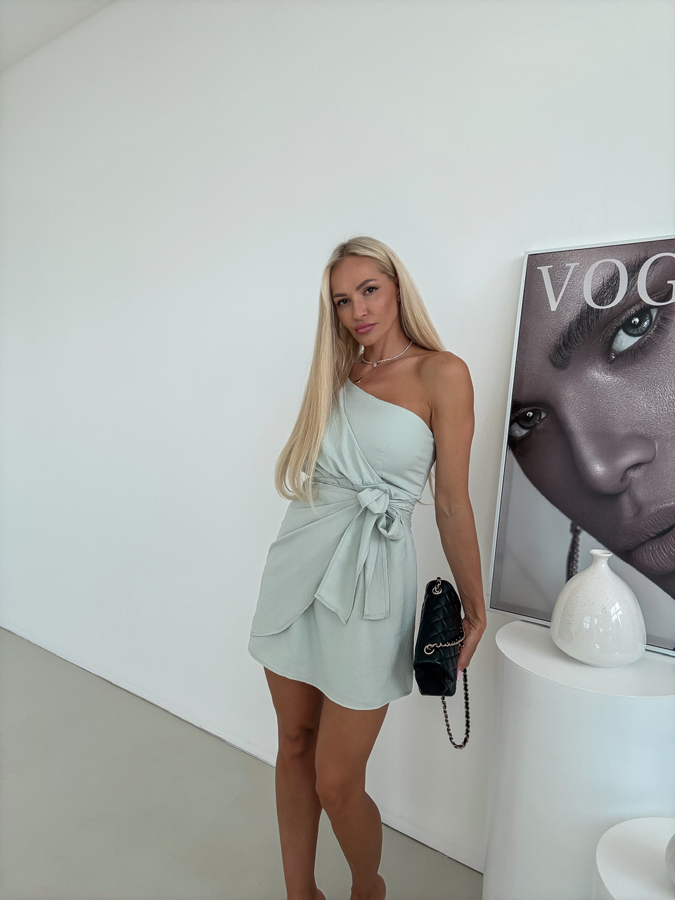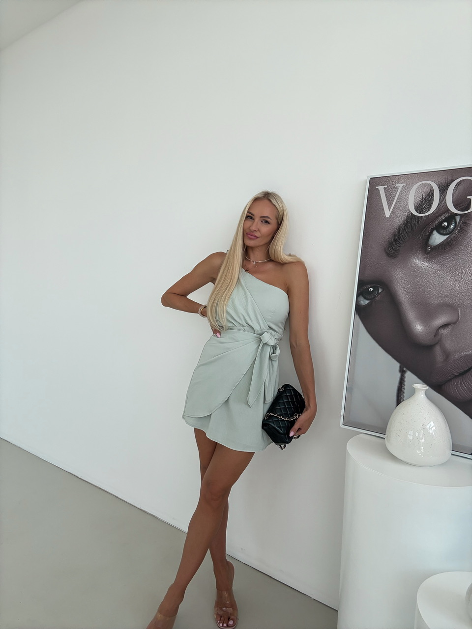 Elegantné asymetrické šaty. Vyznačujú sa moderným strihom s nápadnou asymetriou, ktorá dodáva outfitu originálny šmrnc. V prednej časti sa nachádza jemné viazanie, ktoré zvýrazňuje pás a zároveň umožňuje ľahkú úpravu podľa potreby. Šaty sú podšité pre vyšší komfort pri nosení a lepšie držanie tvaru. Na zadnej strane je diskrétne skryté zapínanie na zips, ktoré nenarušuje celkový dizajn. Čiastočne elastické prešitie na chrbte zabezpečuje flexibilitu a lepšie prispôsobenie postave.