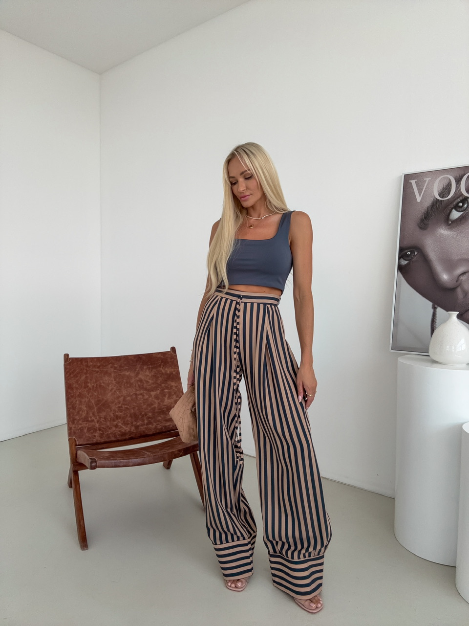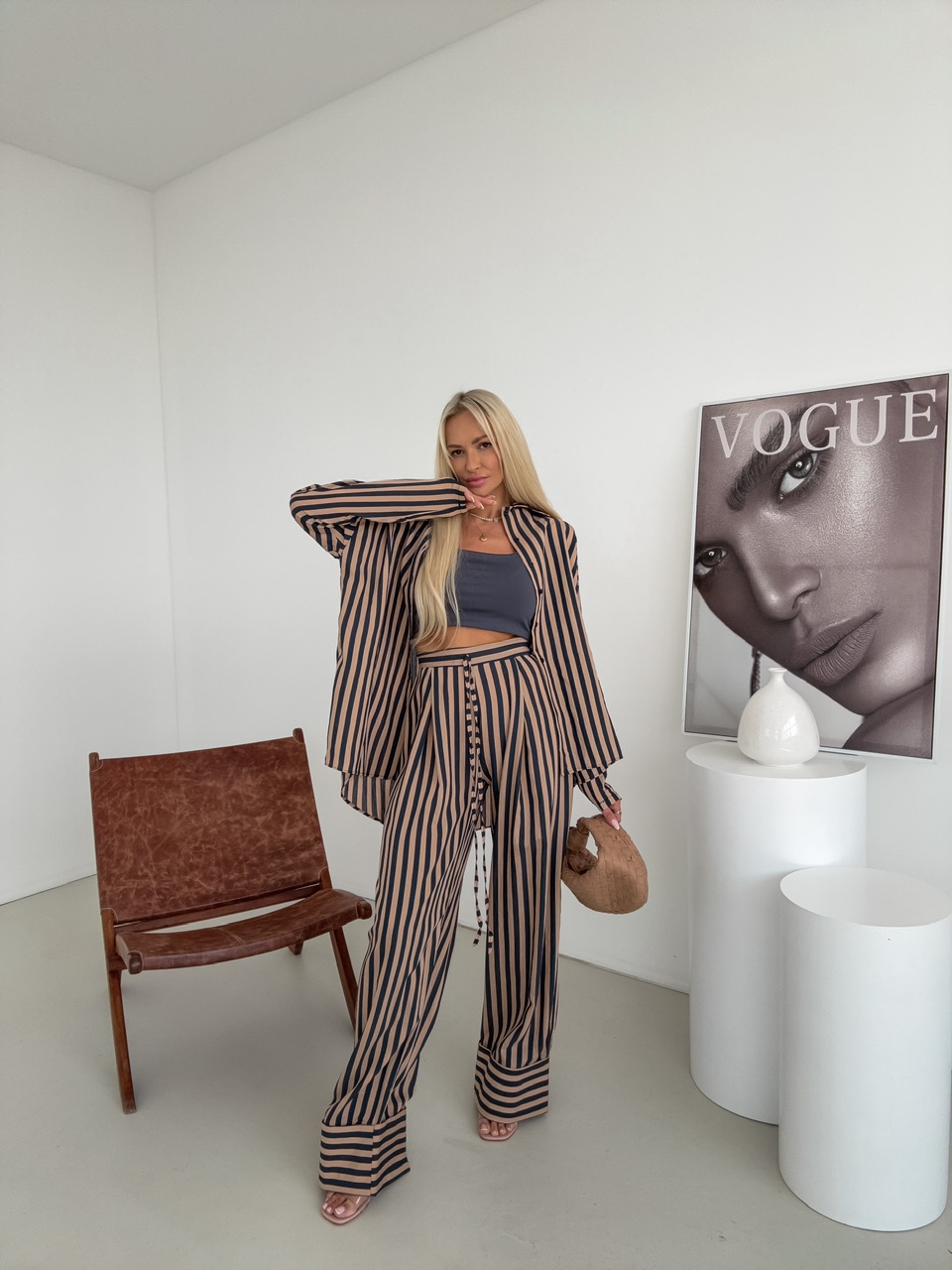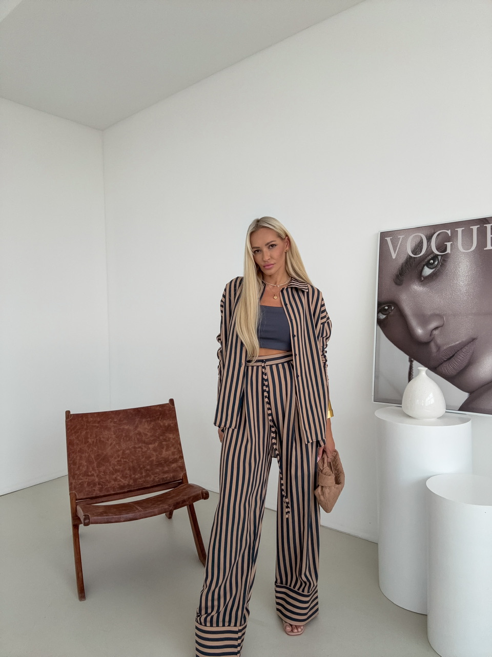 Tento štýlový set pozostávajúci z oversize košele a pohodlných nohavíc je ideálnou kombináciou ležérnej elegancie a komfortu. Košeľa v oversize strihu pôsobí moderne a uvoľnene. Jednoradové zapínanie na gombíky dodáva modelu klasický akcent, zatiaľ čo voľnejší strih zabezpečuje maximálne pohodlie a voľnosť pohybu. Nohavice sú navrhnuté s dôrazom na pohodlie a ženský siluetový efekt. Elastický pás sa prispôsobí postave, zatiaľ čo bočné zapínanie na zips zaručuje čistý, elegantný vzhľad bez rušivých prvkov.