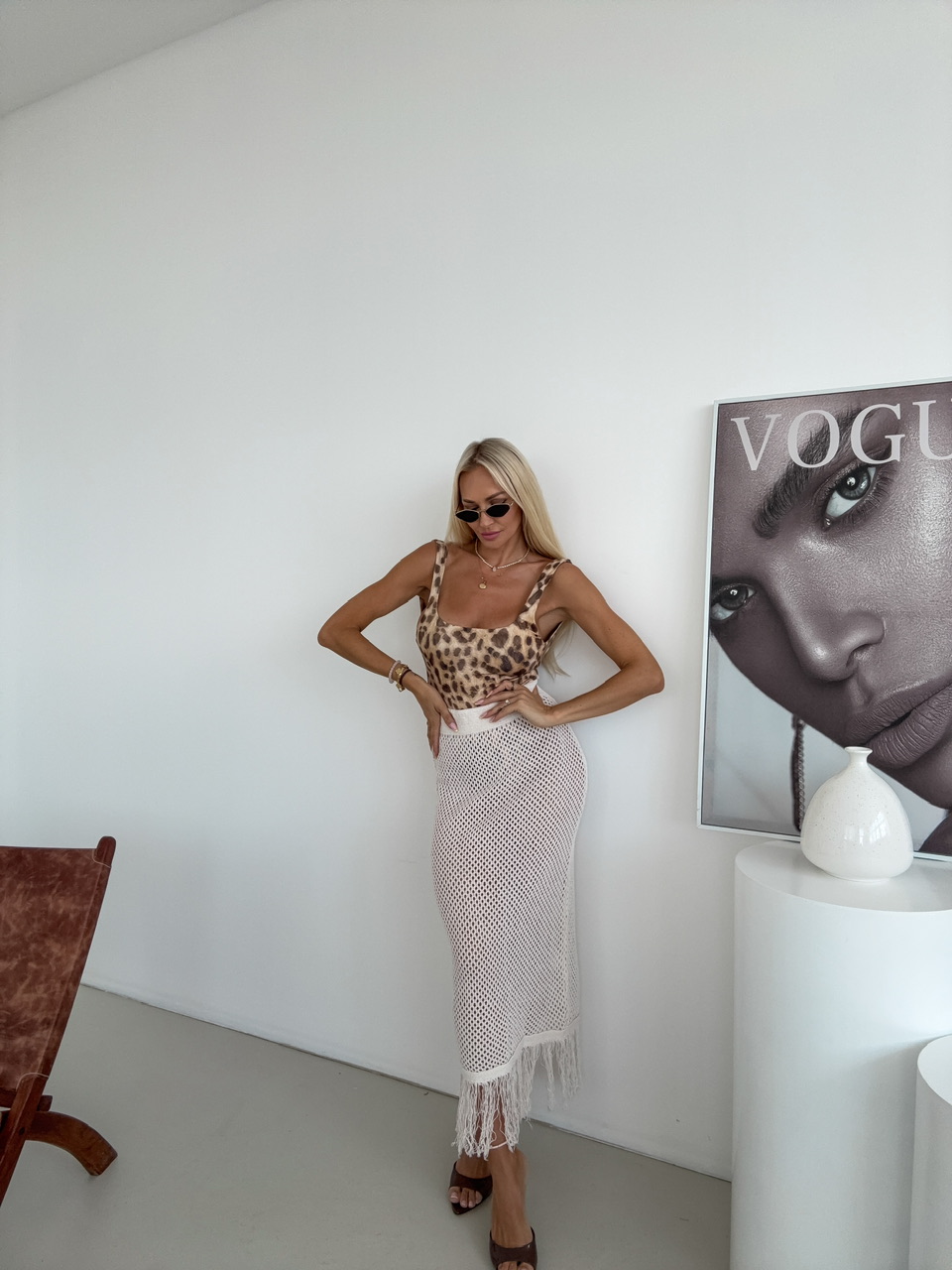 Pohodlná a dokonale letná – táto sukňa s elastickým pásom na gumu je ideálnou voľbou na horúce dni. Vyrobená z ľahkého materiálu s efektom dierkovania, ktorý dodáva celkovému vzhľadu hravosť a zároveň zabezpečuje príjemnú priedušnosť. Sukňa má ležérny strih a spodok zdobia štýlové strapce, ktoré jej dodávajú dynamiku a osobitý šarm. Perfektná na bežné nosenie, dovolenku aj ako plážový kúsok – stačí ju prehodiť cez plavky a môžete vyraziť.