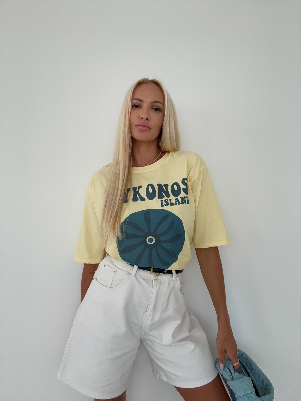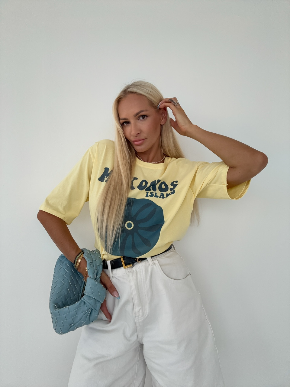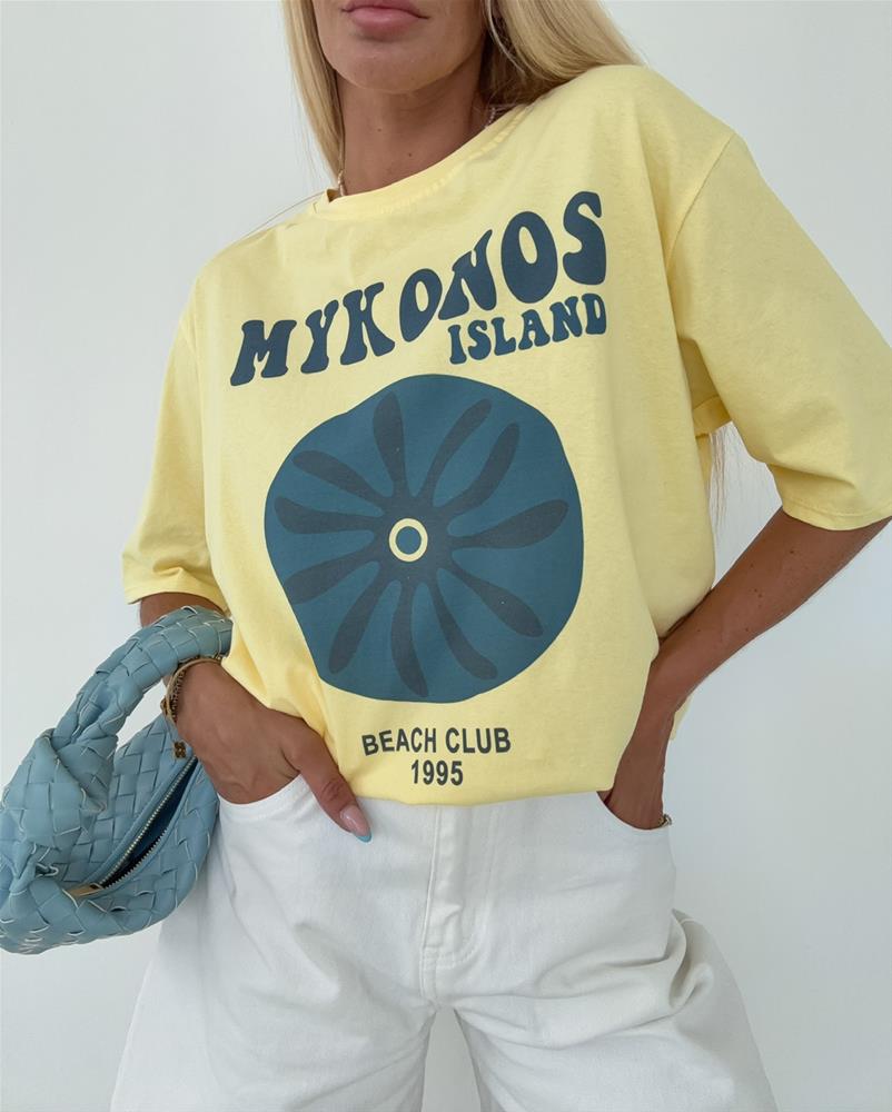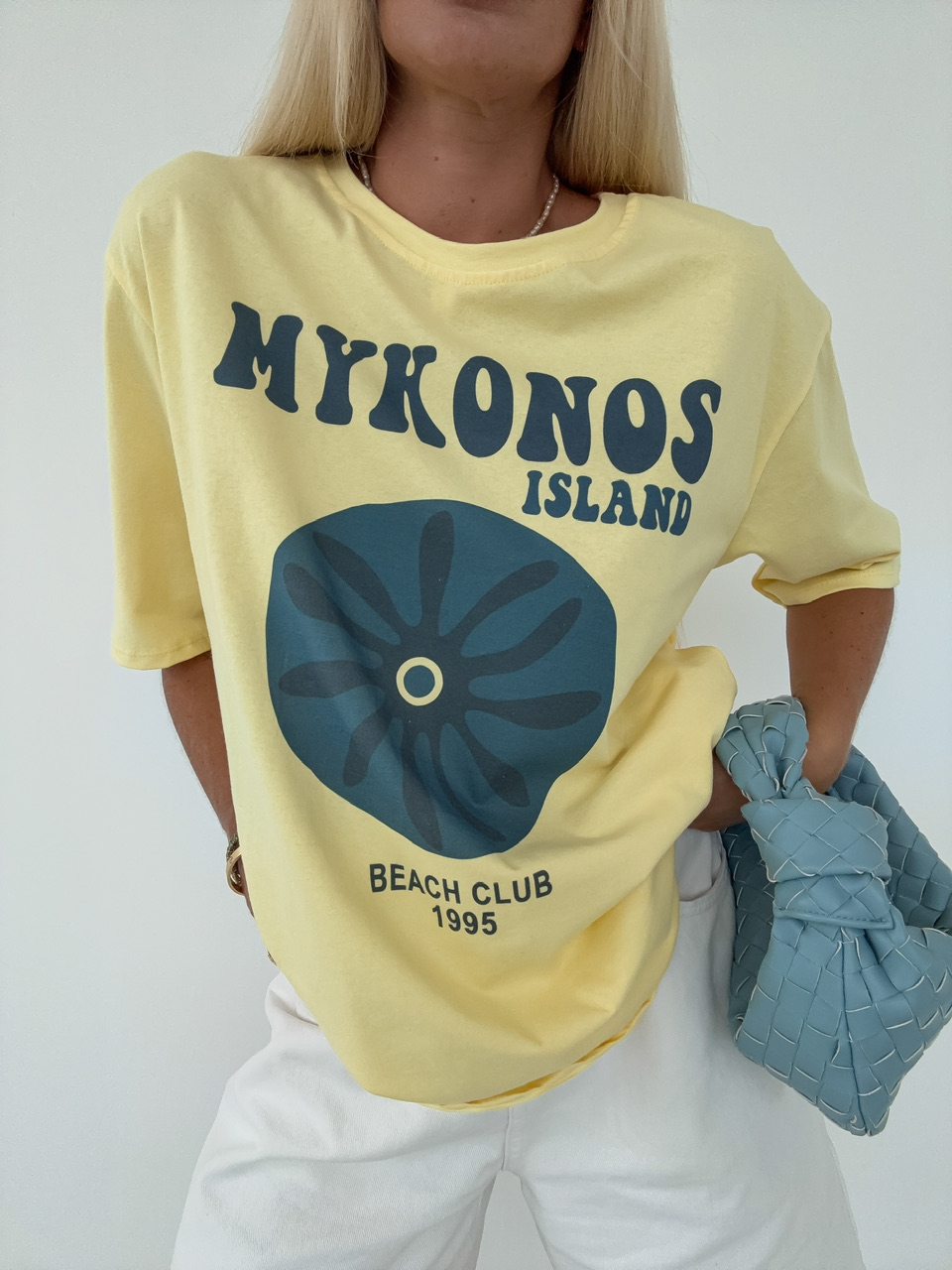 Prines do svojho šatníka dovolenkovú atmosféru s týmto štýlovým tričkom s krátkym rukávom. Na prednej strane ho zdobí trendový nápis „Mykonos Island Beach Club 1995“. Vyrobené z príjemného a priedušného materiálu, je ideálne na horúce dni, cestovanie aj ležérne mestské outfity. Skvelo sa hodí k džínsom, šortkám či sukniam – nos ho vo svojom vlastnom štýle.