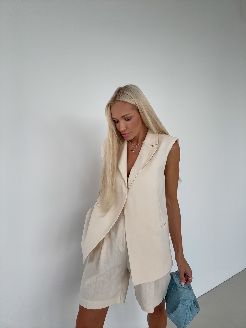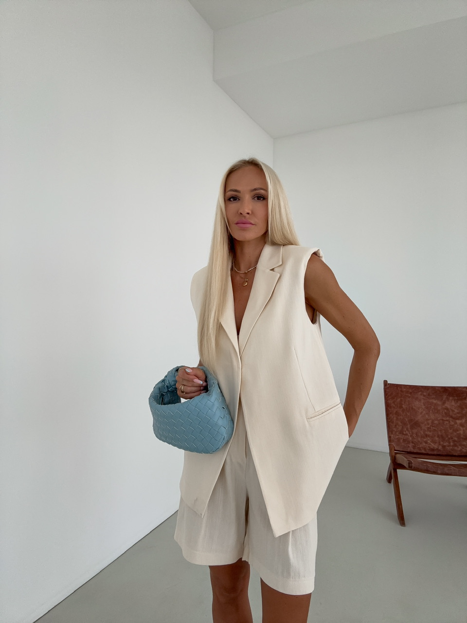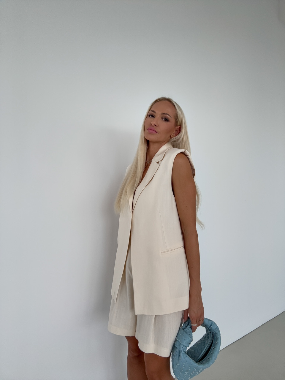 Elegantná predĺžená vesta s vypchávkami na pleciach. Dodajte svojmu outfitu šmrnc s touto štýlovou predĺženou vestou, ktorá vyniká čistými líniami a nadčasovým dizajnom. Vesta má sofistikované vypchávky na pleciach, ktoré jej dodávajú elegantný tvar a jemne zvýrazňujú siluetu. Zapínanie na jeden výrazný gombík v prednej časti zabezpečuje minimalistický, ale zároveň efektný vzhľad. Model je plne podšitý pre pohodlie a lepšie držanie tvaru.