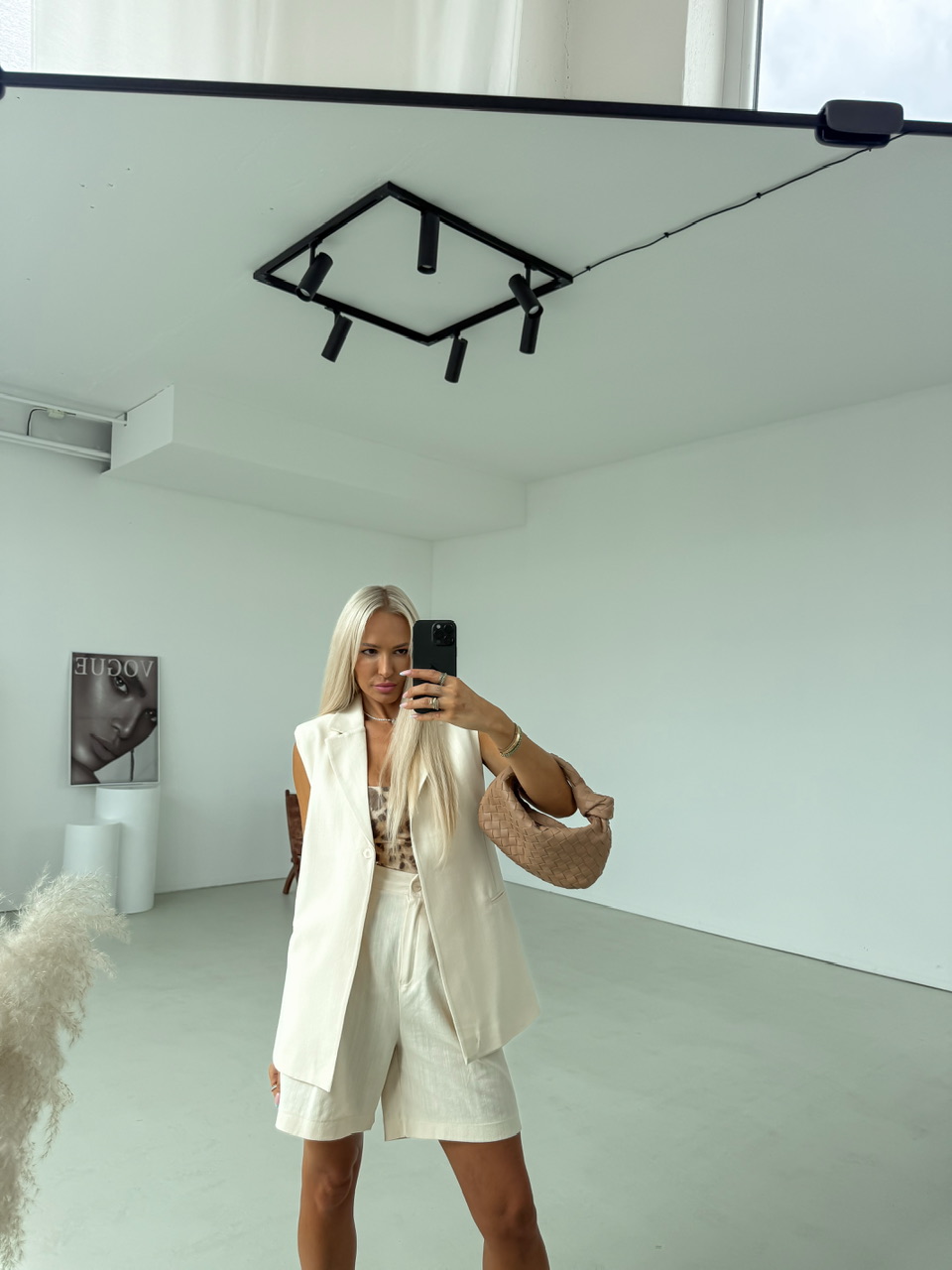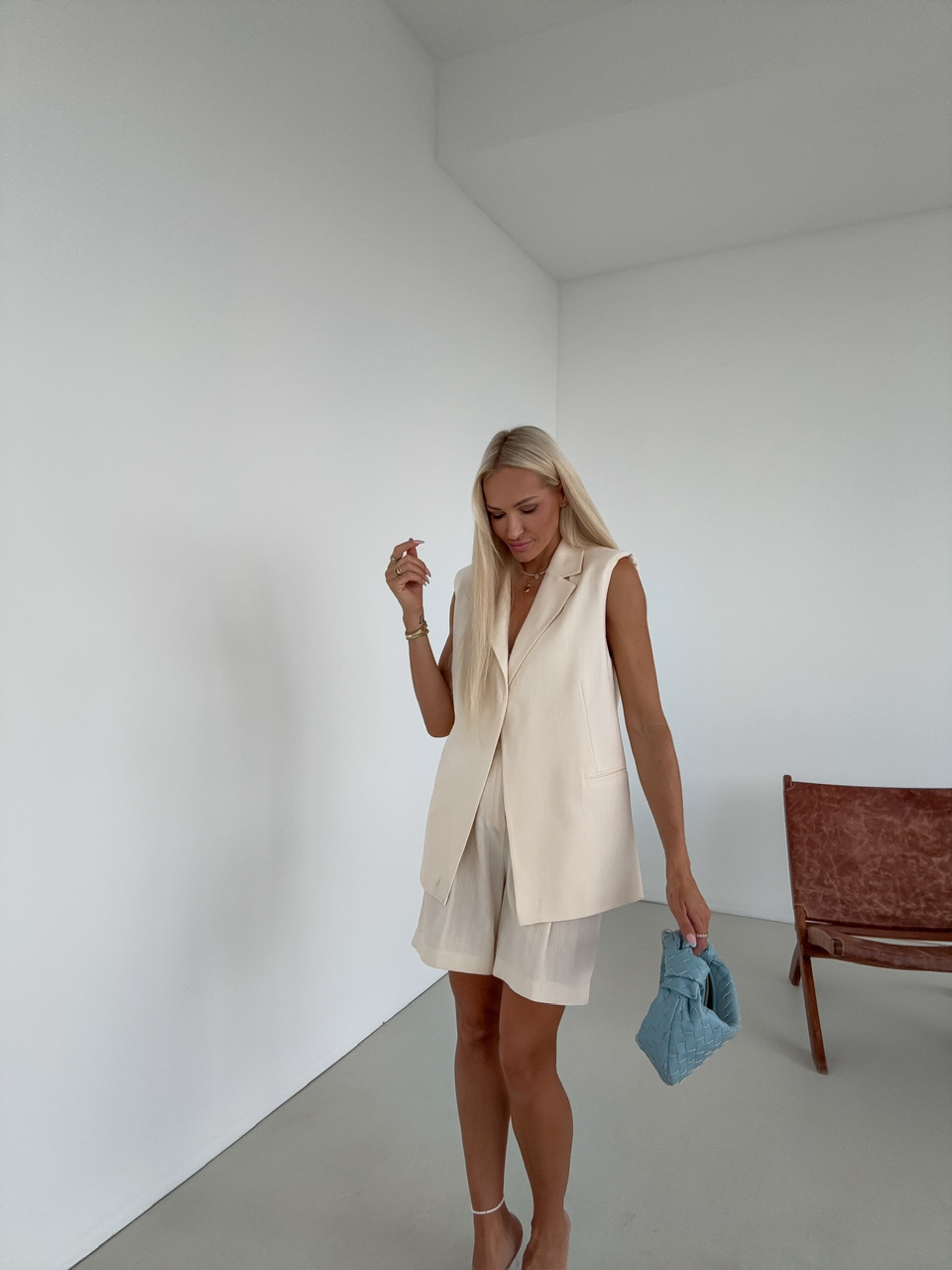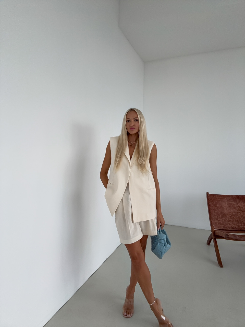 Elegantná predĺžená vesta s vypchávkami na pleciach. Dodajte svojmu outfitu šmrnc s touto štýlovou predĺženou vestou, ktorá vyniká čistými líniami a nadčasovým dizajnom. Vesta má sofistikované vypchávky na pleciach, ktoré jej dodávajú elegantný tvar a jemne zvýrazňujú siluetu. Zapínanie na jeden výrazný gombík v prednej časti zabezpečuje minimalistický, ale zároveň efektný vzhľad. Model je plne podšitý pre pohodlie a lepšie držanie tvaru.