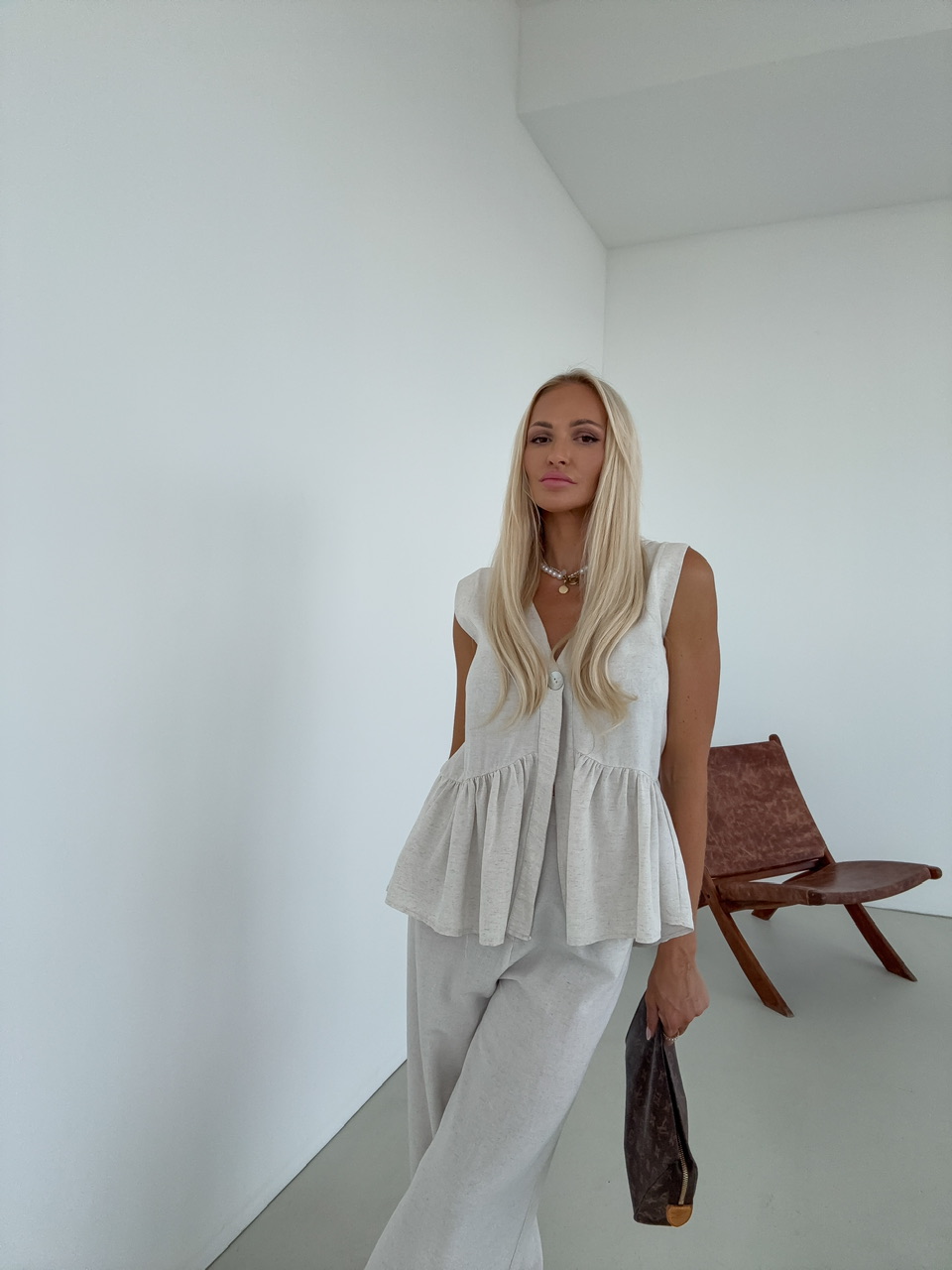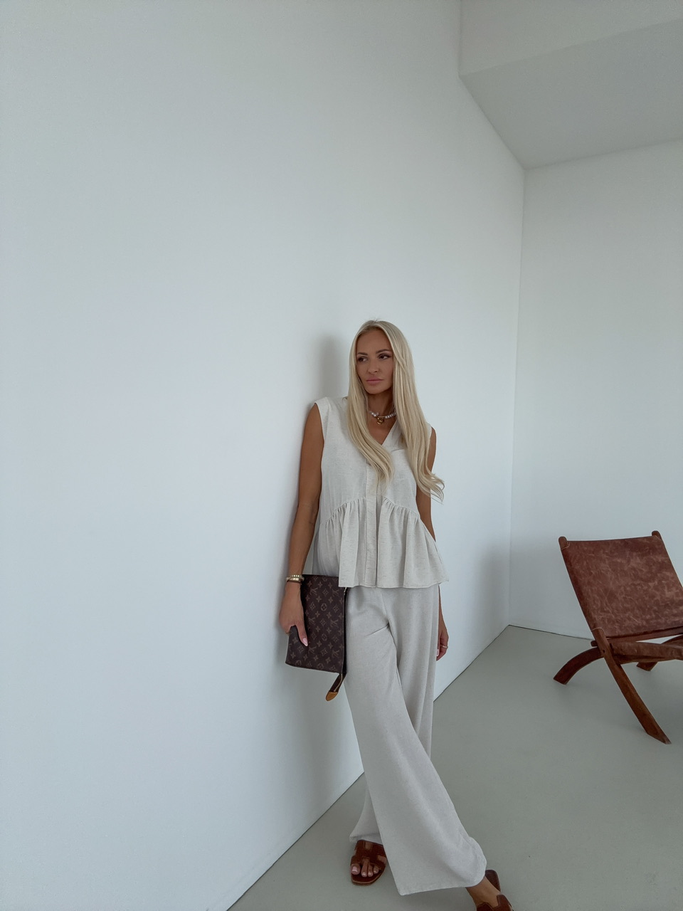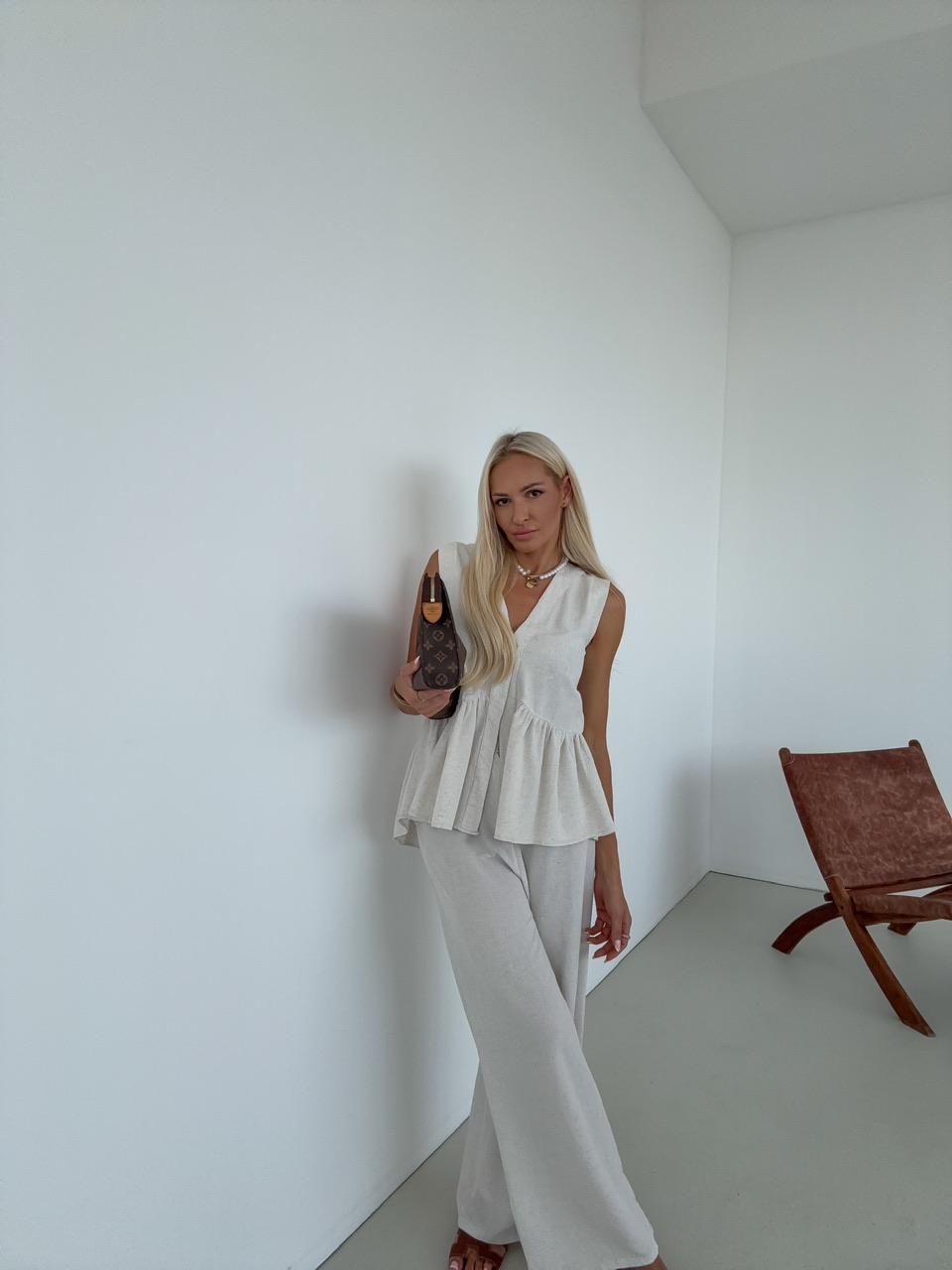 Elegantný dámsky komplet. Tento sofistikovaný komplet je navrhnutý pre ženy, ktoré milujú eleganciu spojenú s pohodlím. Skladá sa z jemne prepracovaného topu s véčkovým výstrihom, ktorý krásne zvýrazňuje dekolt. Top sa zapína na jeden decentný gombík, čo dodáva celkovému vzhľadu čistotu a ženskosť. Nohavice majú moderný strih s čiastočne elastickým pásom, vďaka čomu perfektne sadnú a prispôsobia sa postave. Zapínanie na zips a gombík zabezpečuje klasický, upravený vzhľad, zatiaľ čo praktické bočné vrecká pridávajú na funkčnosti.