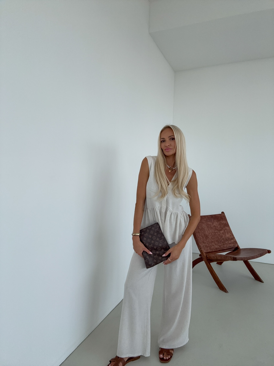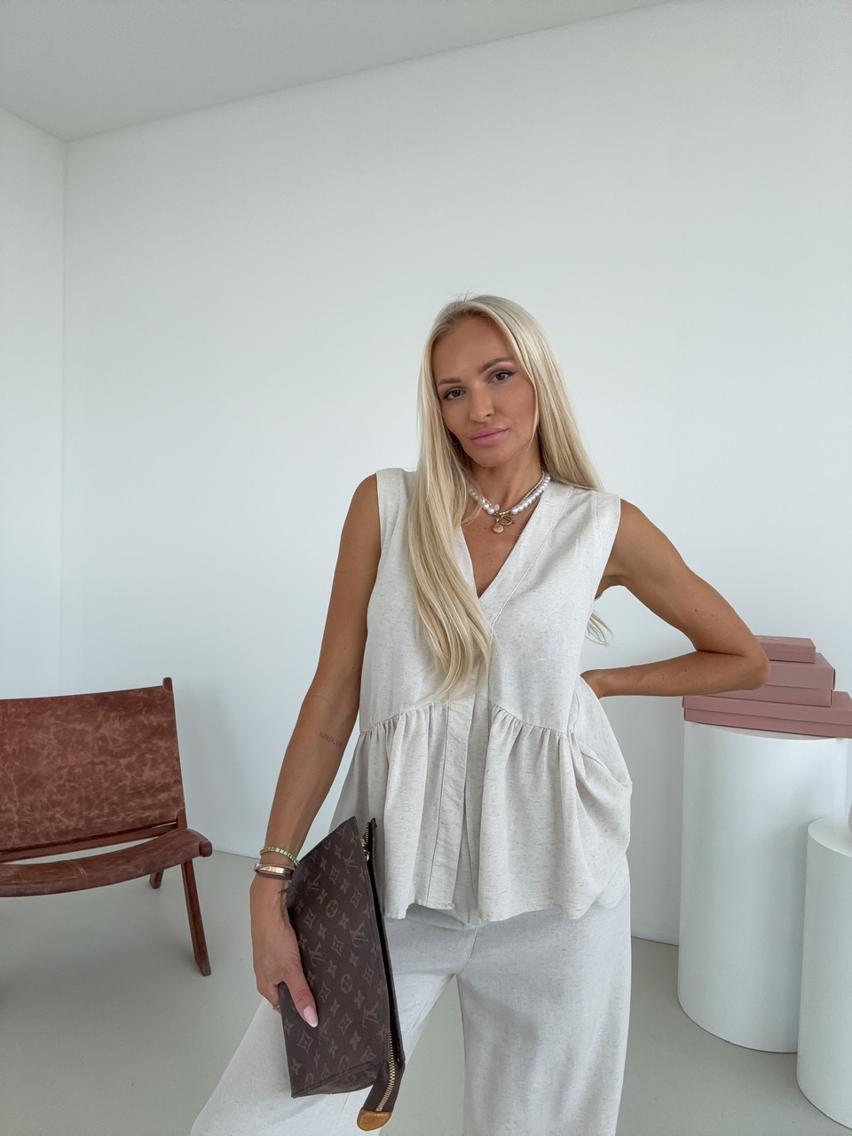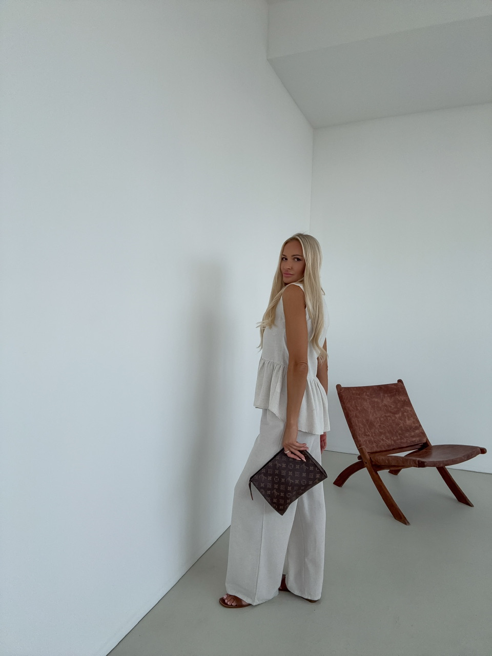 Elegantný dámsky komplet. Tento sofistikovaný komplet je navrhnutý pre ženy, ktoré milujú eleganciu spojenú s pohodlím. Skladá sa z jemne prepracovaného topu s véčkovým výstrihom, ktorý krásne zvýrazňuje dekolt. Top sa zapína na jeden decentný gombík, čo dodáva celkovému vzhľadu čistotu a ženskosť. Nohavice majú moderný strih s čiastočne elastickým pásom, vďaka čomu perfektne sadnú a prispôsobia sa postave. Zapínanie na zips a gombík zabezpečuje klasický, upravený vzhľad, zatiaľ čo praktické bočné vrecká pridávajú na funkčnosti.