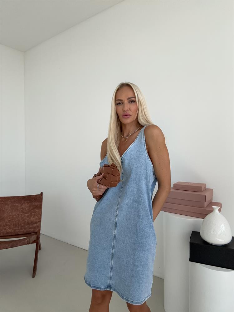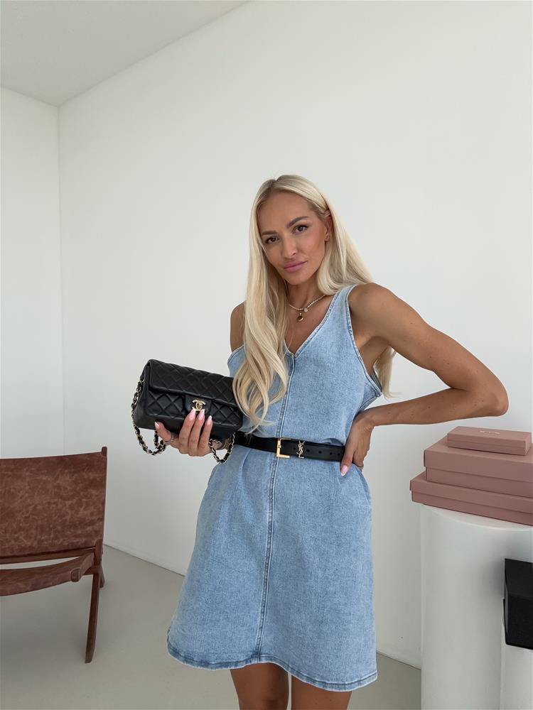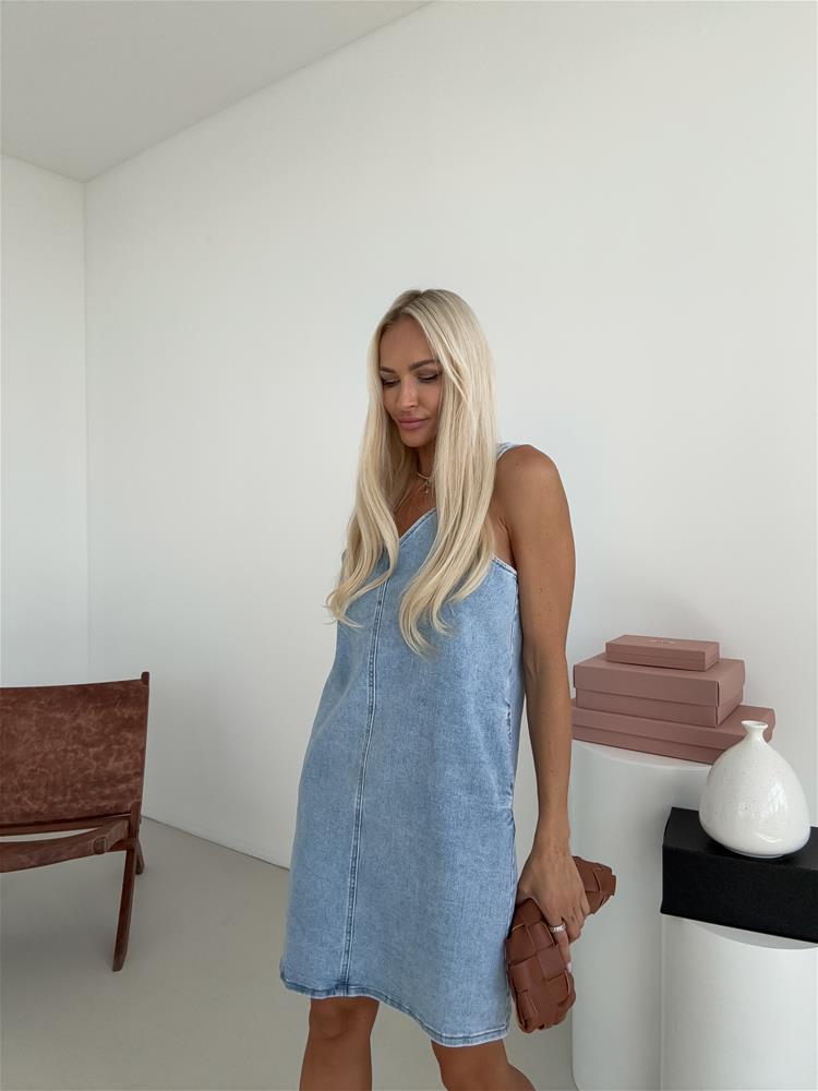 Ležérne a trendy rifľové mini šaty v svetlomodrom odtieni sú ideálnym kúskom na teplé dni. Jednoduchý strih na široké ramienka, pohodlný materiál z ľahkého denimu a nenápadný šev uprostred dodávajú šatám moderný vzhľad. Vzadu sa zapínajú na zips, čo uľahčuje obliekanie a majú dve praktické bočné vrecká.