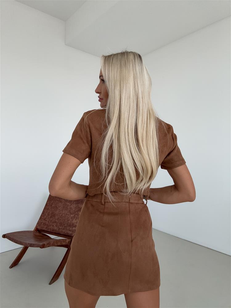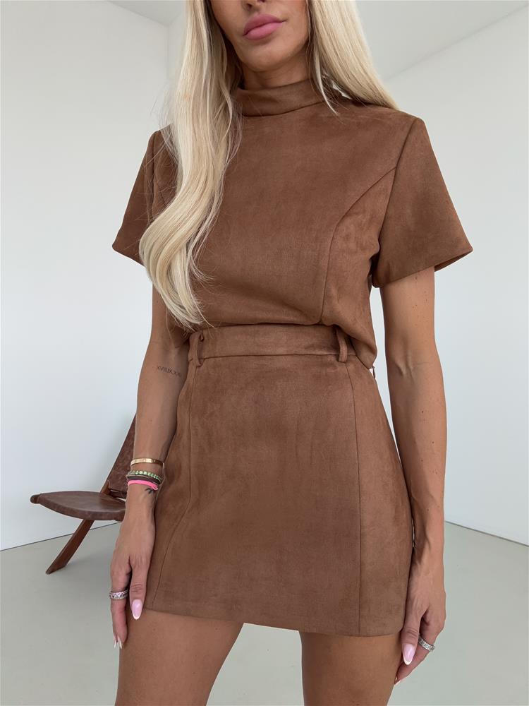 Štýlová puzdrová sukňa z jemného semišového materiálu. Priliehavý strih krásne kopíruje postavu a zvýrazní ženské krivky, zatiaľ čo hladký dizajn bez zbytočných ozdôb pôsobí sofistikovane. Sukňa má zadné zapínanie na zips pútka na opasok, čo umožňuje doladiť outfit podľa vlastného štýlu.