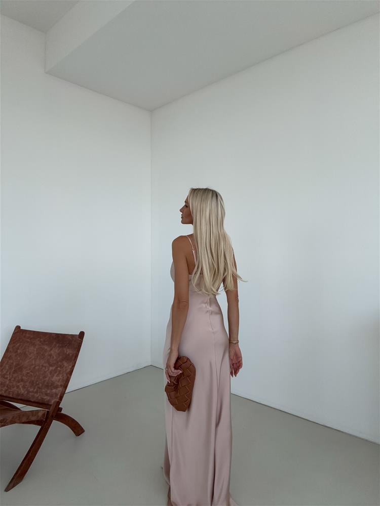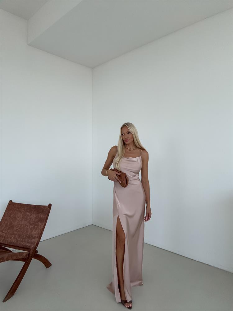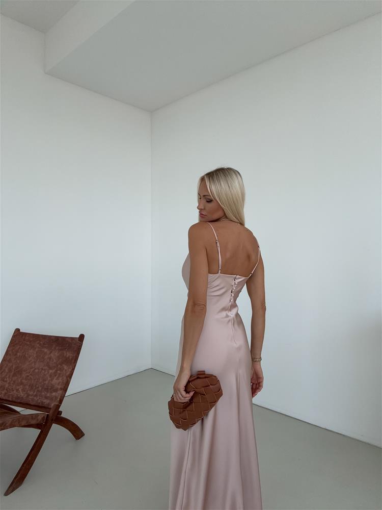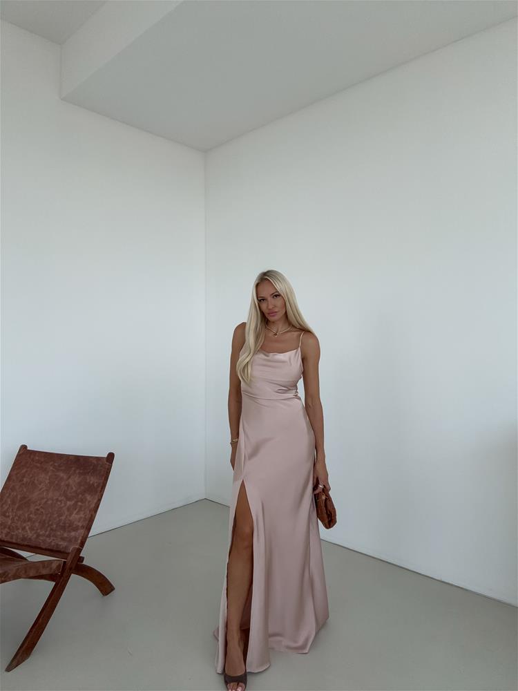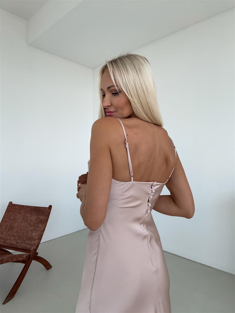 Elegantné maxi šaty zo splývavého saténového materiálu. Šaty majú ženský priliehavý strih, hlboký bočný rozparok, ktorý lichotí postave, a zapínanie na drobné látkové gombíky na chrbáte, čo im dodáva sofistikovaný nádych. Nastaviteľné tenké ramienka zabezpečujú dokonalé prispôsobenie. Saténová textúra jemne odráža svetlo, vďaka čomu šaty pôsobia luxusne a romanticky – ideálne na večerné udalosti, svadby či špeciálne príležitosti.