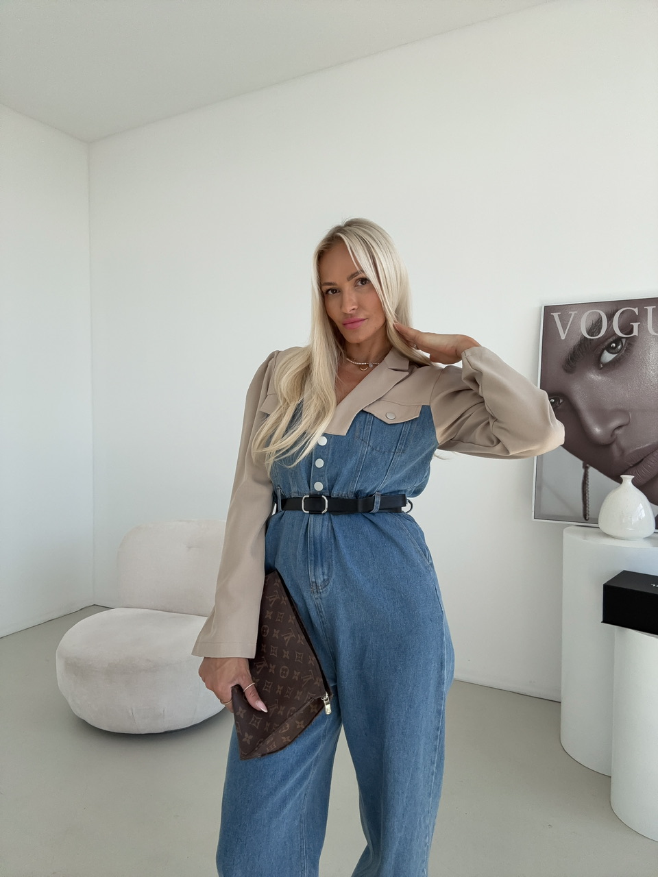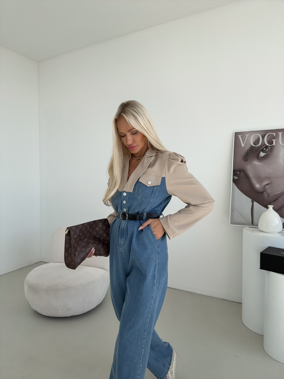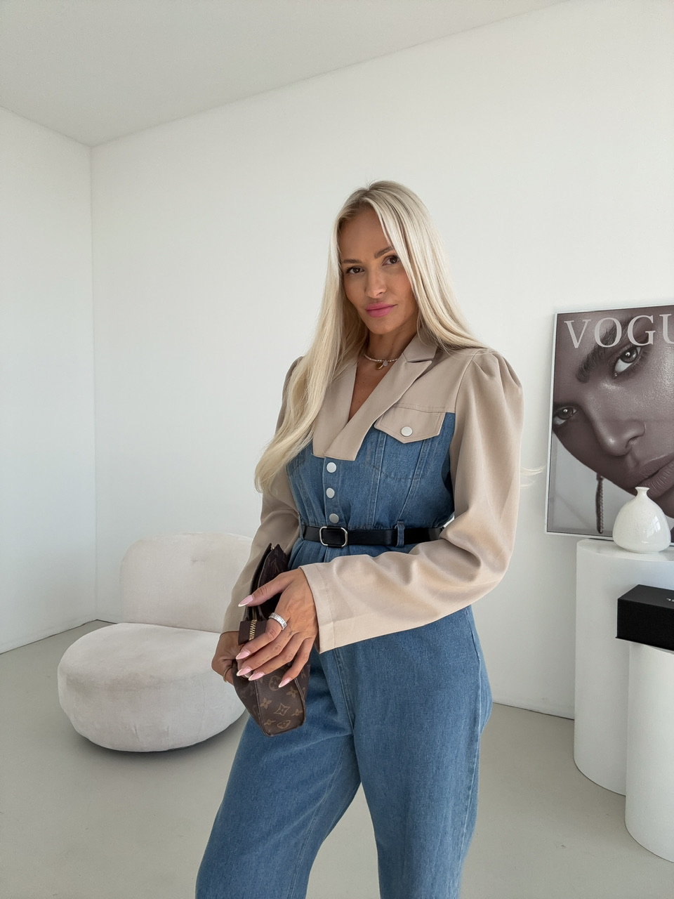 Štýlový denimový overal s kontrastnou béžovou hornou časťou, ktorý spája pohodlie džínsoviny so šmrncom košele. Overal má zapínanie na výrazné kovové gombíky a praktické vrecká, ktoré mu dodávajú ležérny aj funkčný vzhľad. Béžový golier a náprsné vrecká s klopou zvýrazňujú moderný westernový nádych. Súčsťou je aj opasok.