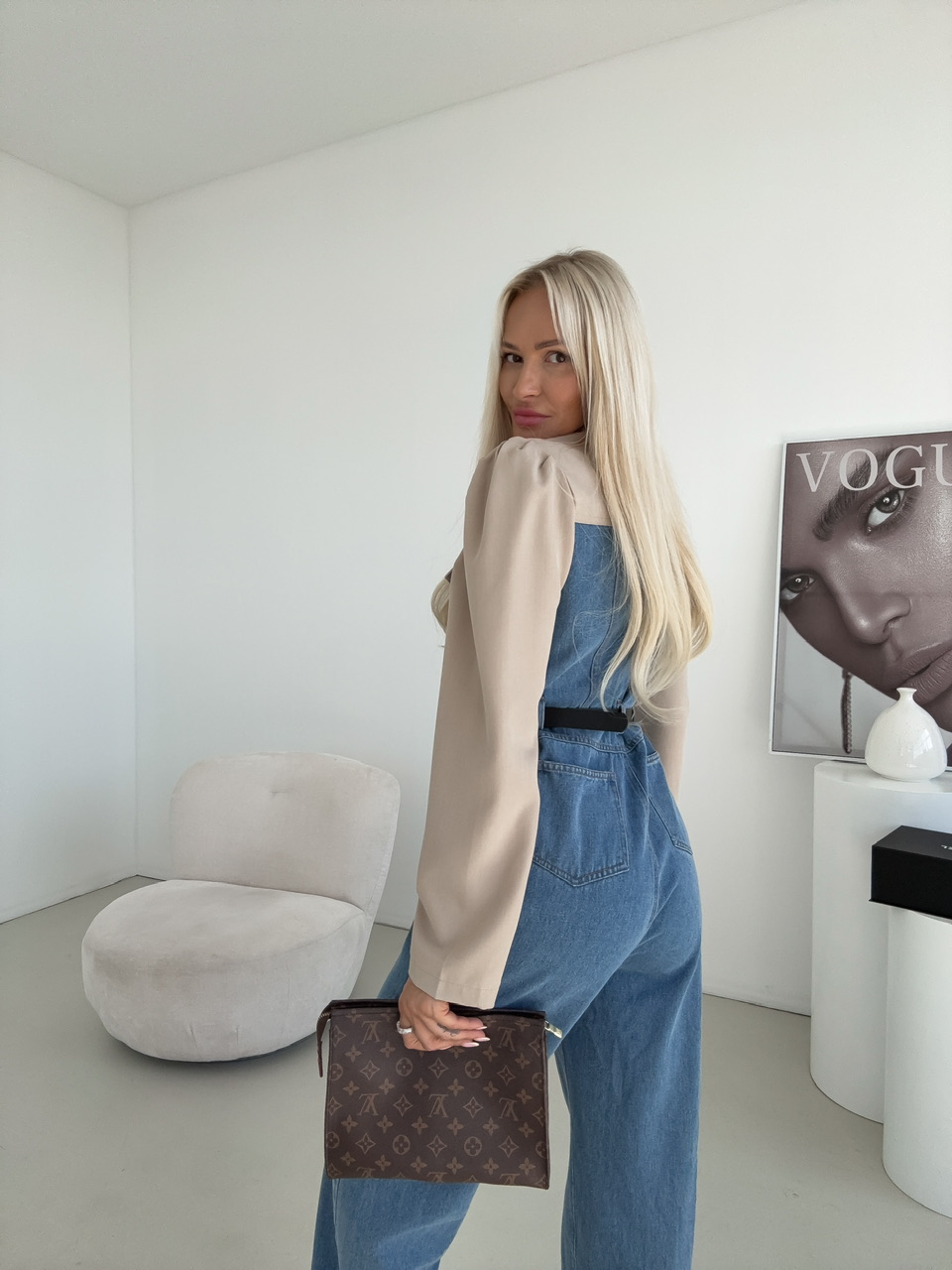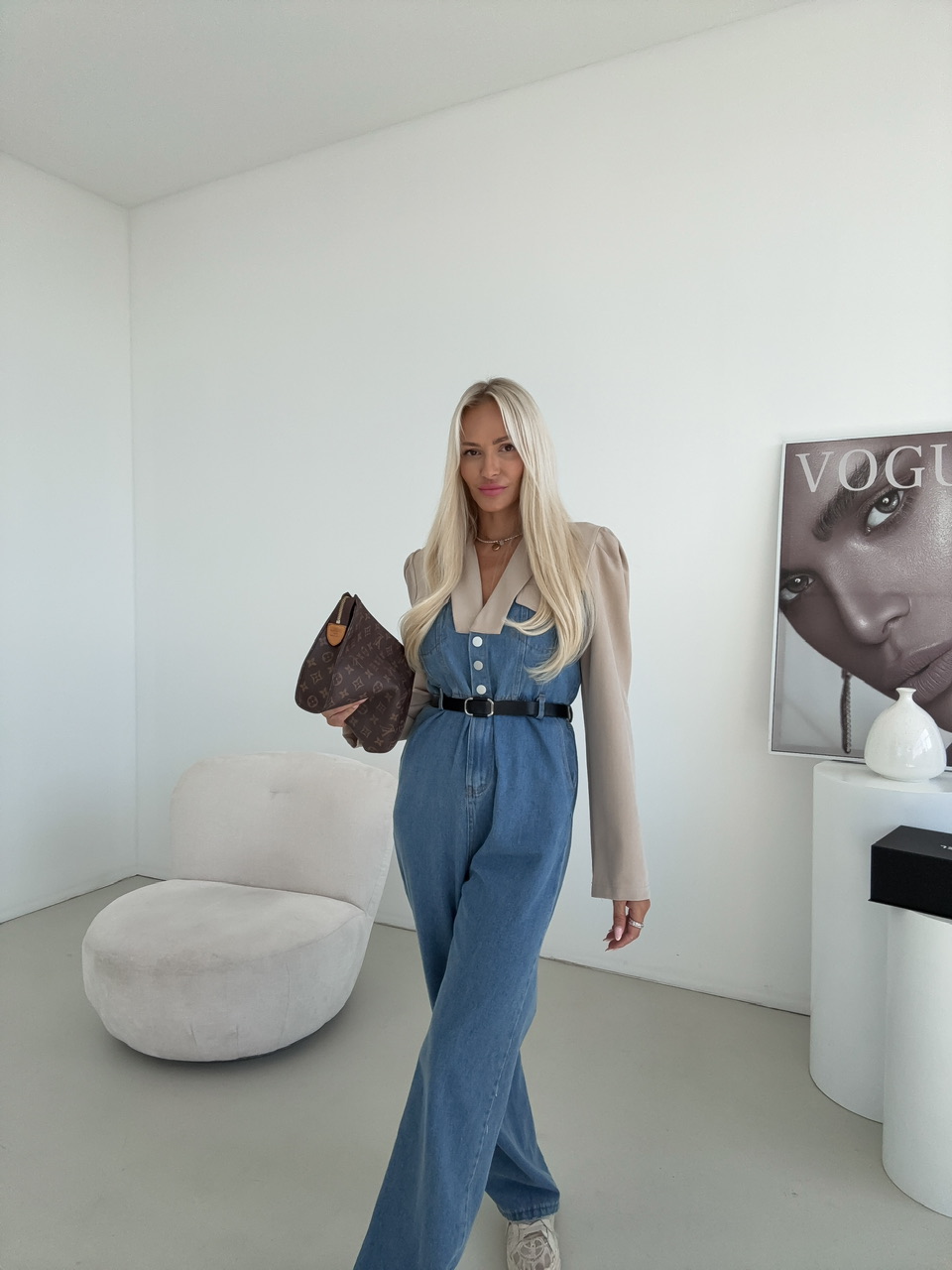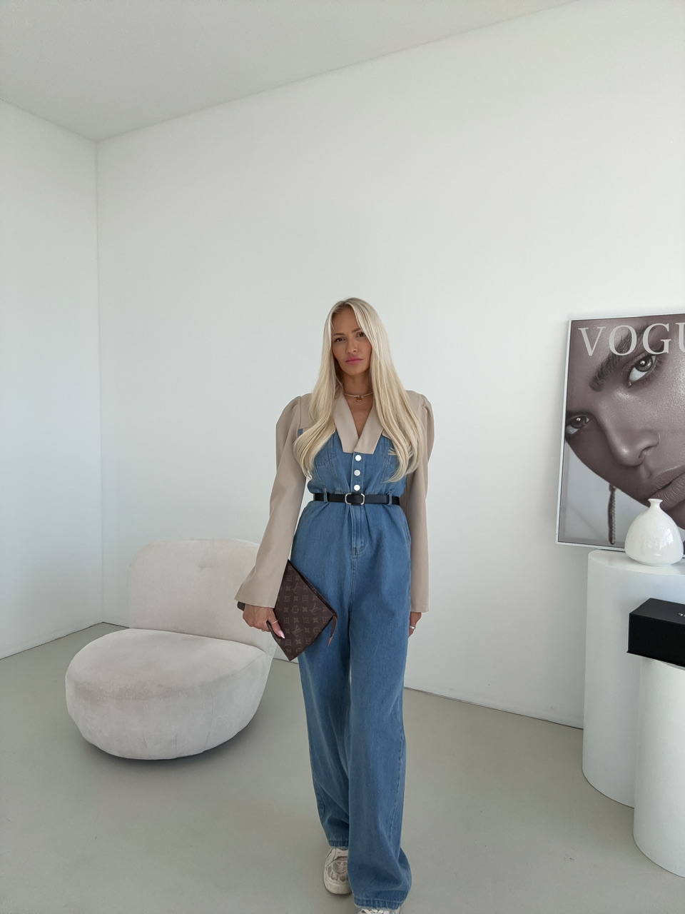 Štýlový denimový overal s kontrastnou béžovou hornou časťou, ktorý spája pohodlie džínsoviny so šmrncom košele. Overal má zapínanie na výrazné kovové gombíky a praktické vrecká, ktoré mu dodávajú ležérny aj funkčný vzhľad. Béžový golier a náprsné vrecká s klopou zvýrazňujú moderný westernový nádych. Súčsťou je aj opasok.