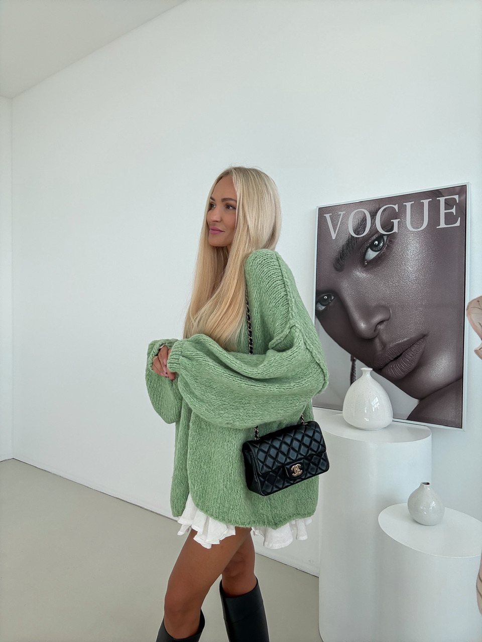 Oversize kardigán s balónovým rukávom a dlhým strihom.