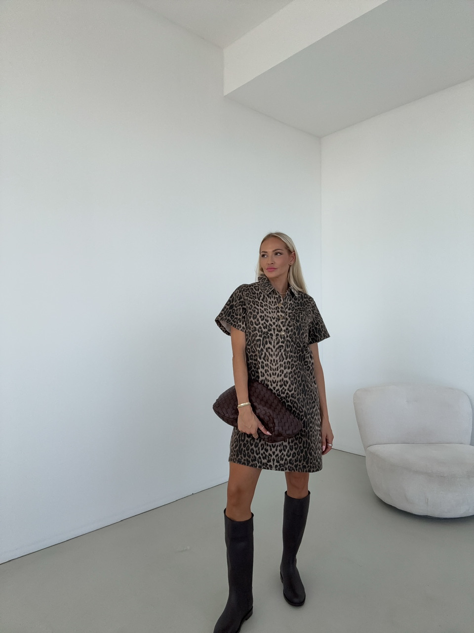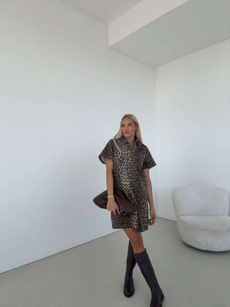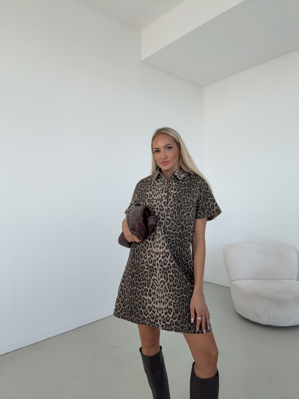 Buďte neprehliadnuteľná v štýlových košeľových šatách s výrazným leopardím vzorom. Tento kúsok spája nadčasový dizajn s odvážnym lookom, ktorý dodá sebavedomie a šmrnc pri každej príležitosti. Košeľový strih so zapínaním na gombíky v prednej časti. Tieto šaty môžete nosiť samostatne alebo doladiť opaskom pre zvýraznenie postavy. Skvele sa hodia k teniskám na ležérny deň aj k lodičkám pre sofistikovaný look.