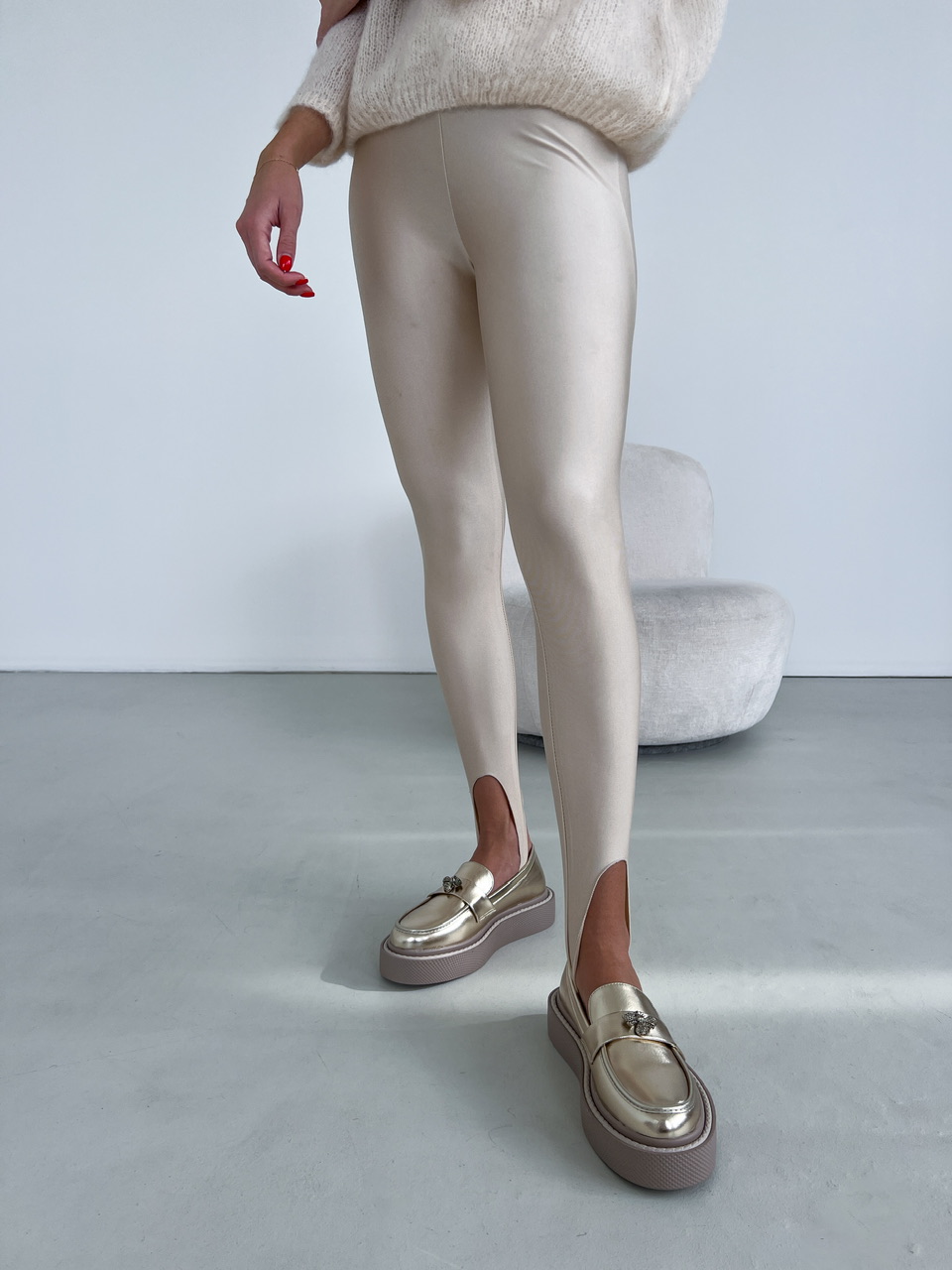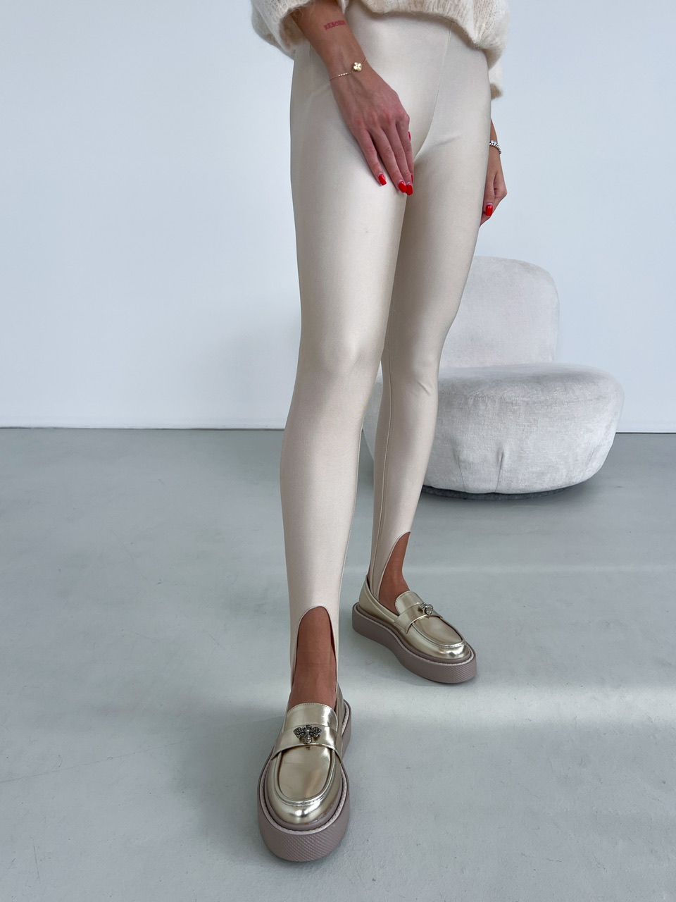 Zlaté topánky na rovnej, mierne vyvýšenej podrážke (cca 3 cm). Predná časť je zdobená výraznou kovovou aplikáciou.