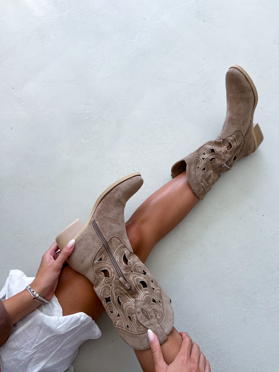 Semišové nasúvacie čižmy na nízkom podpätku (cca 4 cm). Vrchná časť sáry je volnejšieho strihu, zdobená ornamentovým prešívaním a dierkovaním. Z vnútornej bočnej strany je polovičný zips na zapínanie. Po bočných stranách sú ozdobné putká.