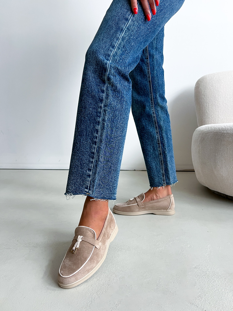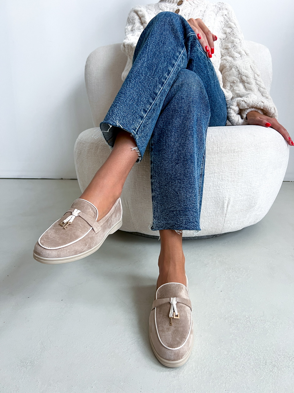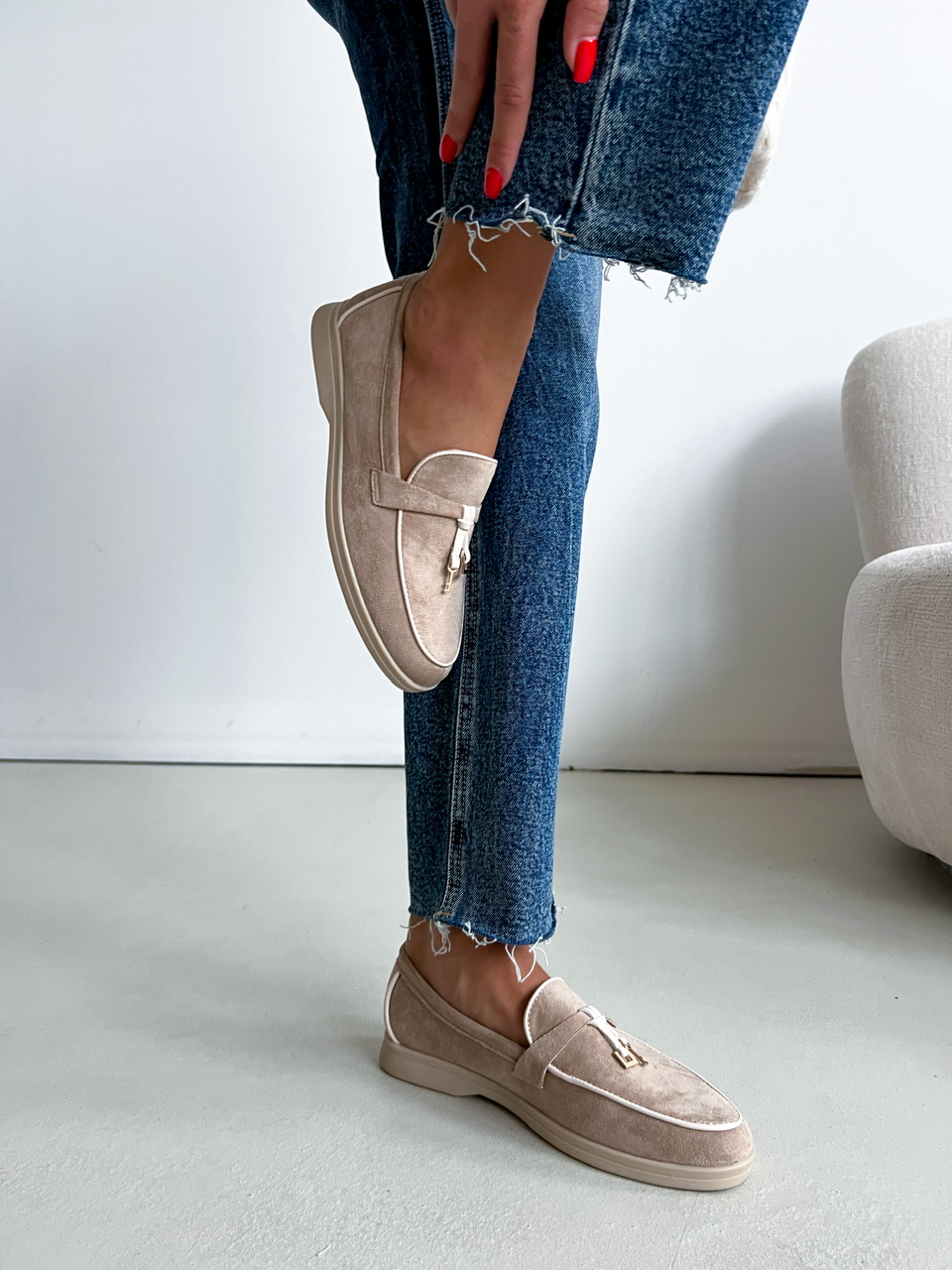 Béžové topánky na nízkej podrážke. Zvršok je semišového materiálu. Vrchná časť je zdobená krémovým lemovaním a zlatými aplikáciami.