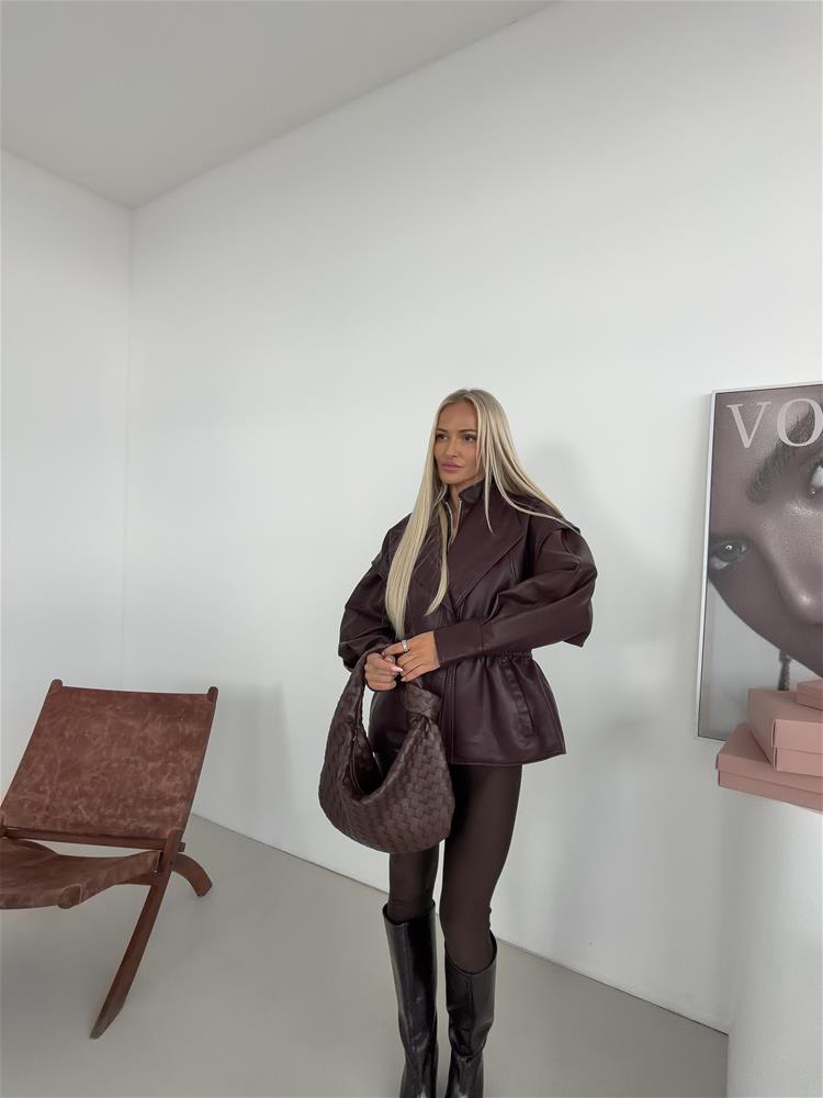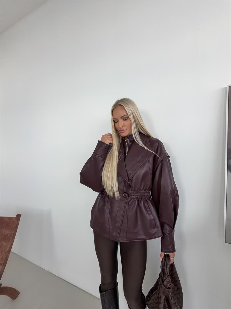 Štýlová kožená, ktorý dodá vášmu outfitu šmrnc. Má výrazný golier, elastické riasenie v páse pre zvýraznenie siluety a praktické zapínanie na zips doplnené o gombík. Ideálna na prechodné obdobie – hodí sa k nohaviciam aj šatám. Táto bunda spája eleganciu a praktickosť – stane sa univerzálnym kúskom vášho šatníka.