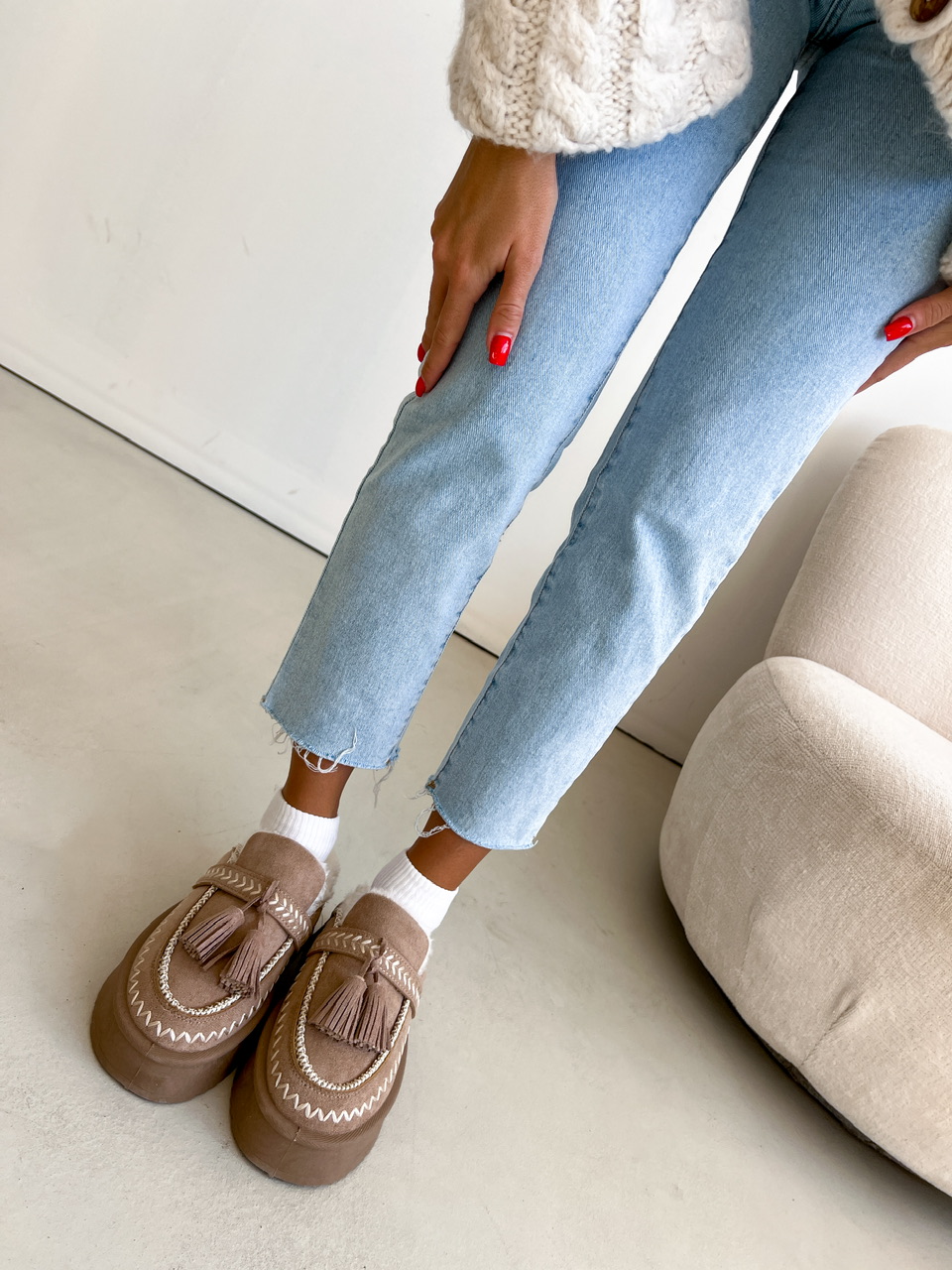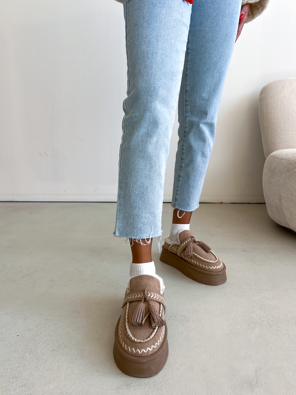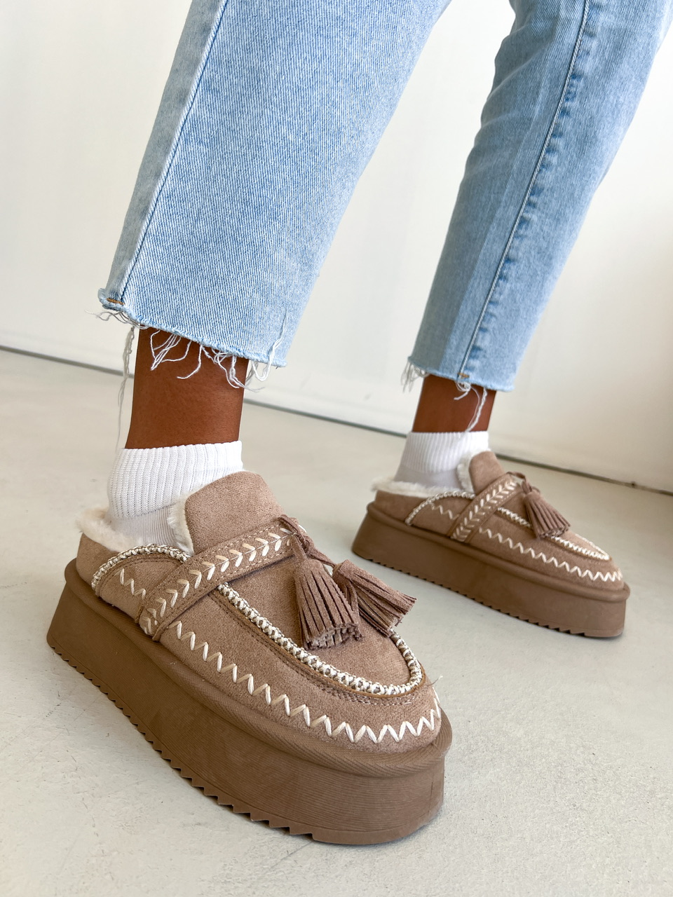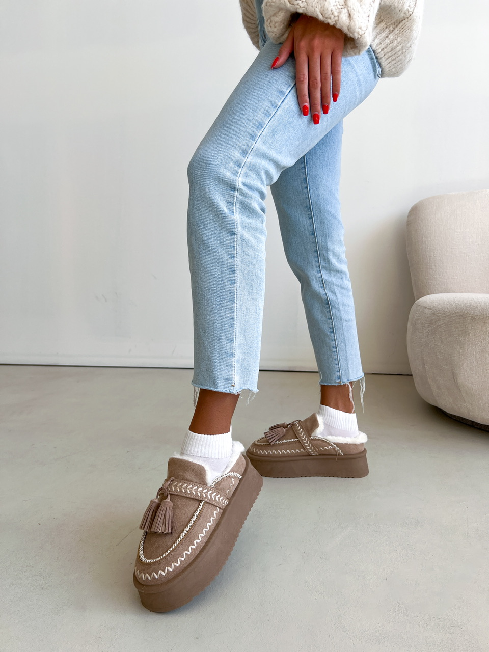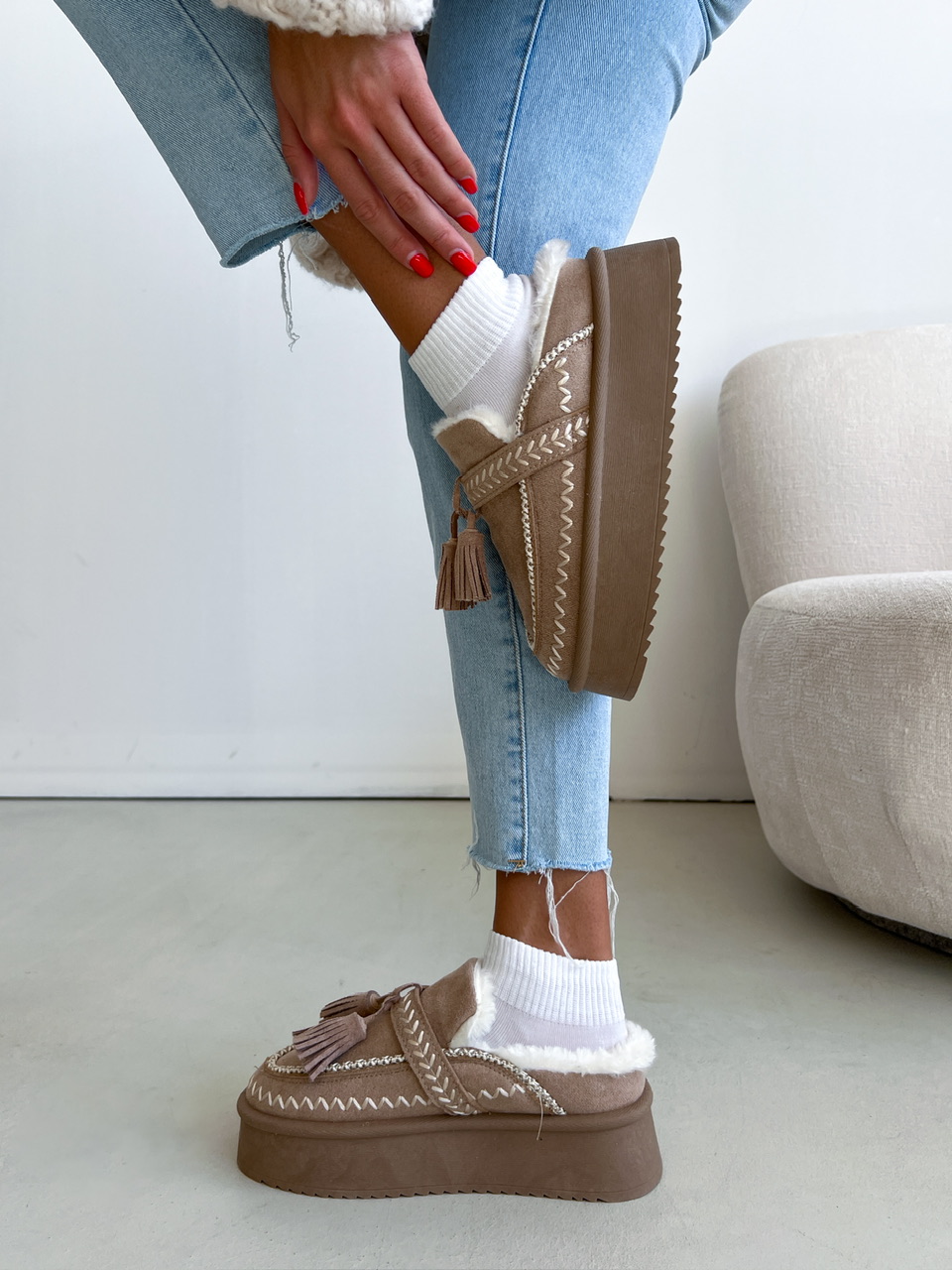 ZImná obuv na rovnej mierne vyvýšenej podrážke (cca 4 cm). Zvršok je semišového materiálu, zdobený okrasnými prvkami a prešitím.  Vnútorná časť je zateplená umelou kožušinkou.